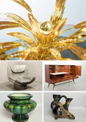 Mid-century modern design & curated vintage veiling met diverse meubilair, verlichting, vazen en decoratieve objecten
