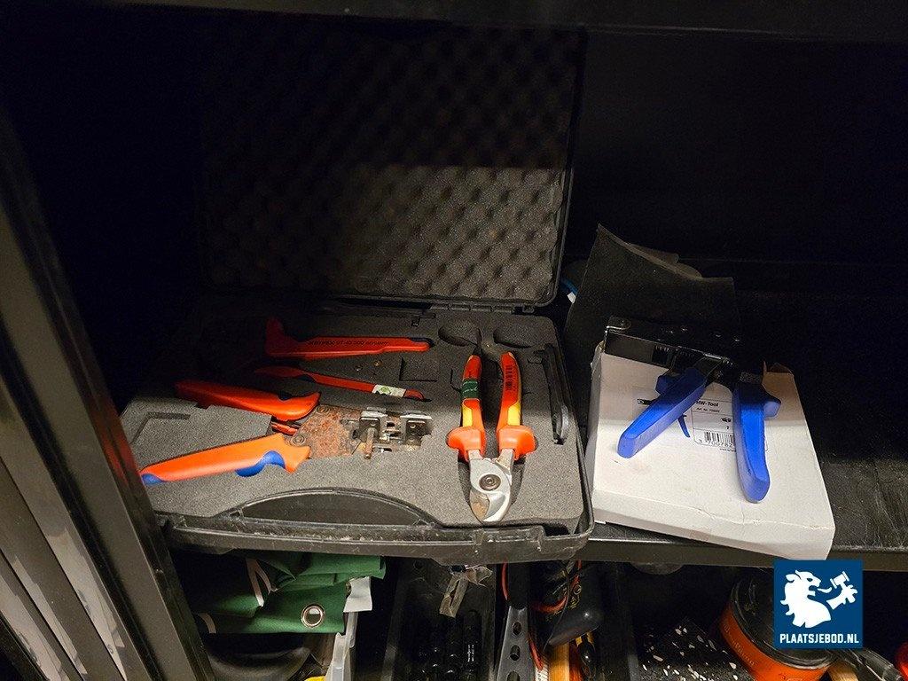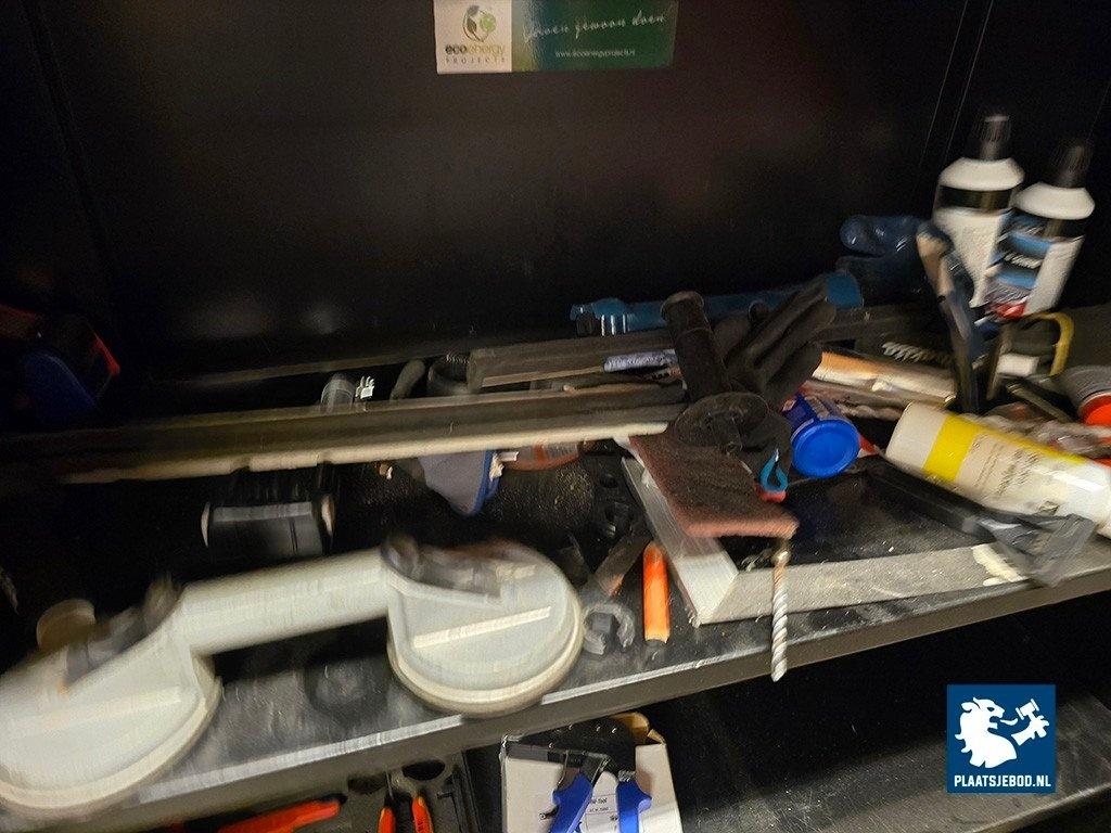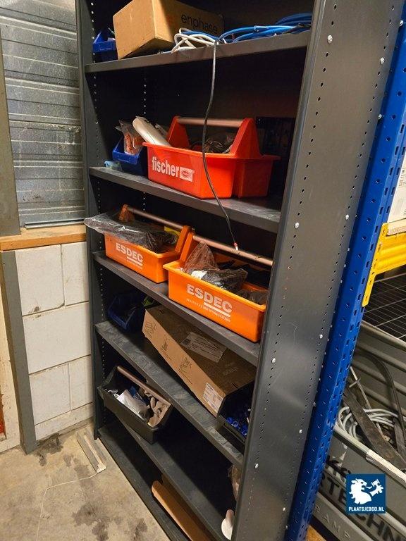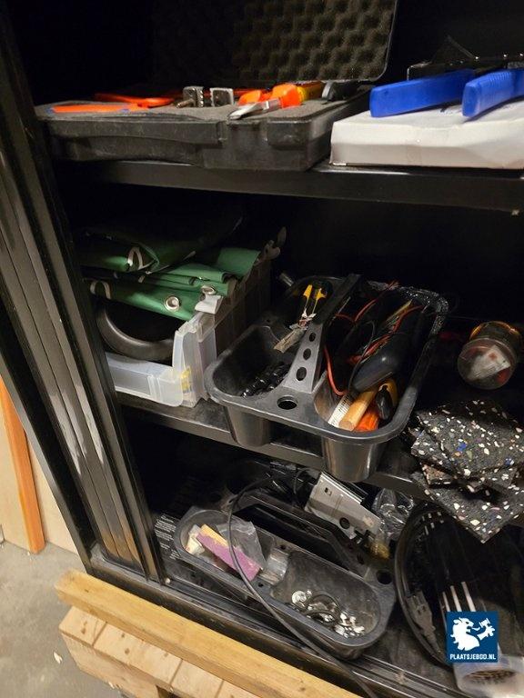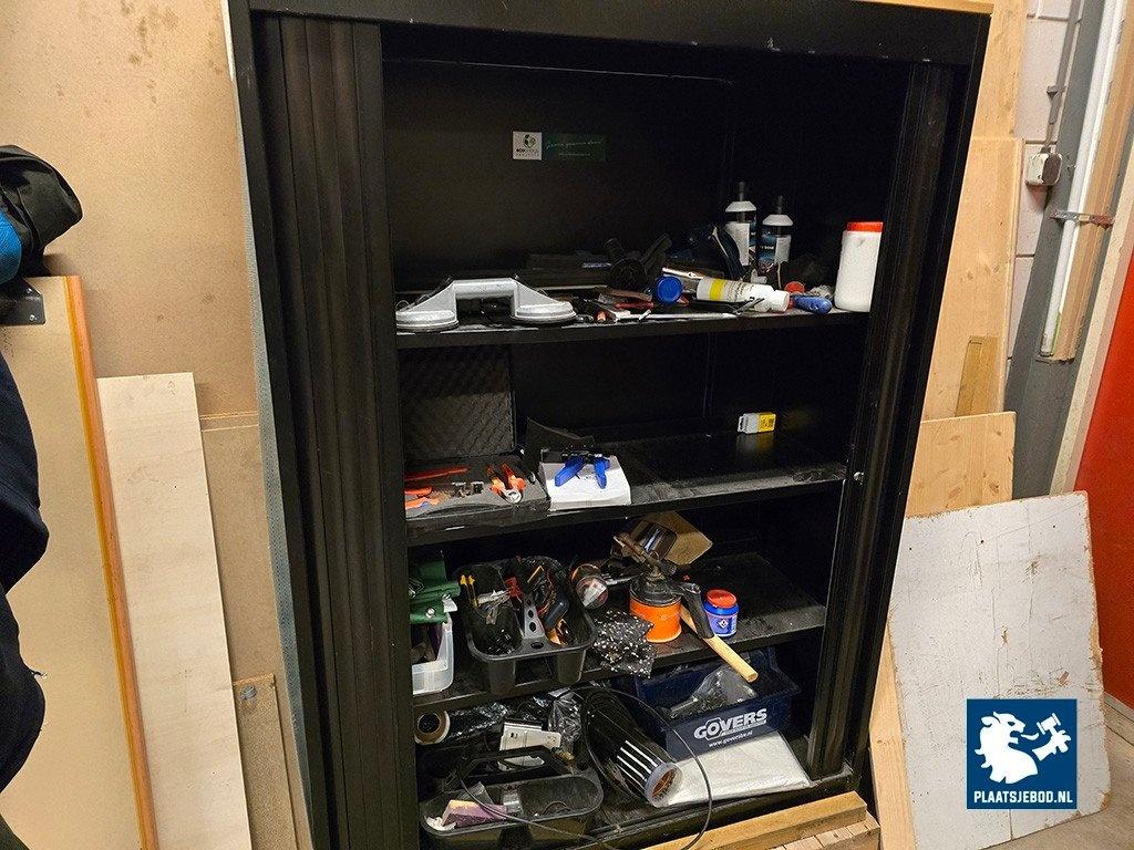 1 x Archiefkast en 1 x wandstelling met diverse inhoud waaronder gereedschappen
