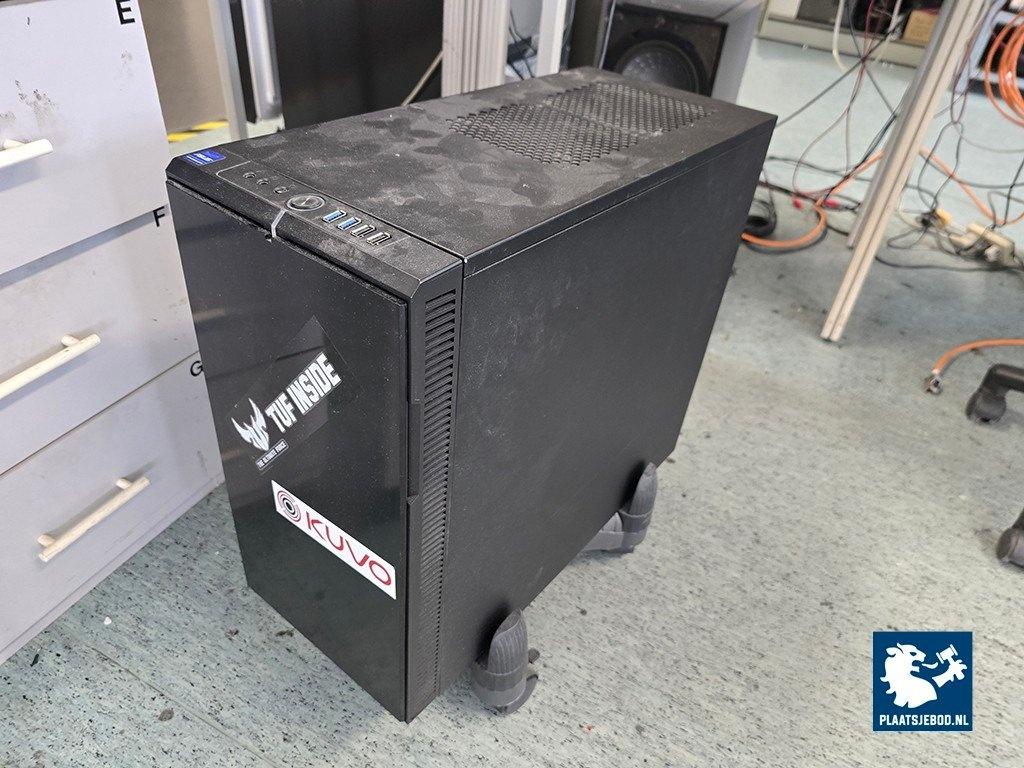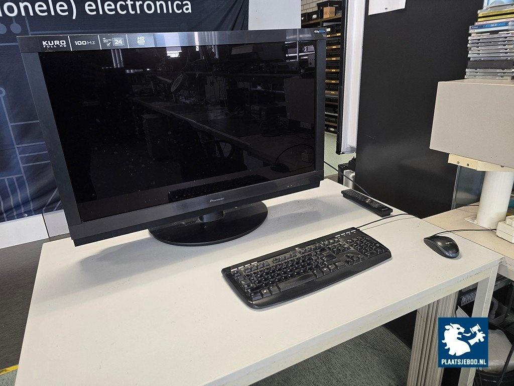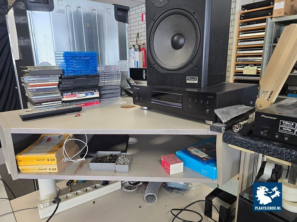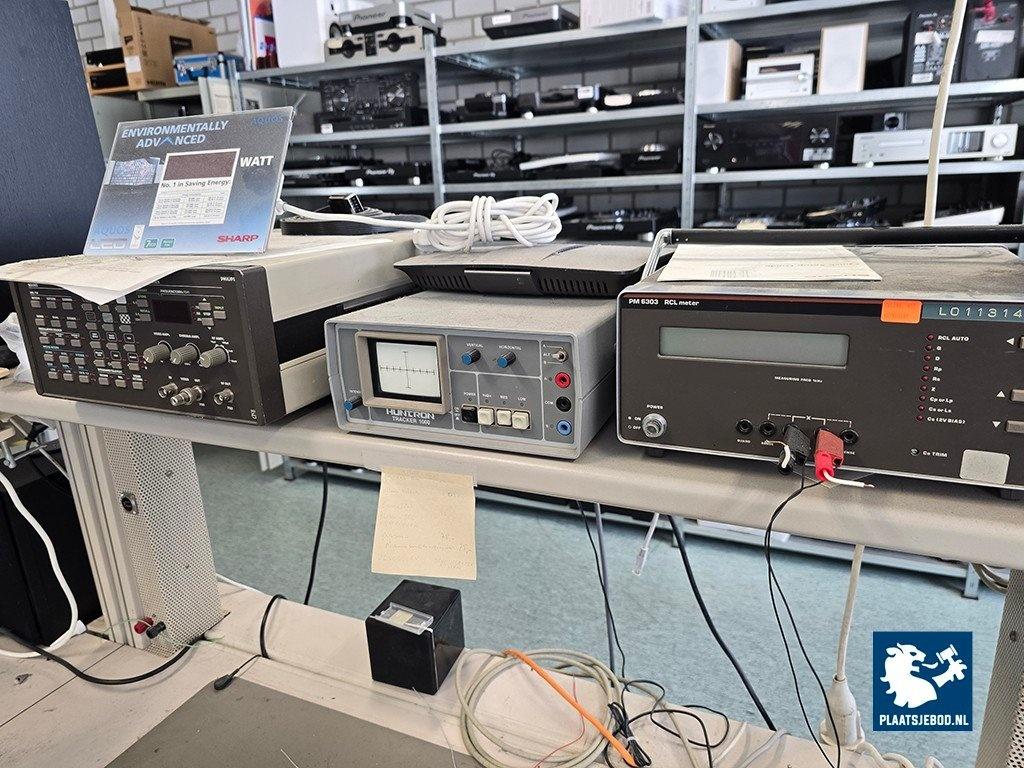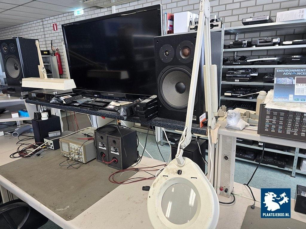 1 x Hoekopstelling met werktafels met opstand, bureaustoel, Asus Towermodel computer, Pioneer LCD scherm, Sharp monitor, diverse meet/ testapparatuur, etc.