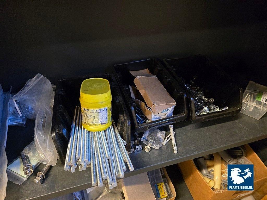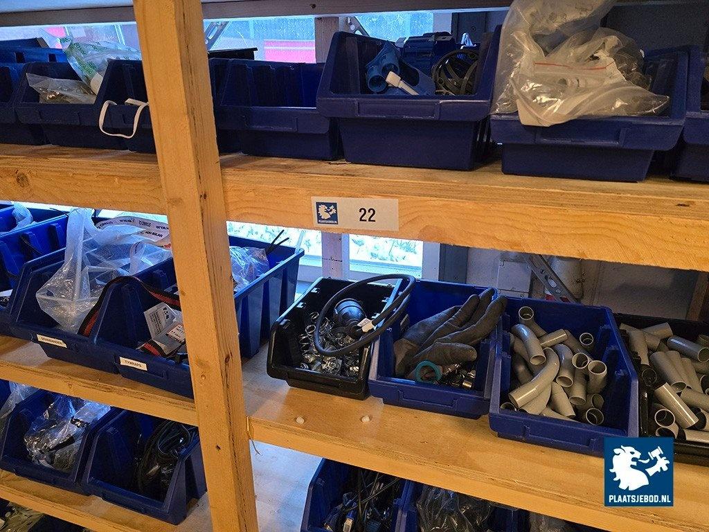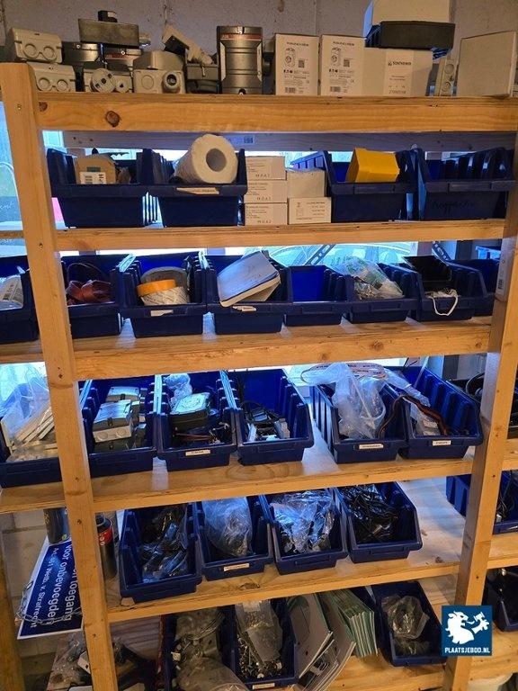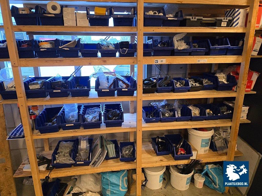 1 x Houten wandstelling met installatiemateriaal in grijpvoorraad bakken en stalen kast met diverse inhoud