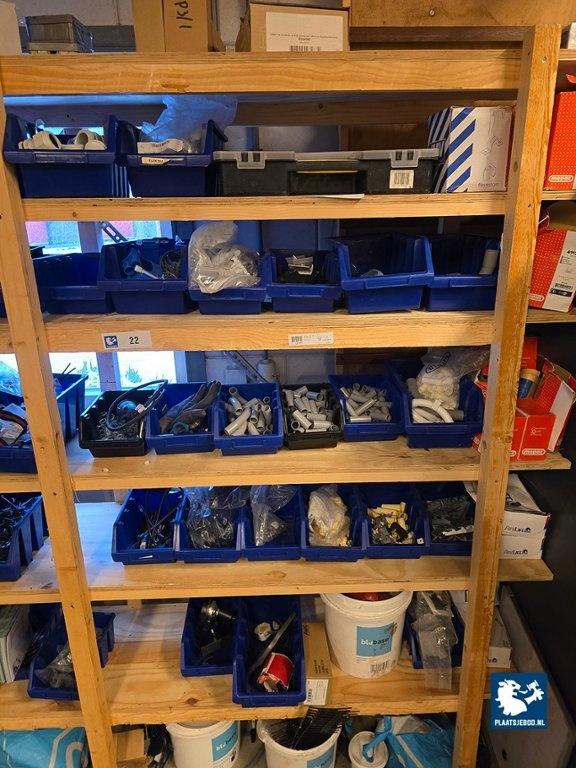 Lot 306-022: 1 x Houten wandstelling met installatiemateriaal in grijpvoorraad bakken