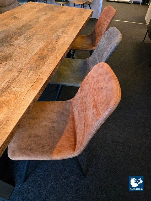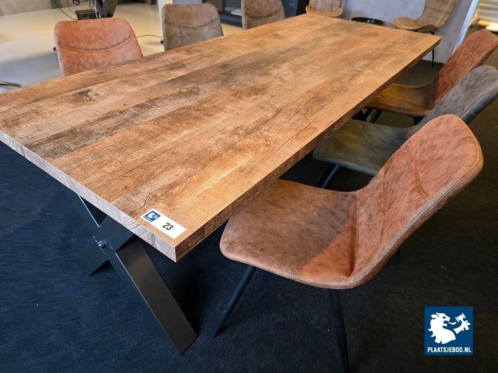 1 x Repro houten tafel ca. 240 x 100 cm met stalen kruisvoet en 6 x stoel