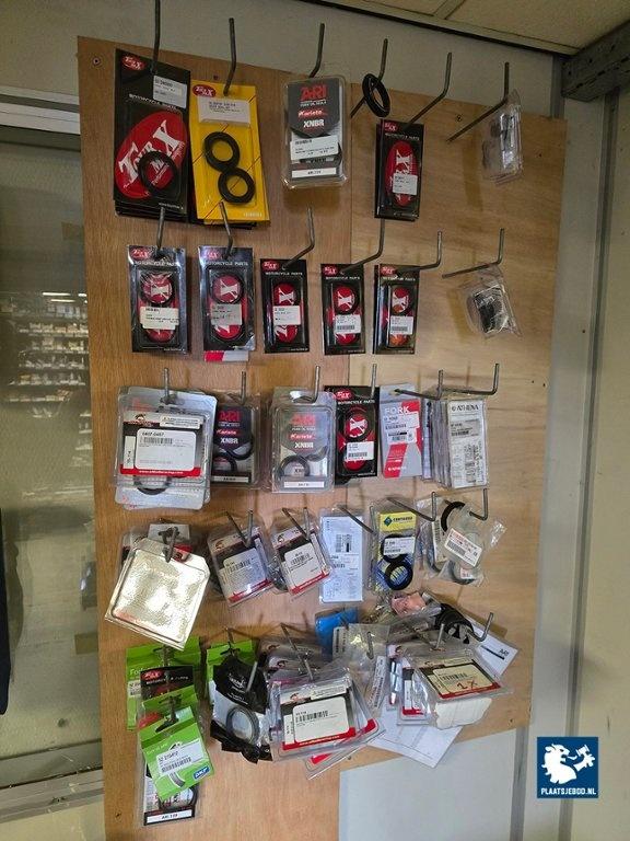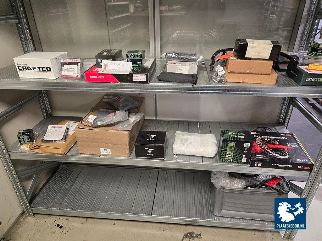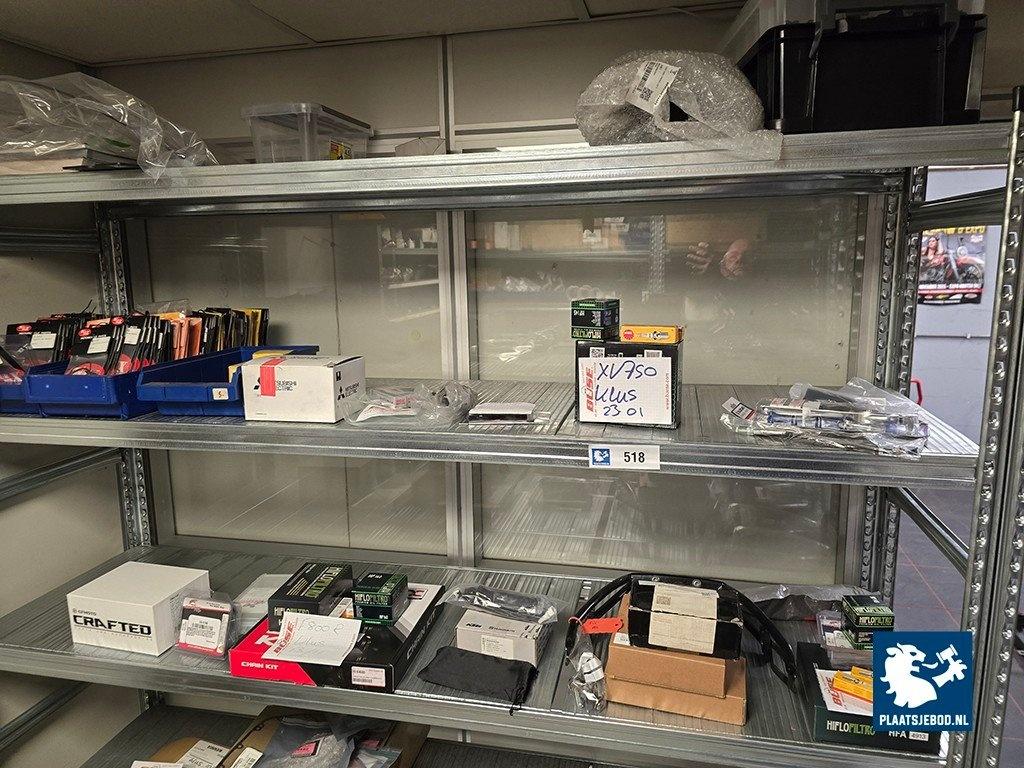 Lot 328-518: 1 x Sectie magazijnstelling, wandbord en bureau met diverse motoronderdelen, etc