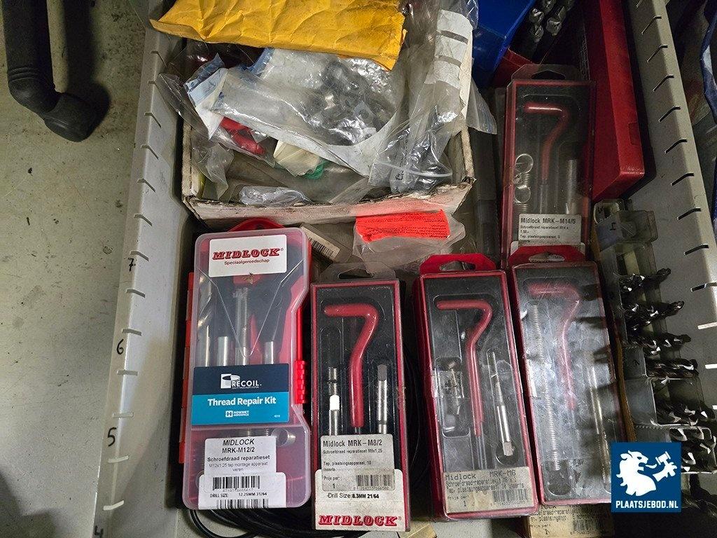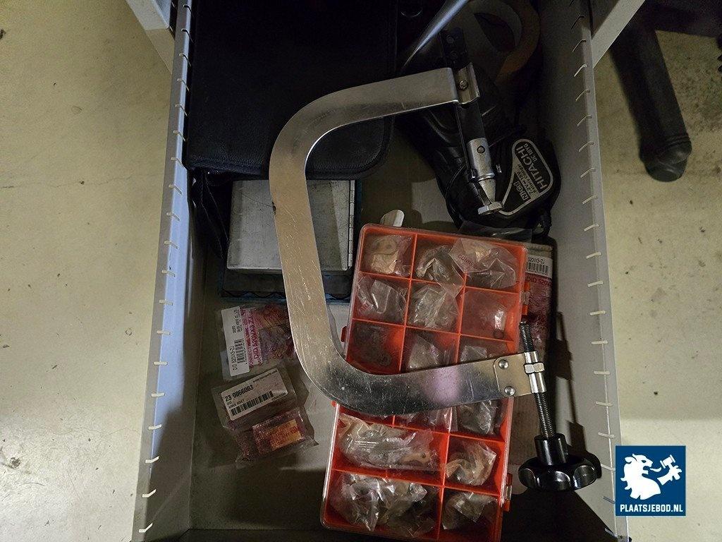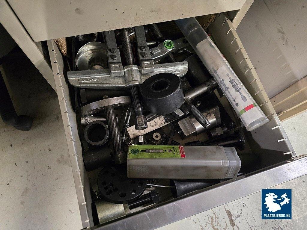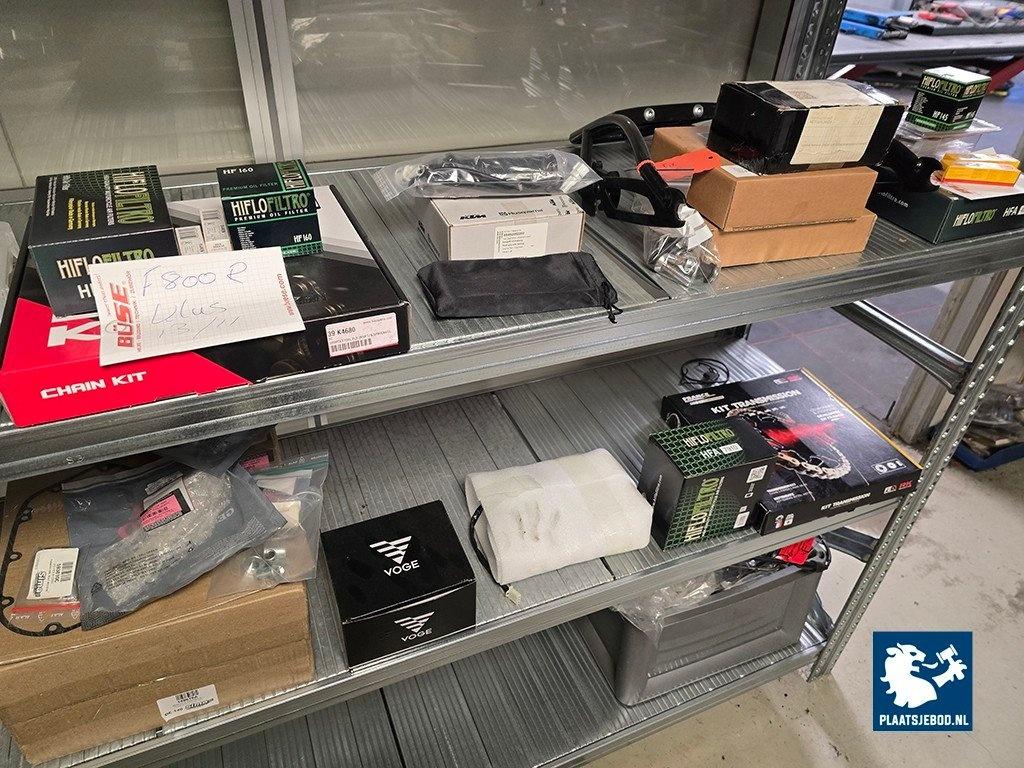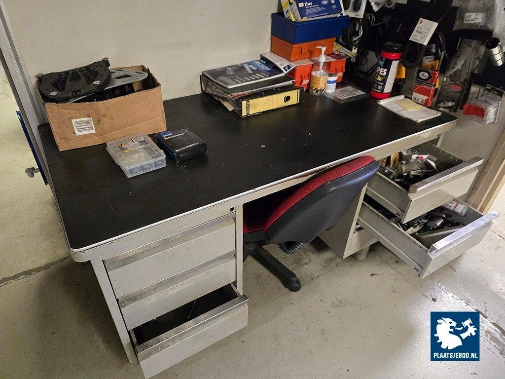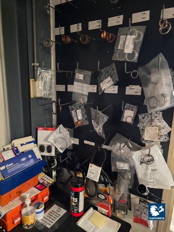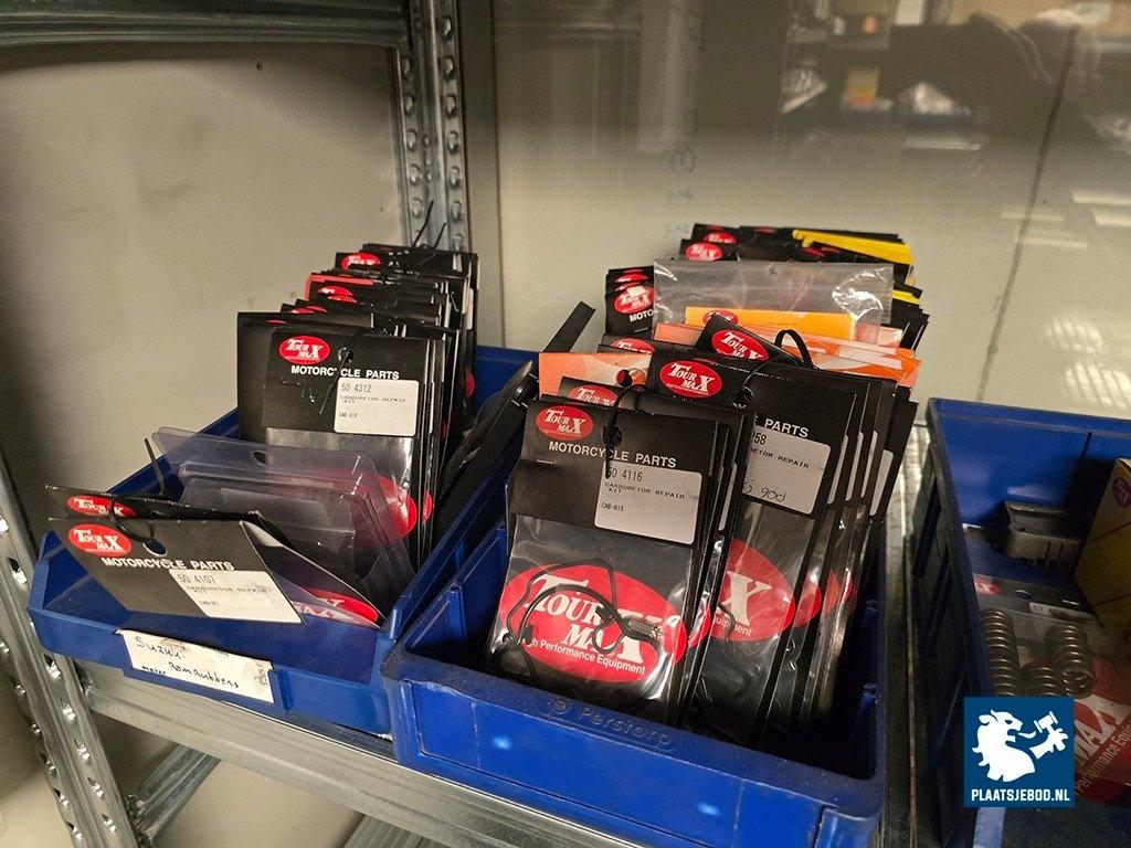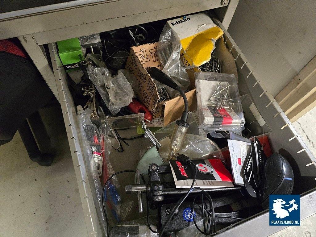 1 x Sectie magazijnstelling, wandbord en bureau met diverse motoronderdelen, gereedschappen, etc.