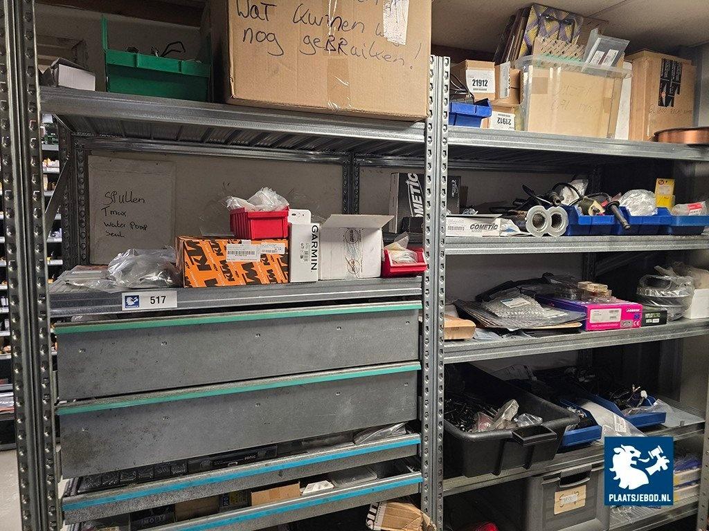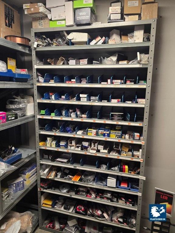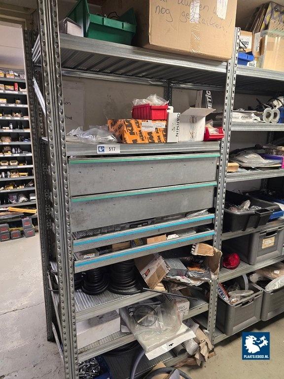 Lot 328-517: 2 x Sectie magazijnstelling en 1 x grijpvoorraadkast met diverse inhoud