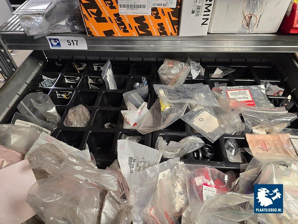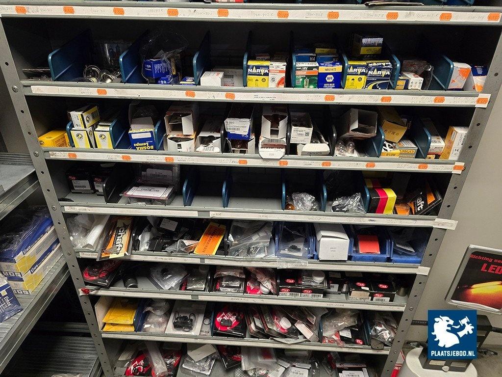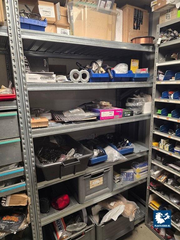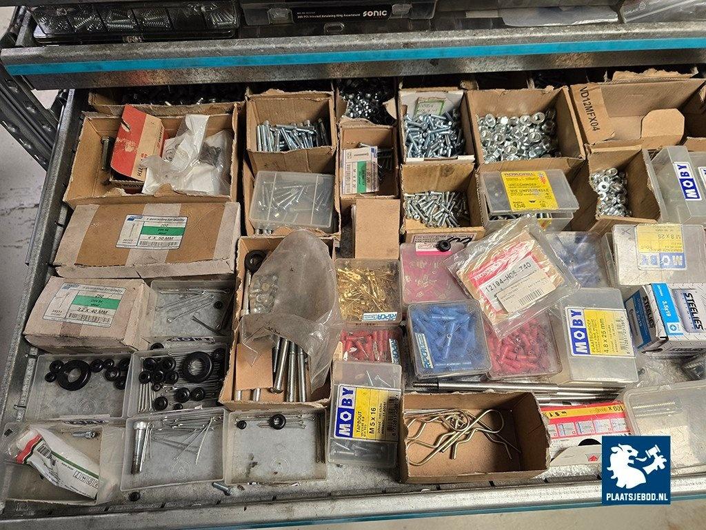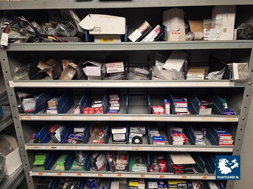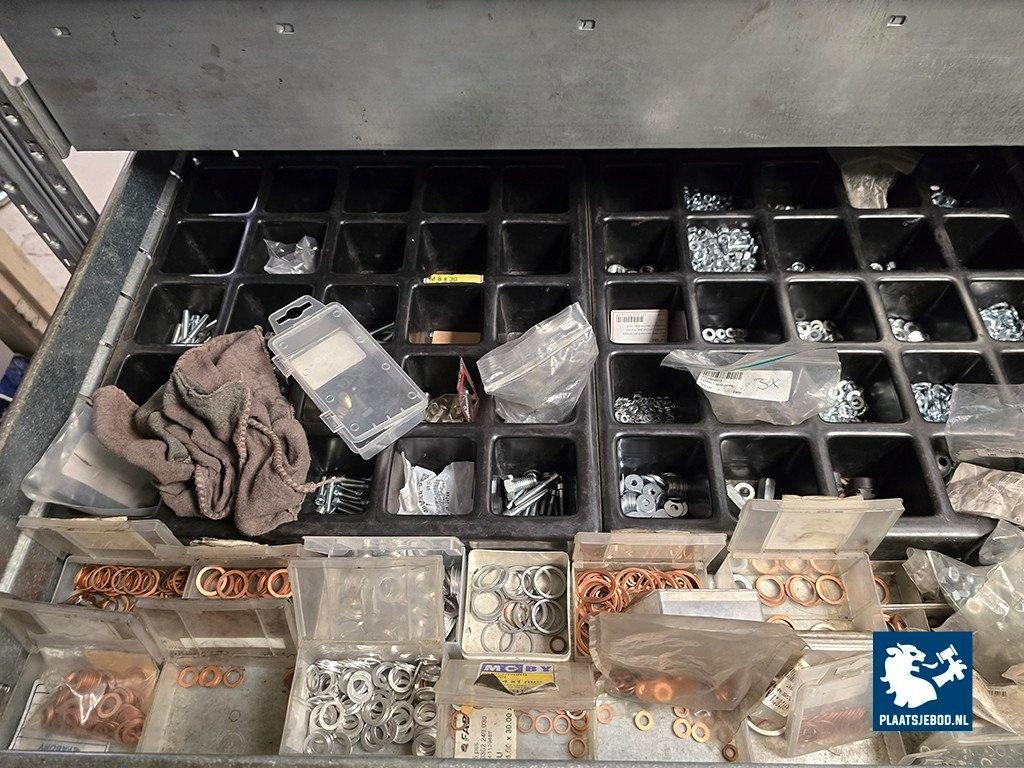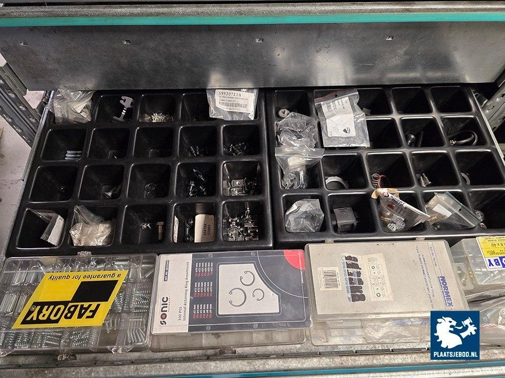 2 x Sectie magazijnstelling en 1 x grijpvoorraadkast met lagers, pakingen, ijzerwaren, zegerringen, etc.