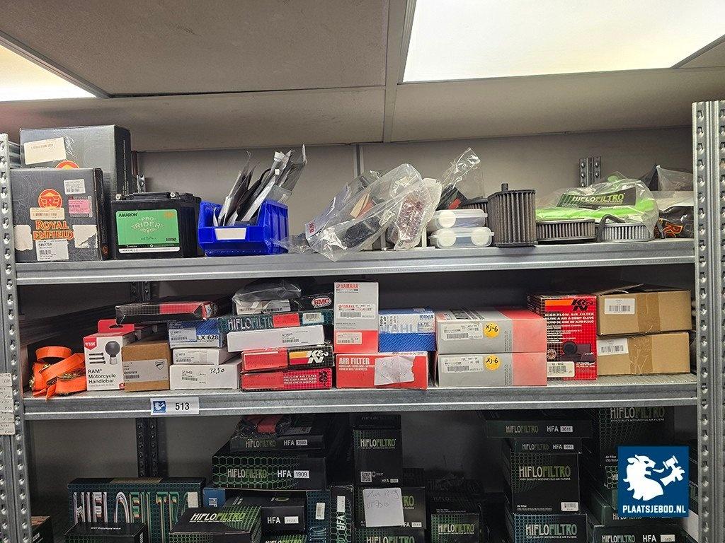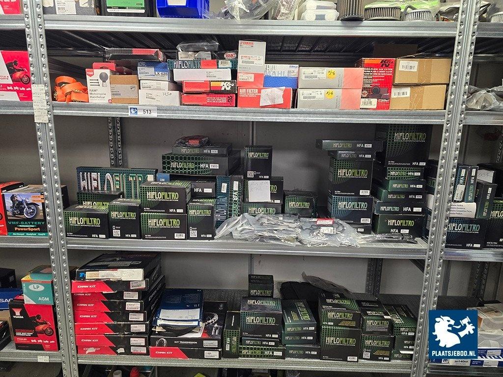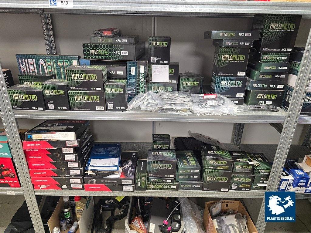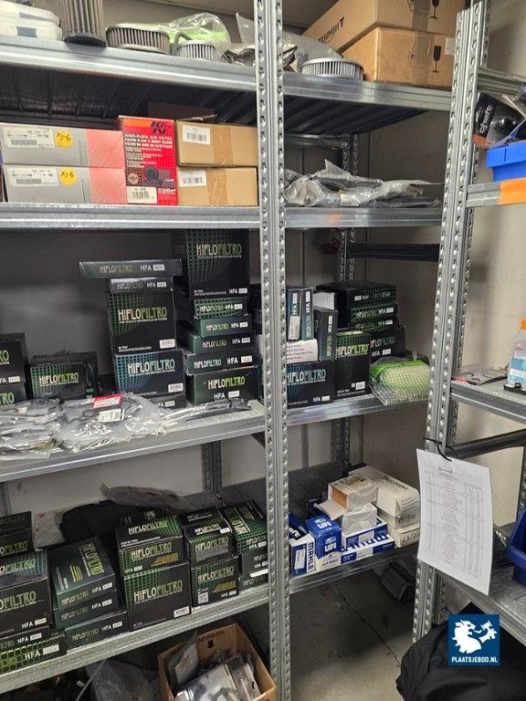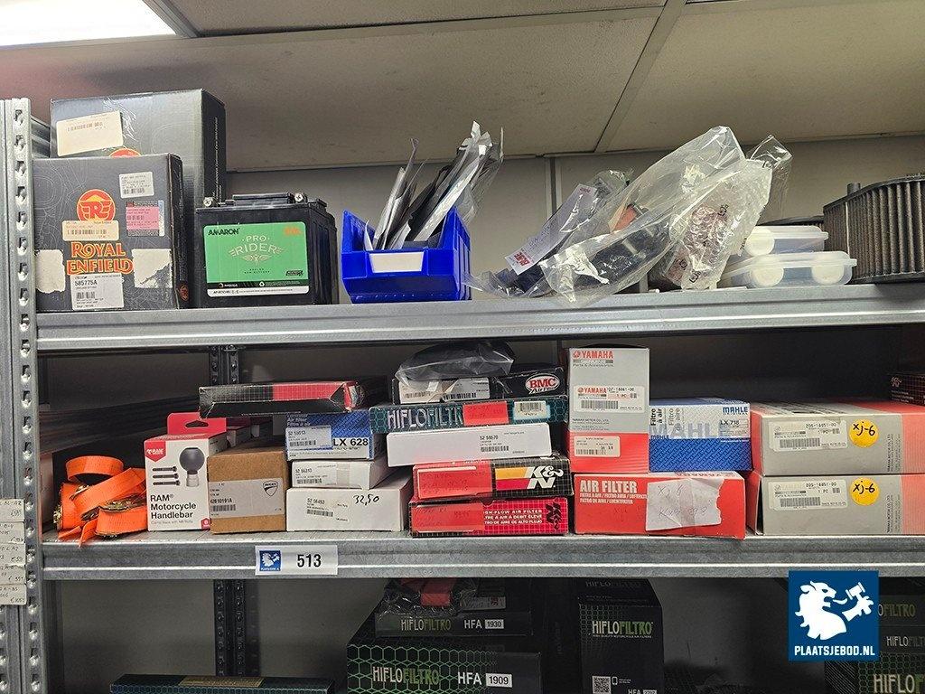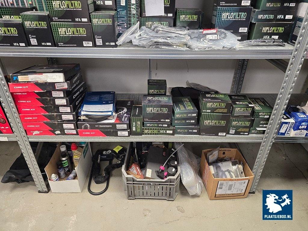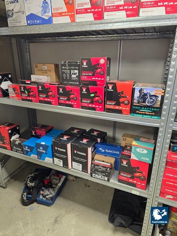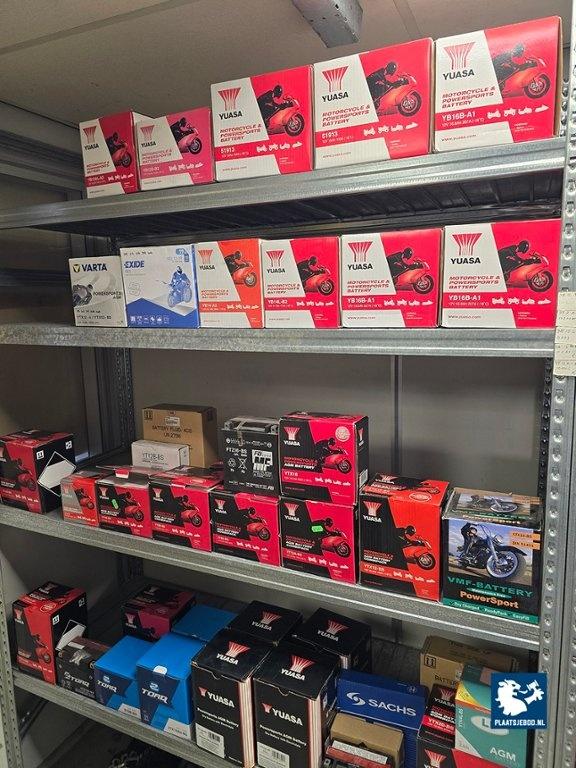 3 x Sectie magazijnstelling met diverse inhoud waaronder accu's, filters, kettingen, etc.