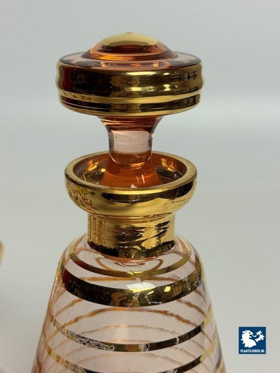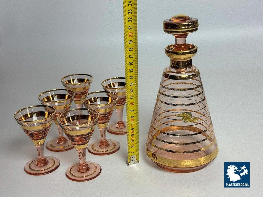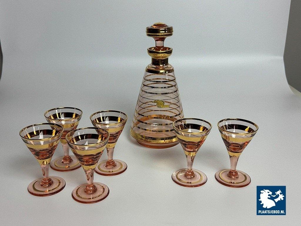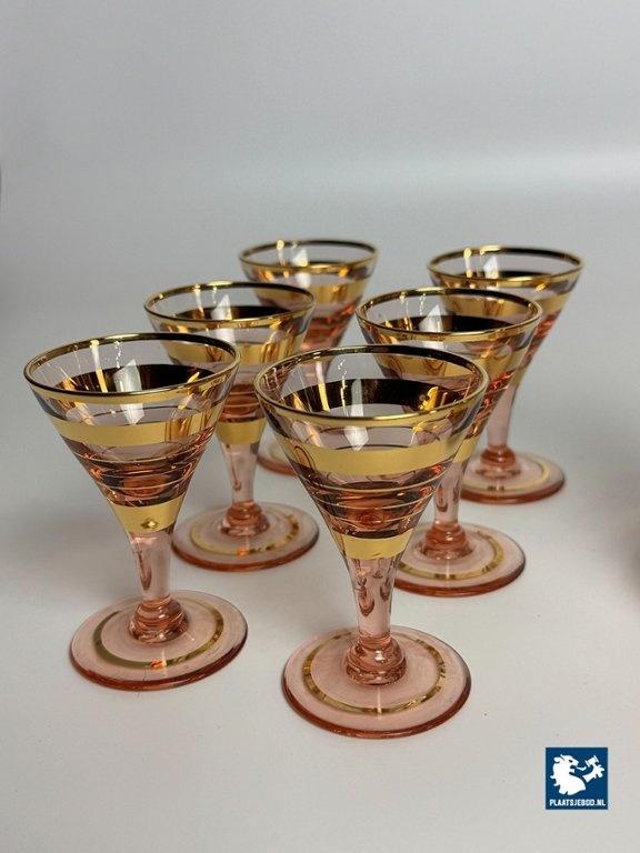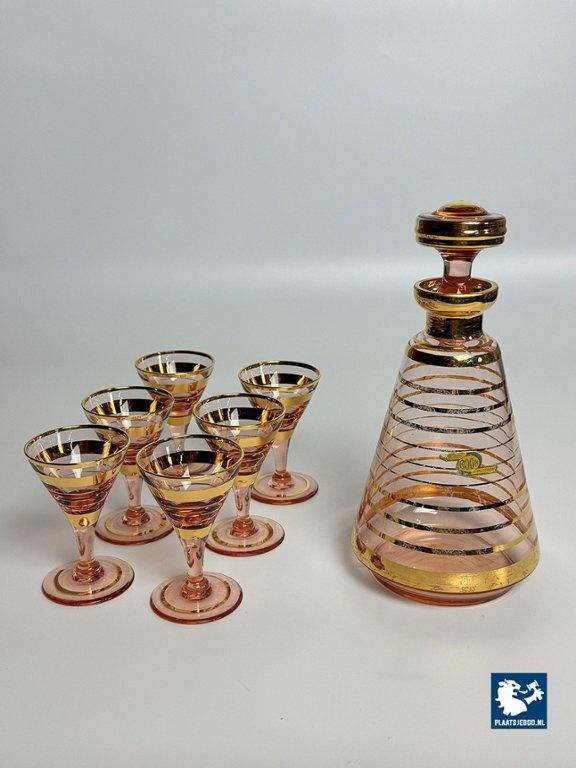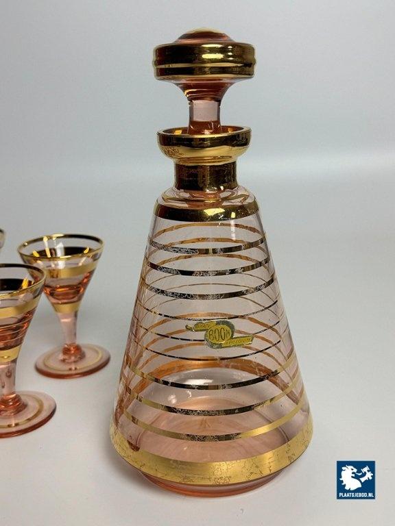 Lot 305-175-DA-014: Art-Deco Booms Glass Carafe Set with 6 Matching Glasses - Rose Opaline with Gilded Accents, Belgium, 1930s.