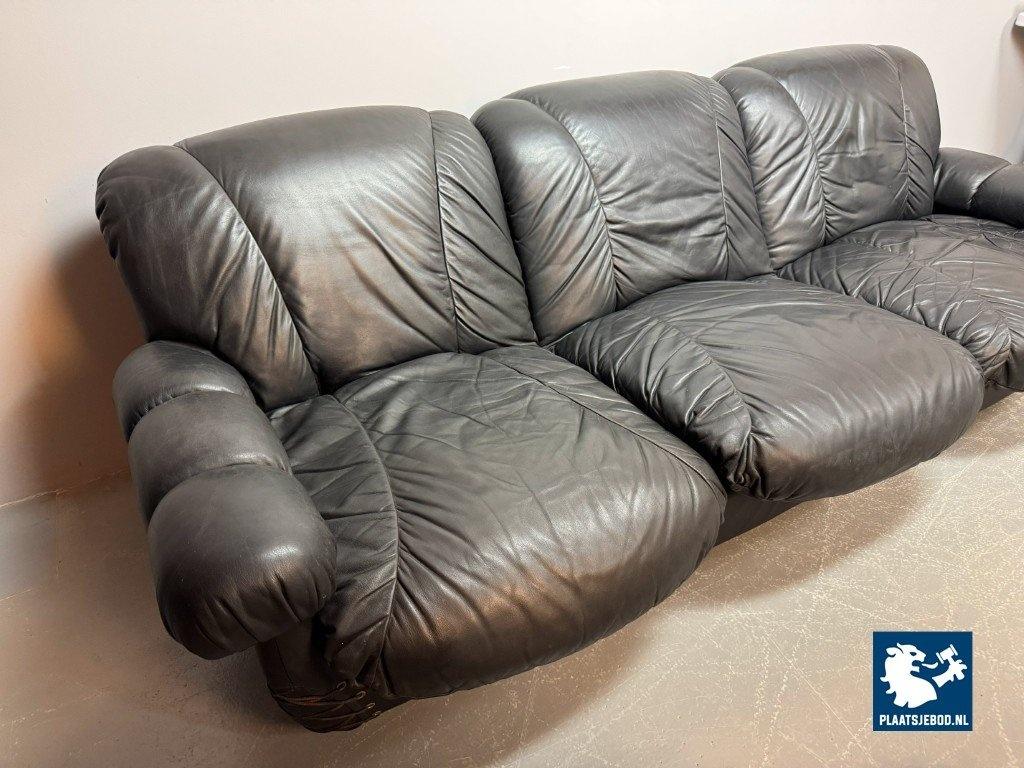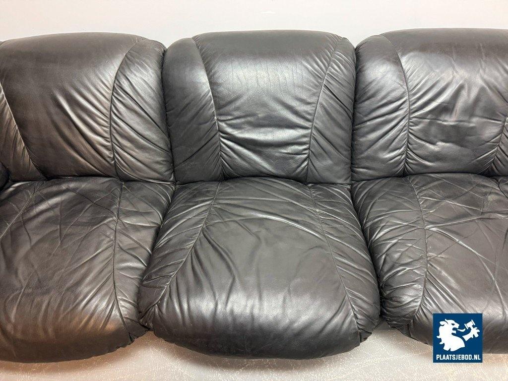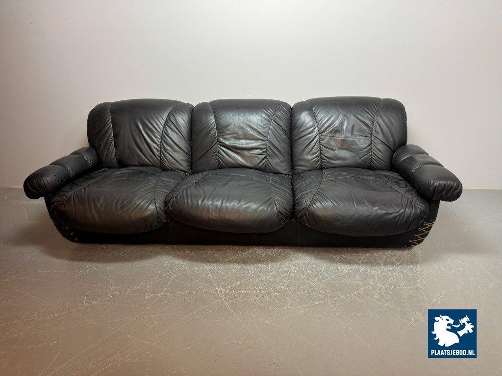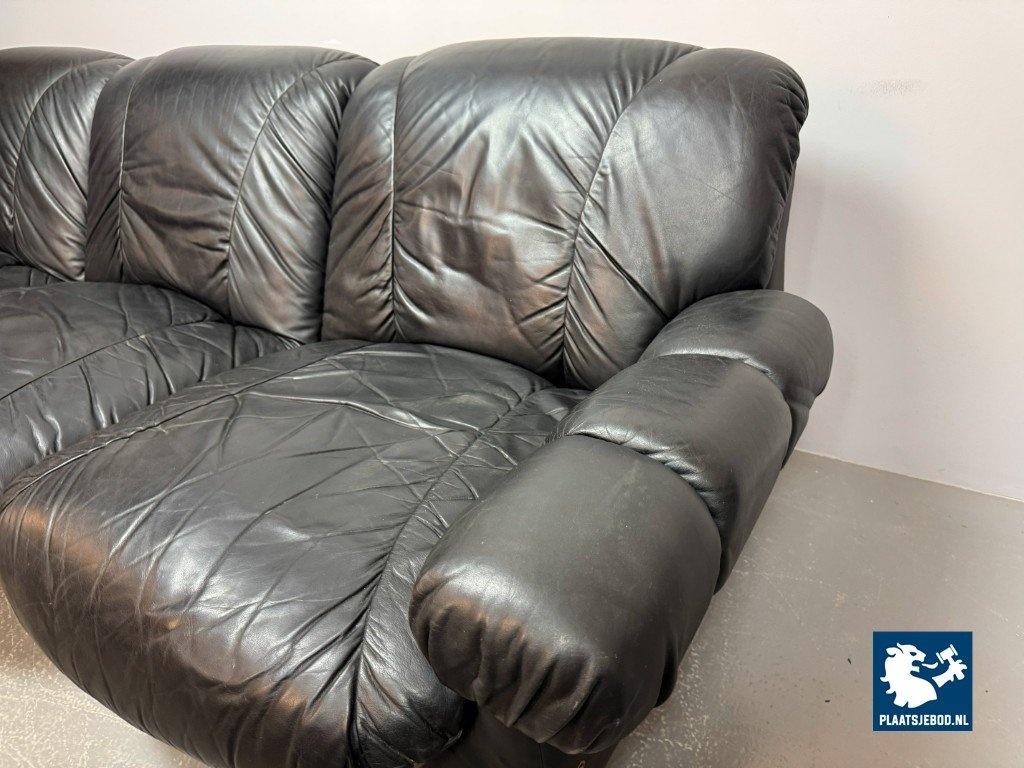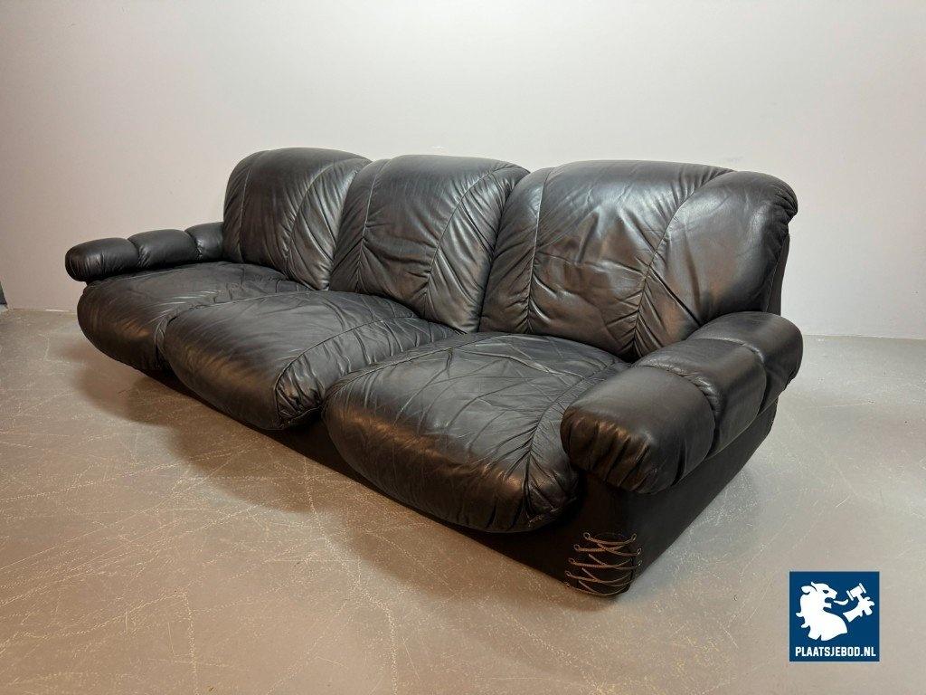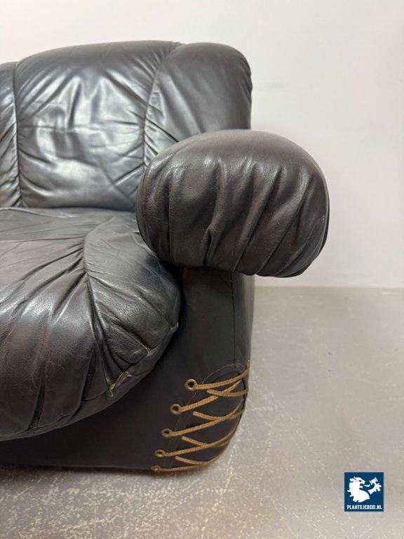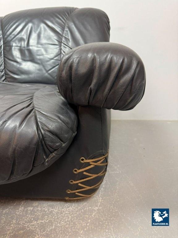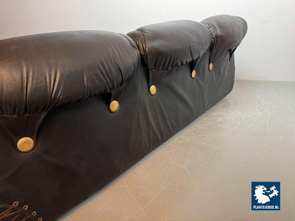 Lot 311-277-SS404-A2: Beautiful Big Black Leather Postmodern Italian Design Space Age 3-Seat Lounge Sofa with Brass Buttons and Playful Cord Lacing, Germany 1970s.
