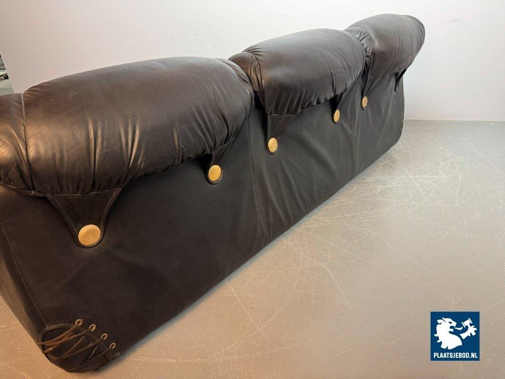 Bold three-seat sofa upholstered in black leather, featuring distinctive cord lacing at the corners and brass button detailing on the backrest. Designed in the spirit of Italian Postmodernism, with stylistic references to Arrigo Arrighi for Busnelli. Generous proportions and comfortable seating are combined with expressive detailing, making this sofa both functional and sculptural. A strong statement piece for a design-driven interior. Dimensions: Height 72 cm, Width 225 cm, Depth 100 cm, Seating Height 38 cm, Arm Rests 45 cm
