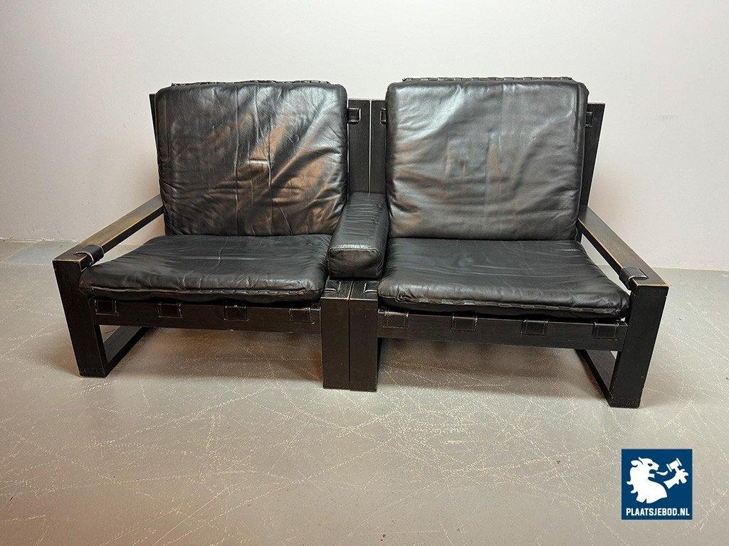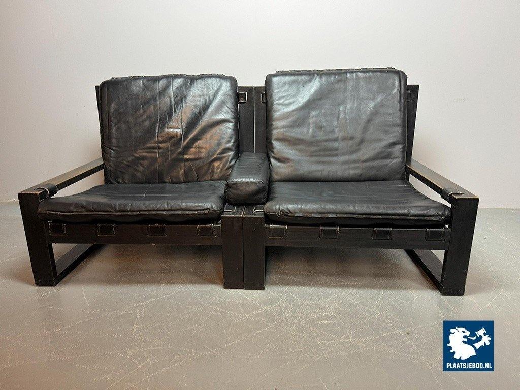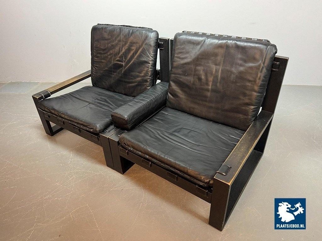 The Brutalist character is expressed through the bold proportions, honest materials and strong geometric lines. Both wood and leather display a beautiful natural patina, enhancing the authenticity and depth of the set. Very well preserved and offering excellent seating comfort. A rare and highly sought-after Brutalist ensemble. Dimensions: Height 85 cm, Width 82 cm (each), Depth 75 cm, Seating Height 30 cm, Arm Rests 39 cm