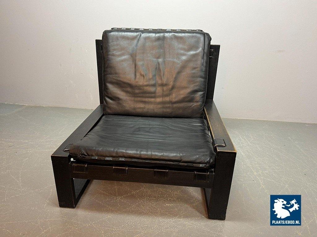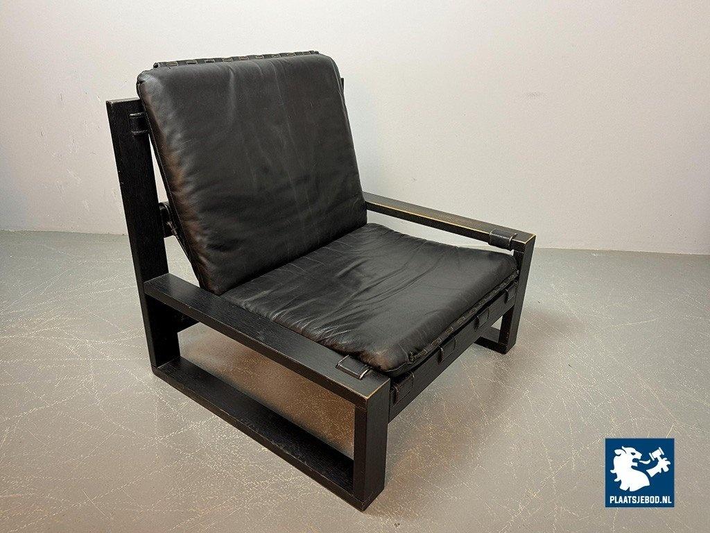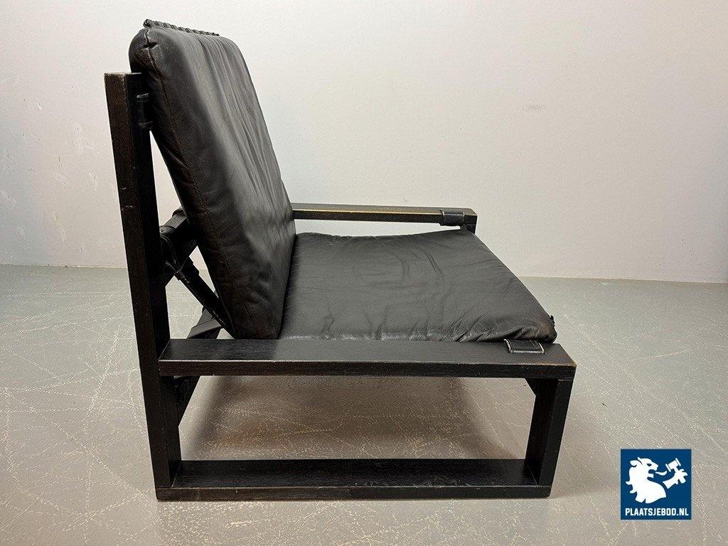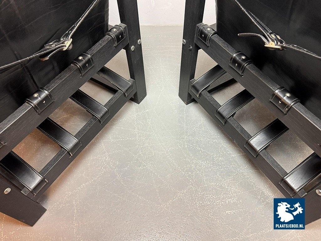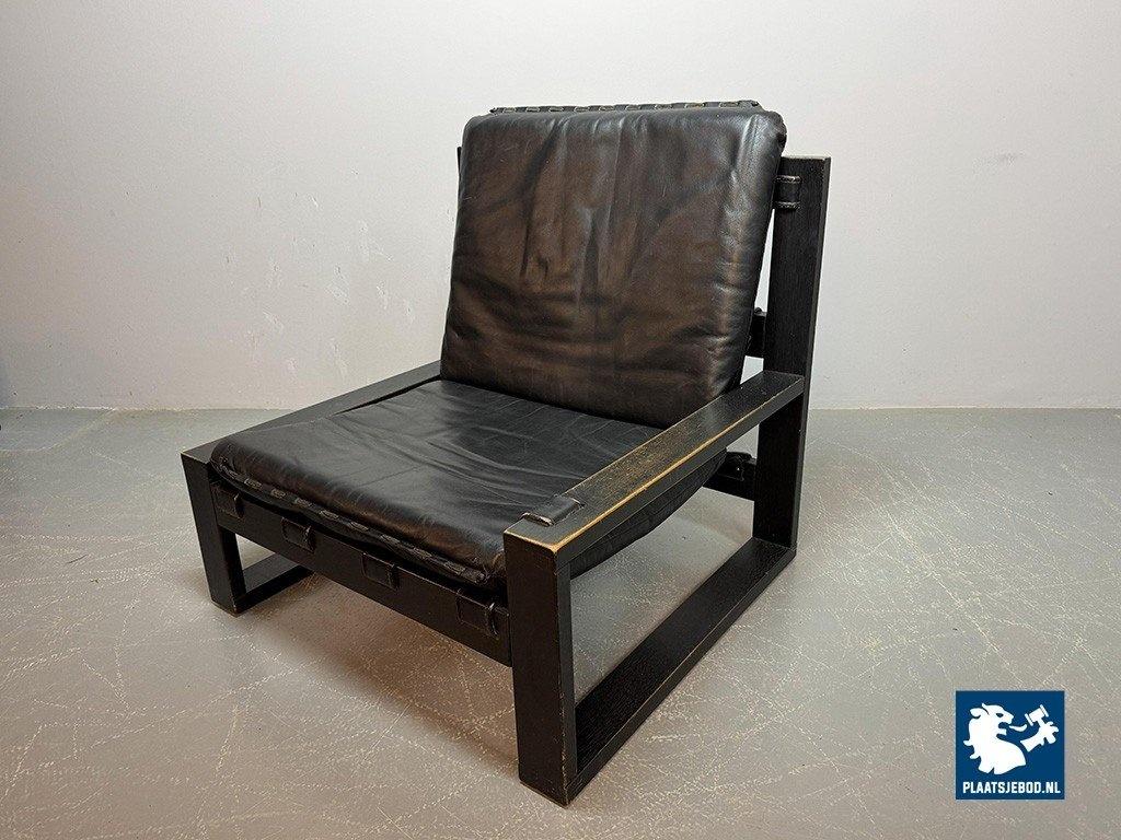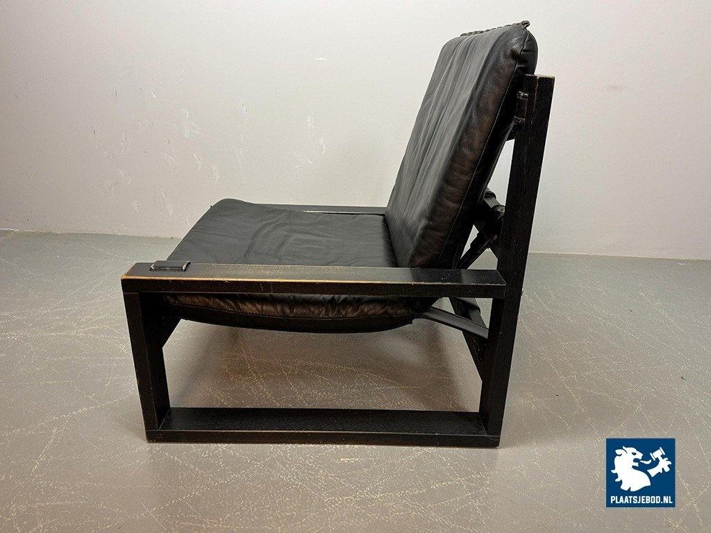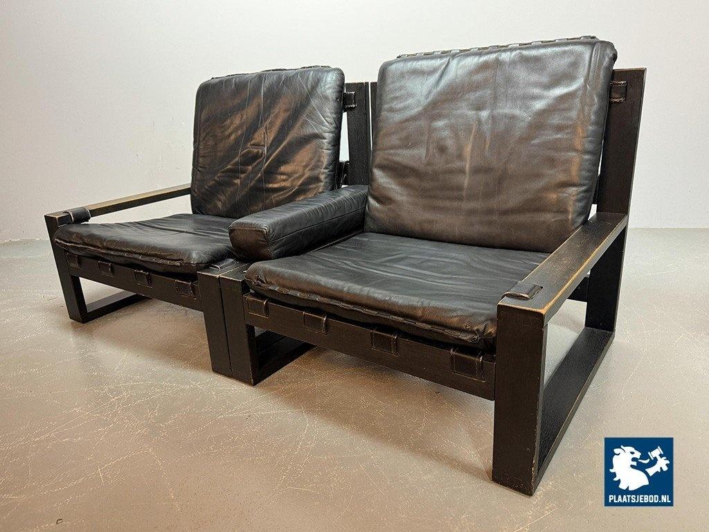 Lot 305-117-CH333-A3: Beautiful Mid-Century Set of 2 Black Leather Brutalist Lounge Chairs with Black Wooden Frame, Designed by Sonja Wasseur. The Netherlands, 1970s.