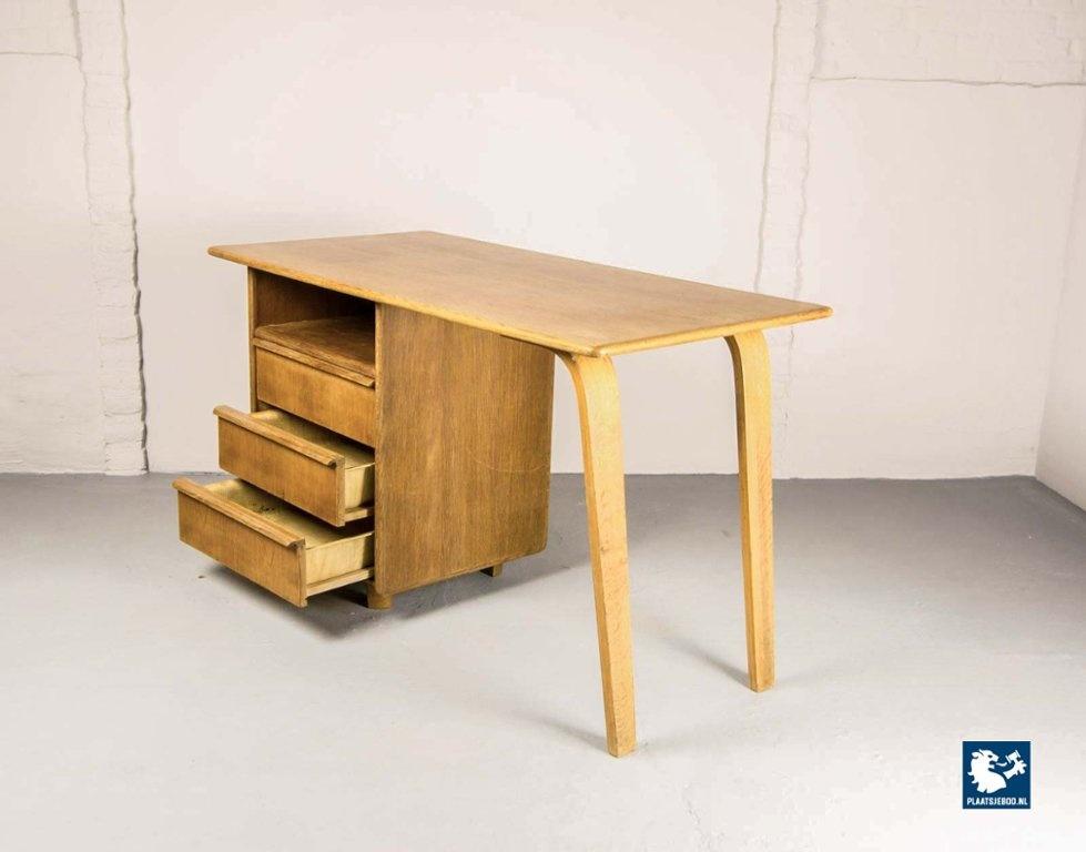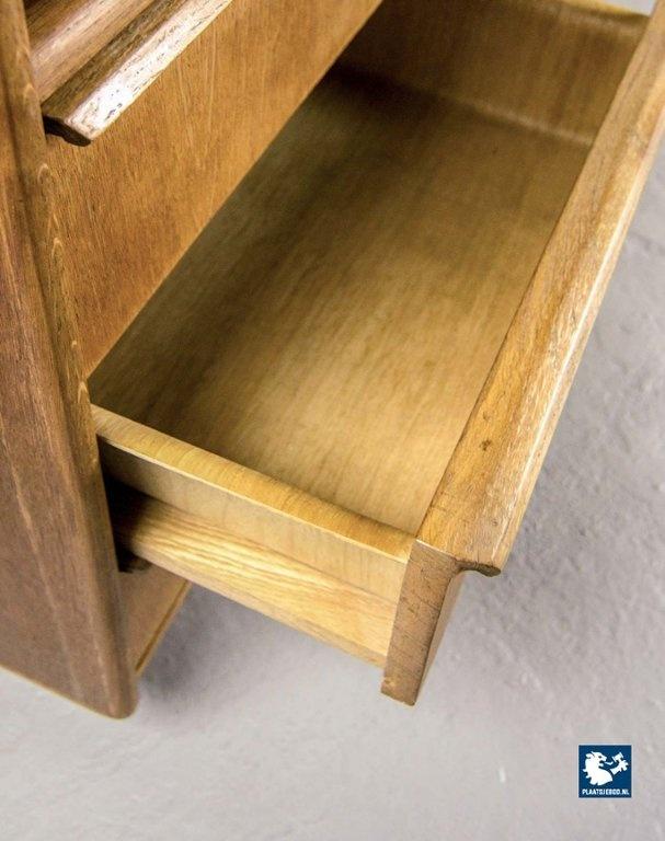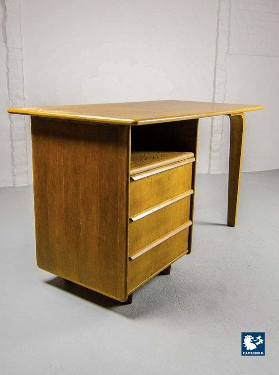 This Dutch Design ‘EE02’ desk from the Oak Series was designed by Cees Braakman in 1948 and produced by Pastoe, The Netherlands. It is made from oak and has plywood legs. It contains three anti-dust drawers and a shelf on the left. The working surface shows a small visible restoration, but the whole desk is in good vintage condition with patina and wear related to age and use. Dimensions: Height: 75 cm, Width: 125 cm, Depth: 65 cm, Quantity: 1