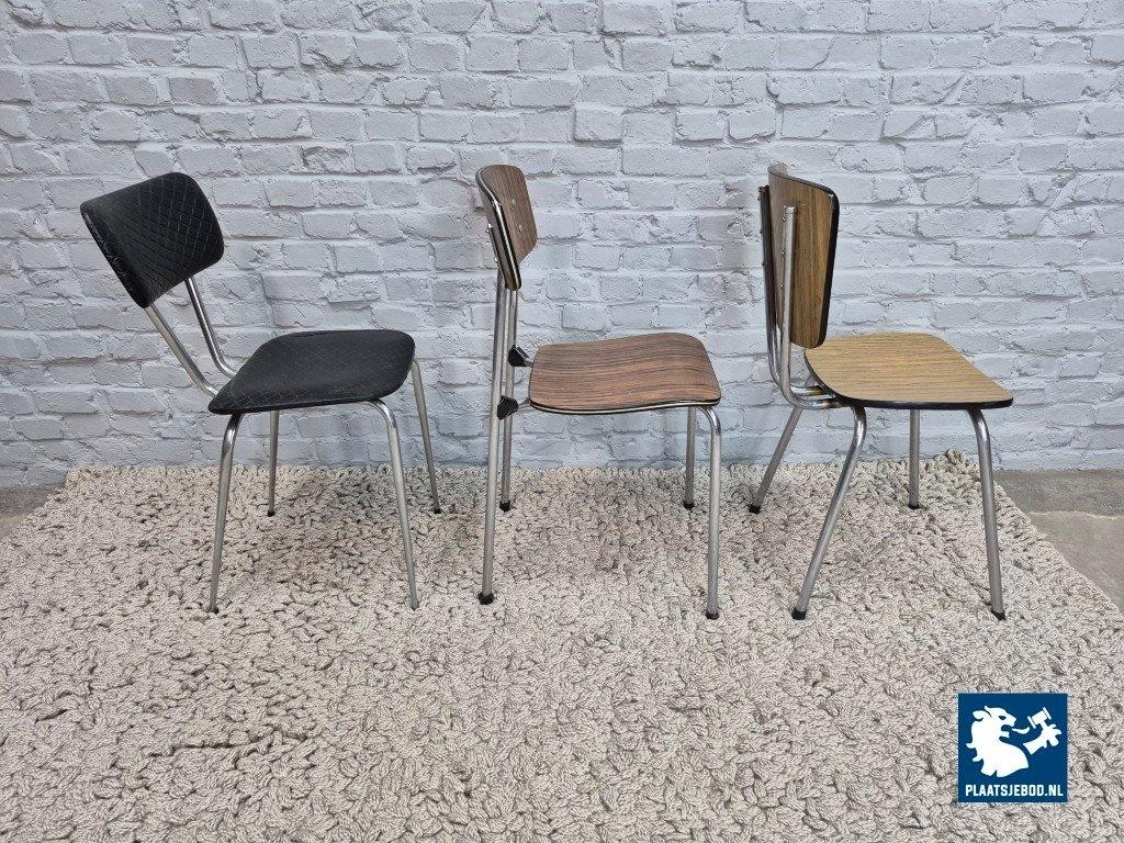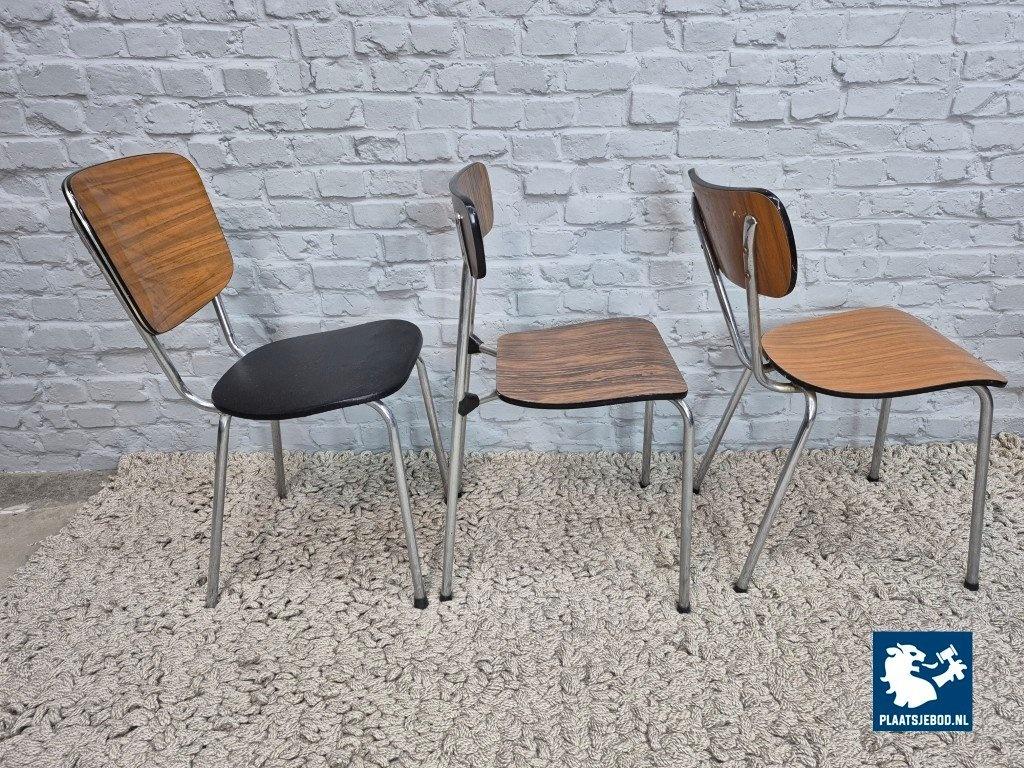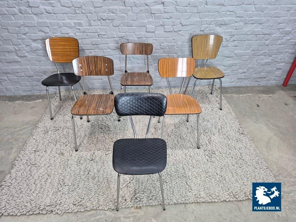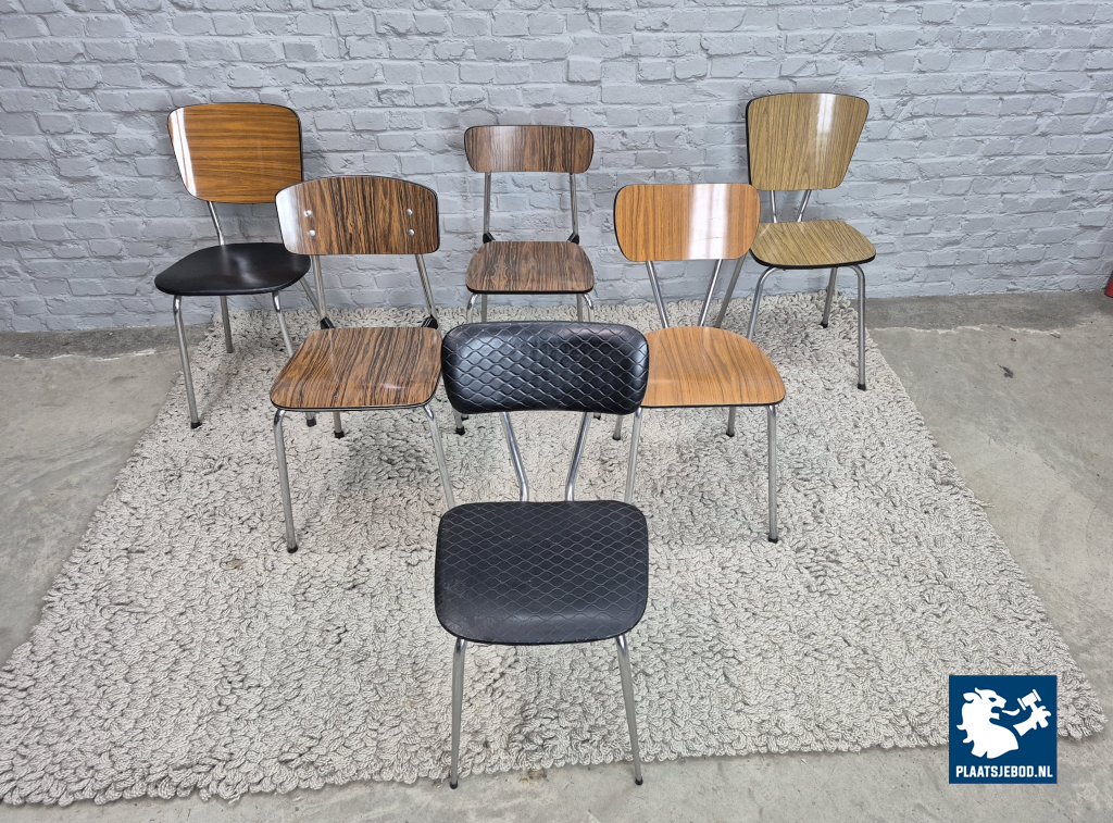This is a lively and well-balanced mixed set of six vintage Brabantia kitchen chairs, combining different wood-grain Formica finishes with a striking black leatherette example. Although each chair has its own character, together they form a surprisingly harmonious and cheerful ensemble.