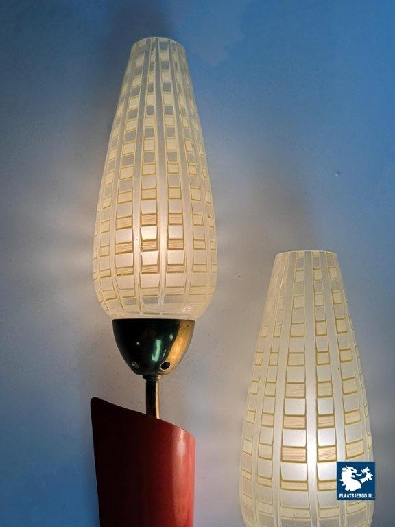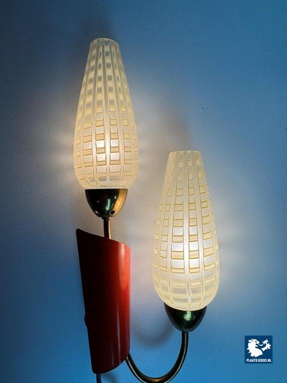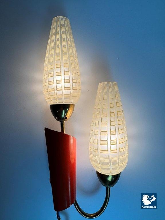 Lot 305-188-WL035: Double Wall Sconce with Graphic Design Decorated Glass Candle Shaped Shades in Brass Frame with Red Accent, Europe 1950s.