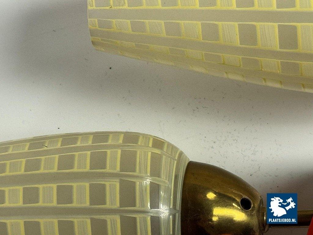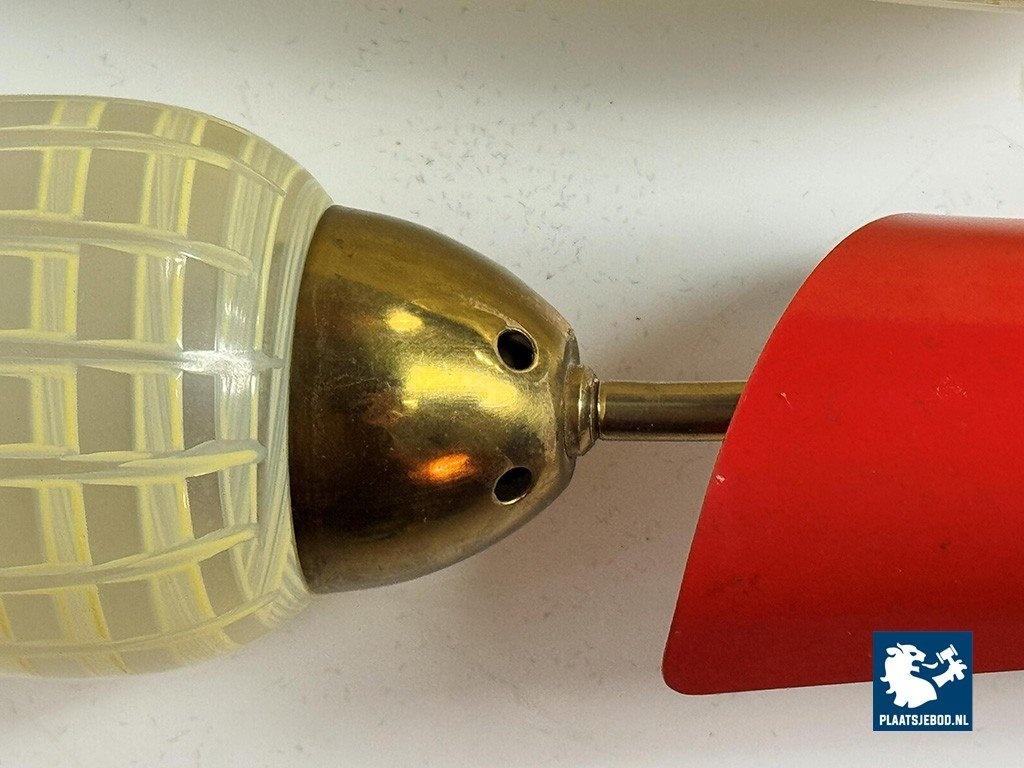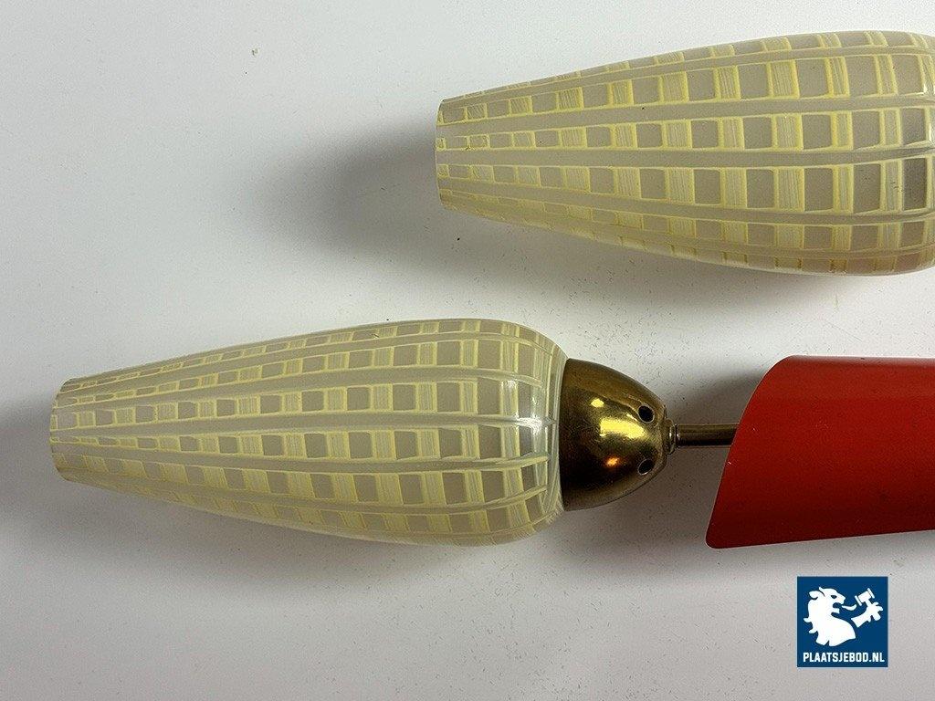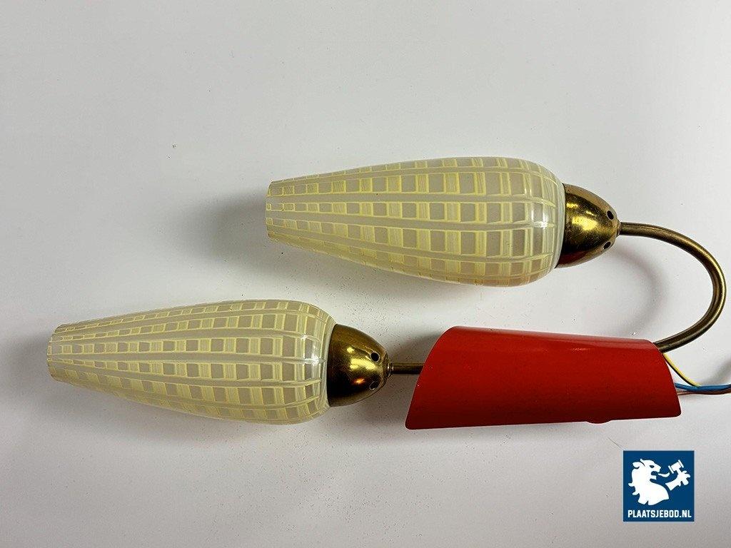 Double Wall Sconce with Graphic Design Decorated Glass Candle Shaped Shades in Brass Frame with Red Accent, Europe 1950s. The sconce is featuring hand-painted yellow checked glass shades combined with playful red metal caps and brass armatures. The shades are mounted at slightly different heights, creating a dynamic and decorative wall composition. The lamps emit a warm, atmospheric light and are fully functional, retaining their original character and finish. Dimensions: Total height 42 Total width 40, Shade: Height 20 Diameter 8 cm