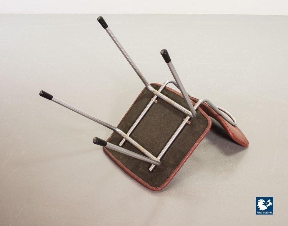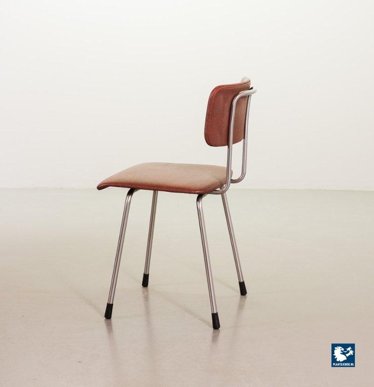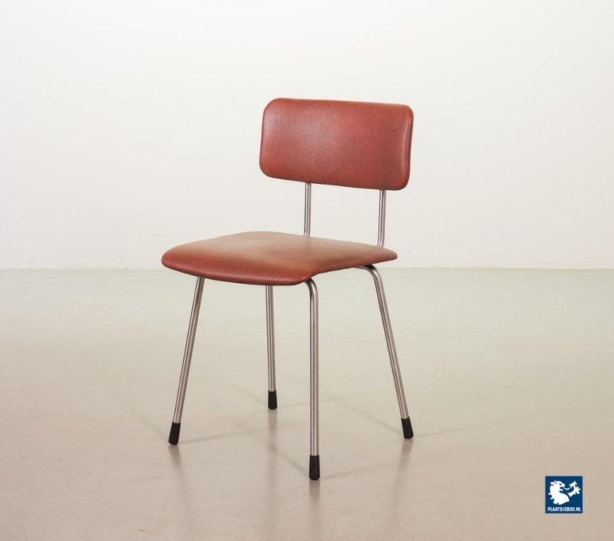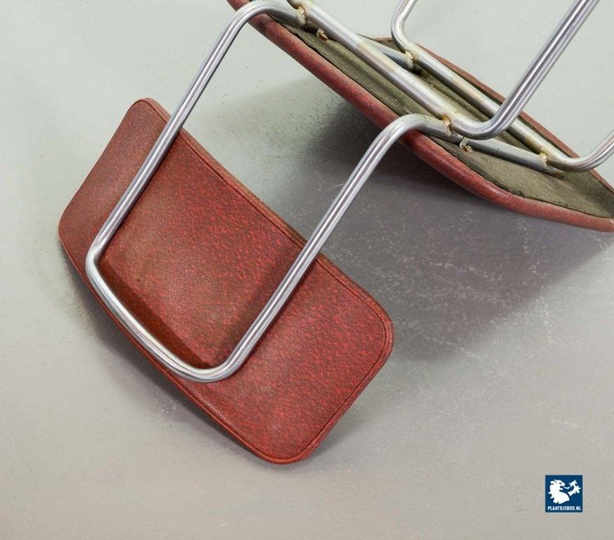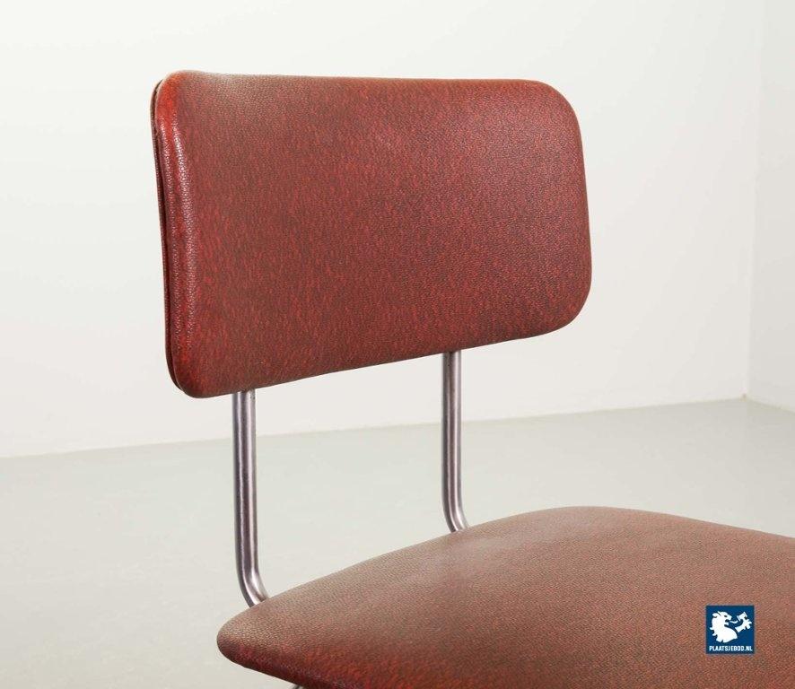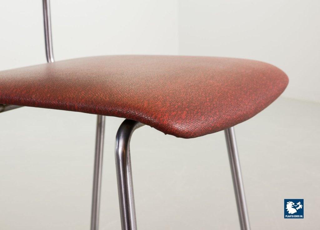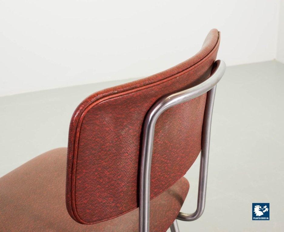 Mid-century Dutch Design Gispen desk / side / dining chair model 1262, manufactured in the 1960’s. This modernistic stone red leatherette chair is designed by the famous Dutch designer André Cordemeyer. It features a polished steel tube frame. The chair is in a very well preserved vintage condition, with minor wear consistent its age and use. Dimensions: Height 82 Width 45 Depth 52 cm.