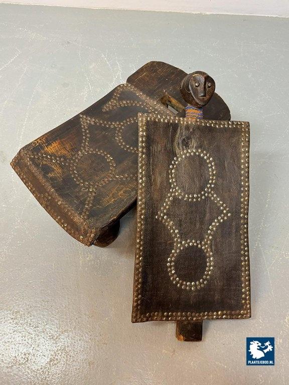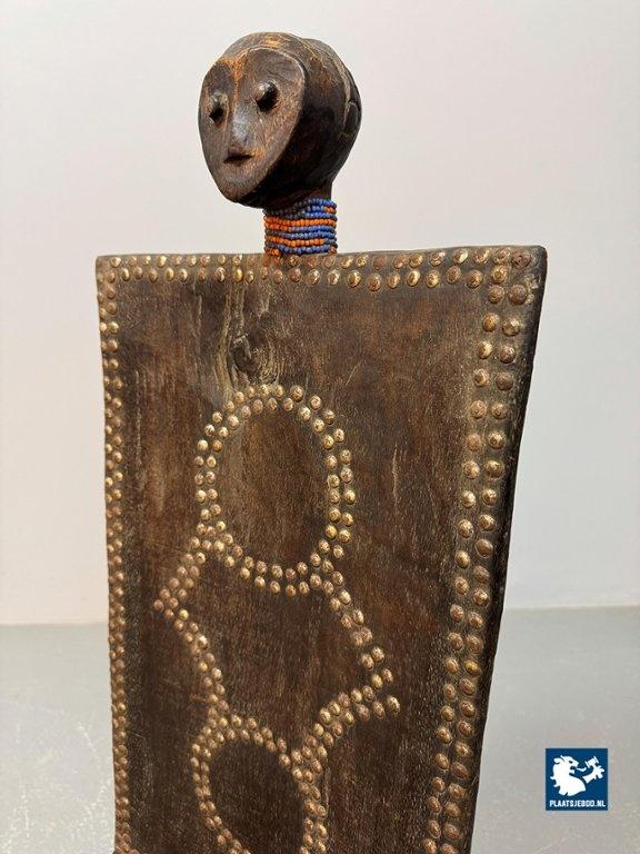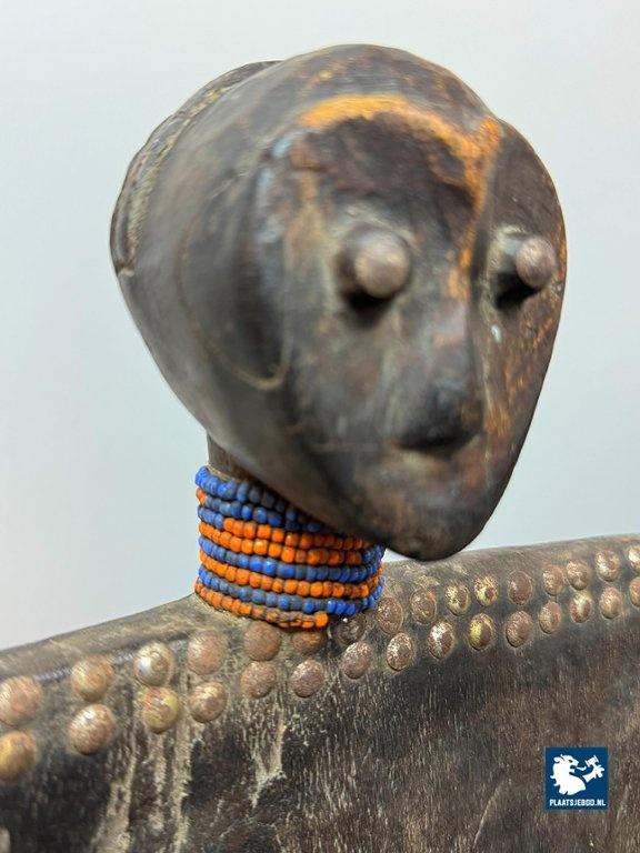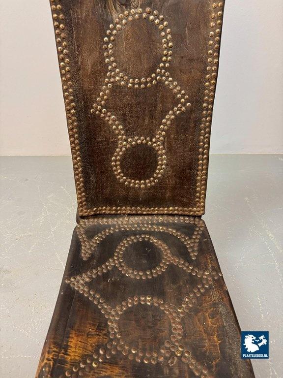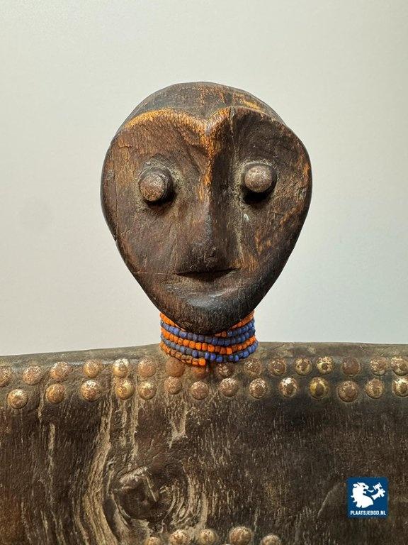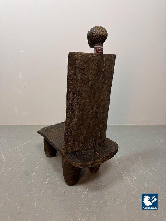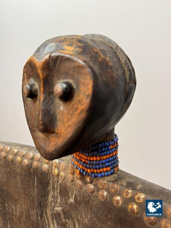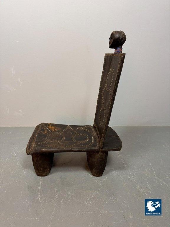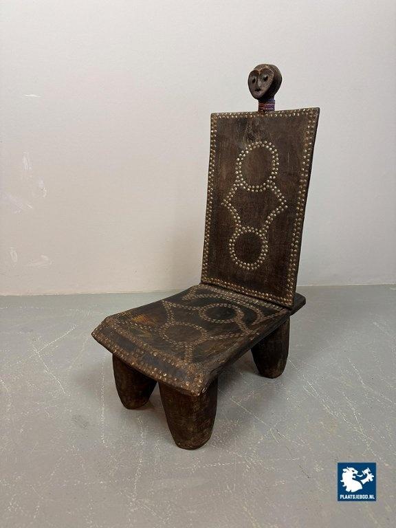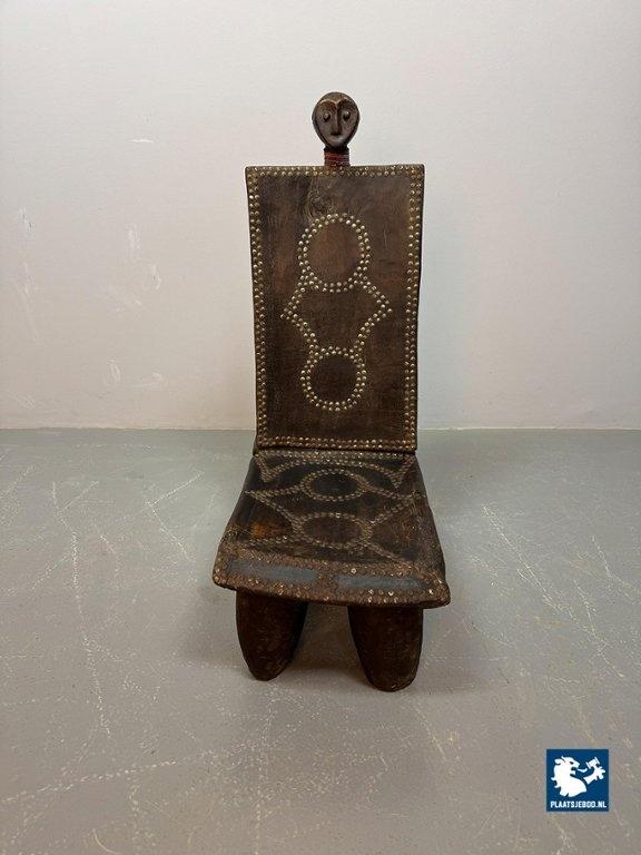 Exceptional African ceremonial tribal chair, likely originating from Tanzania. Carved from solid wood and featuring a stylized headrest and decorative metal studs. This king’s chair reflects traditional craftsmanship and ceremonial use, with wear consistent with age and historical function. A powerful sculptural object with strong cultural presence. Dimensions: Height 75 cm, Width 32 cm, Depth 53 cm, Seating Height 20 cm