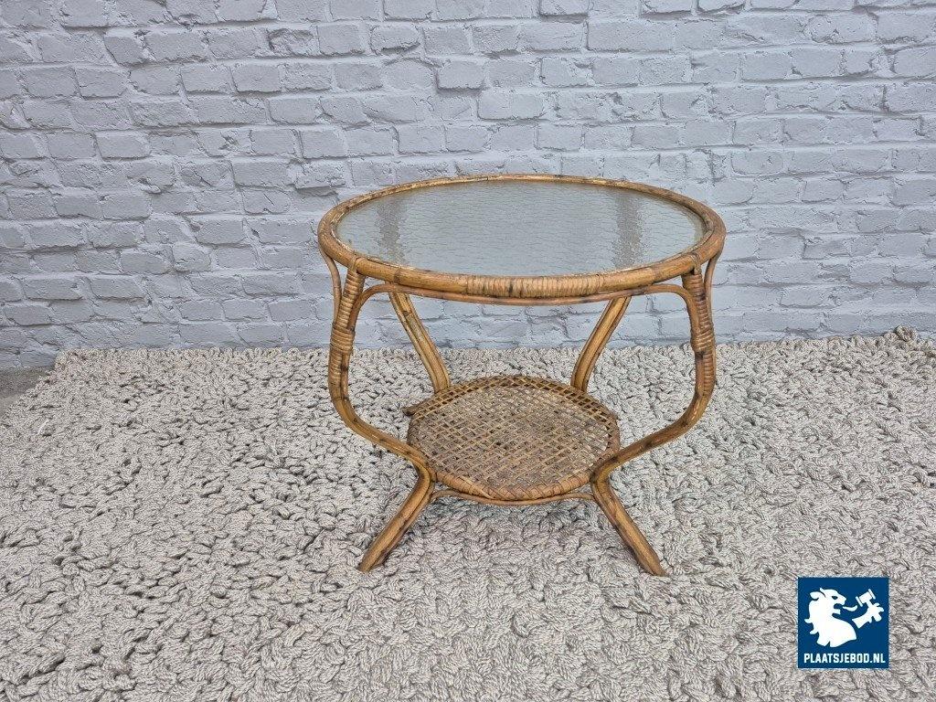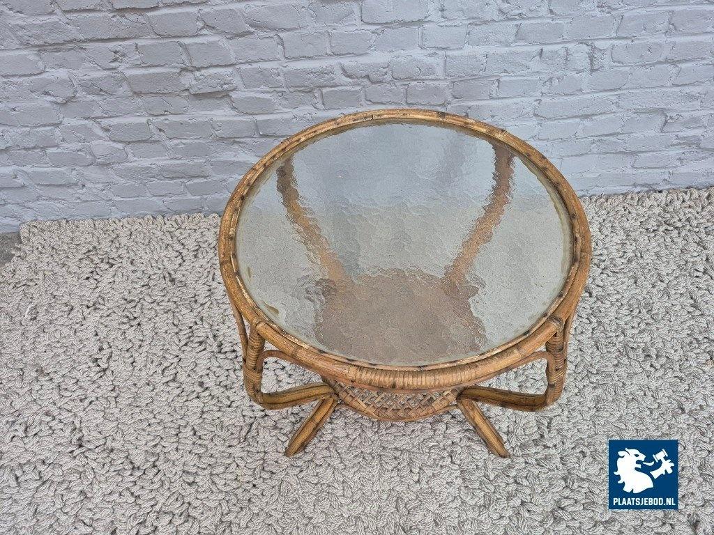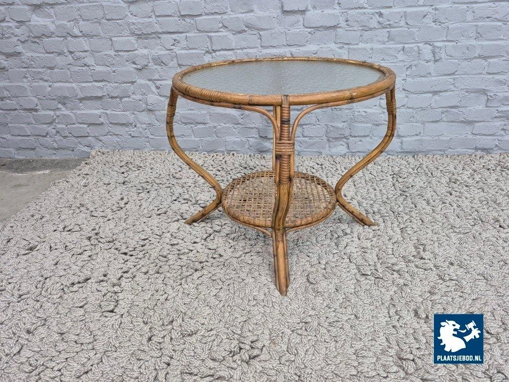 An elegant vintage bamboo side table with softly curved legs, a finely woven rattan magazine shelf and a transparent textured (hammered) glass top. The flowing lines and lighter proportions give this table a more refined appearance than standard bamboo models, while the natural materials add warmth and character. The construction is solid and well-balanced, making it both decorative and practical as a side or occasional table. In good vintage condition, with light wear consistent with age. Dimensions: Height 56 Width 75 Depth 75 cm.