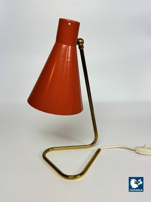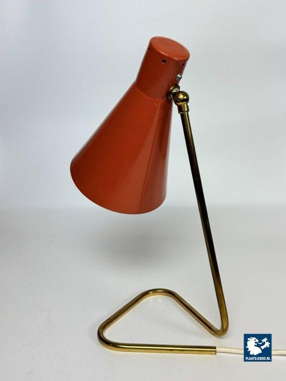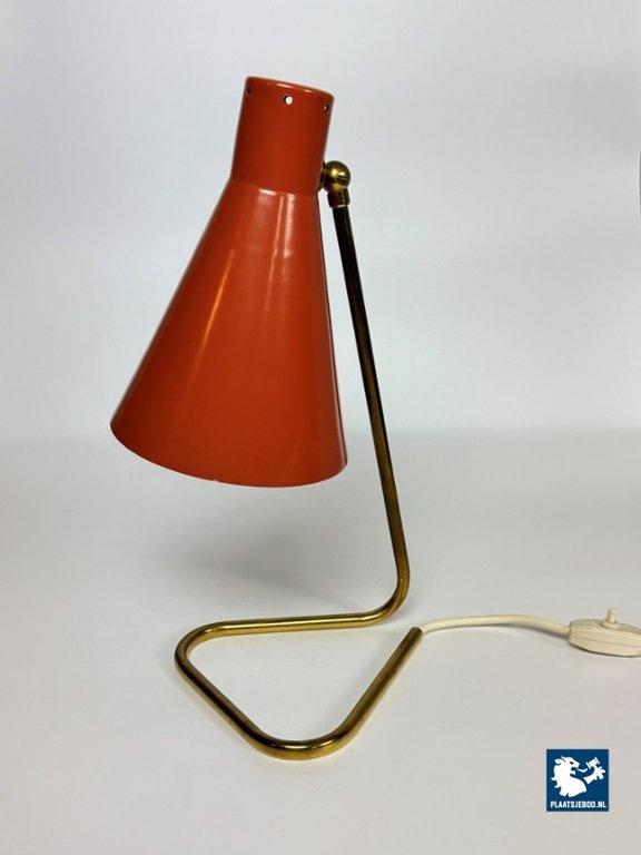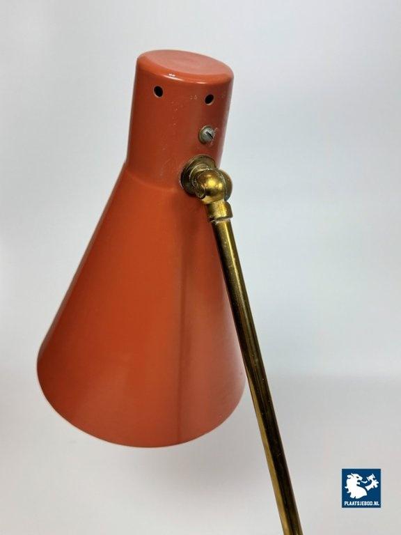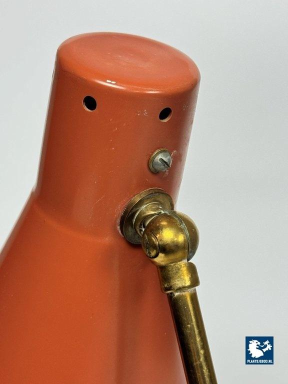 This vintage Italian bedside/table lamp was designed by Giuseppe Ostuni for O-Luce in the 1950s, and stands as a beautiful example of mid-century modern lighting. Featuring a brass frame and an orange lacquered metal shade, the lamp combines functional adjustable design with refined elegance. A classic piece from one of Italy’s most influential lighting designers, perfect for collectors and fans of Italian modern design. Total dimensions: Height: 38 cm, Width: 17 cm, Depth: 26 cm Shade: Length 21,5 Diameter 15 cm