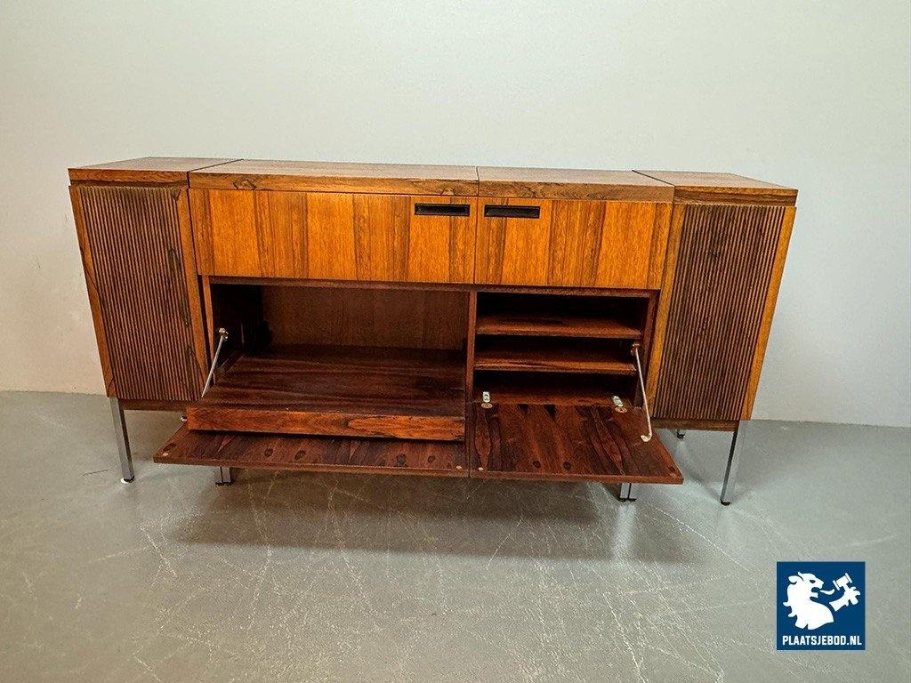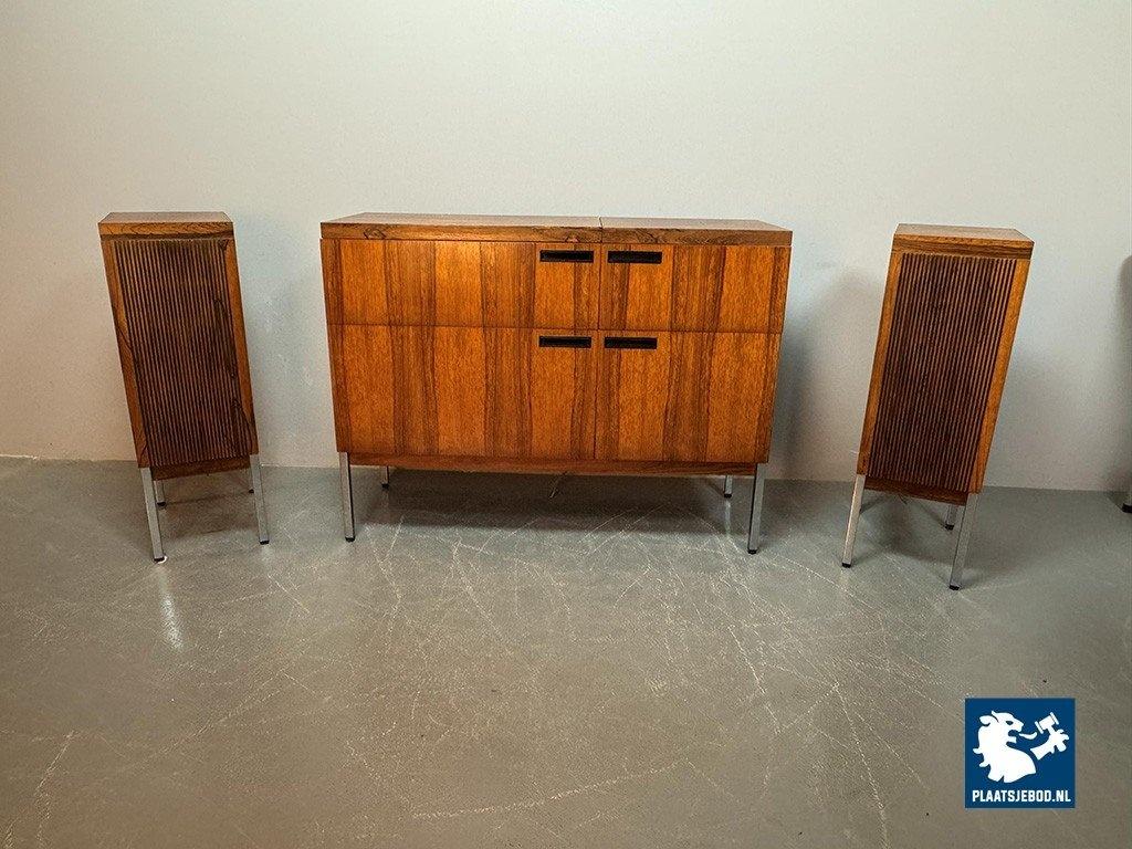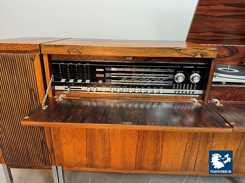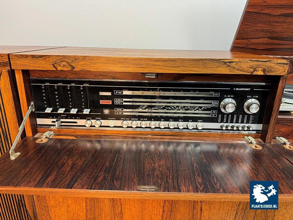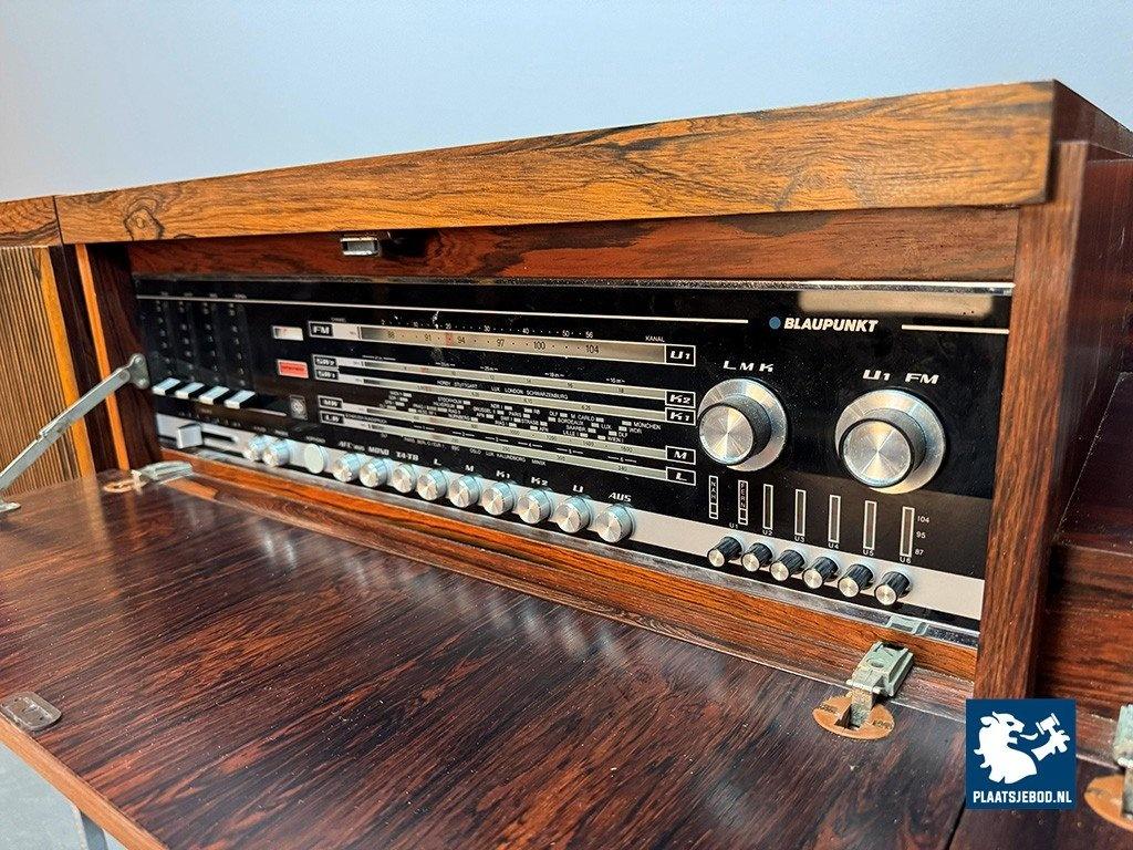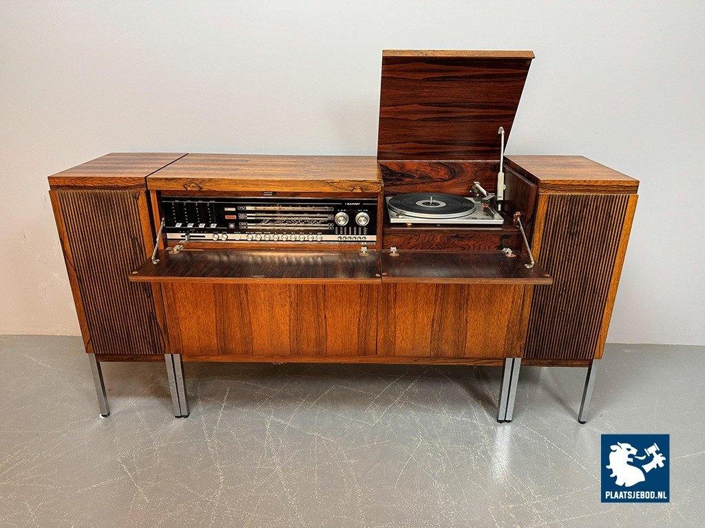 Rare and iconic Mid-Century Blaupunkt Stereo Music Cabinet with Integrated Turntable and Matched Rosewood Veneer Speakers, Germany approx. 1969-1971. An exceptional mid-century stereo console, dating from the late 1960s to early 1970s, featuring an integrated PE2010 turntable paired with radio and amplifier within a richly veneered rosewood cabinet. The piece is distinguished by its matched rosewood veneer that flows seamlessly from the main cabinet to the separate speakers, demonstrating high-end craftsmanship and material integrity. Designed as both a functional high-fidelity music system and a statement furniture piece, the console exemplifies the synthesis of audio engineering and refined mid-20th-century design. A refined example of European high-fidelity furniture design, combining technical sophistication with luxurious mid-century aesthetics. A highly sought-after collector's piece among Mid-Century enthusiasts. The audio equipment is untested and offered in original unrestored condition. This lot is intended for collectors or restorers. The main value of this lot lies in the exceptional high-quality cabinet. Dimensions: Height 79 cm, Width 157 (speaker 2x 26, cabinet 104,5) cm, Depth 39 cm