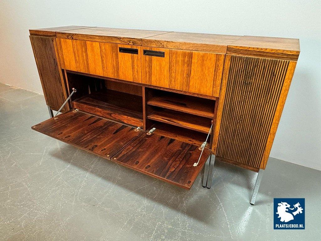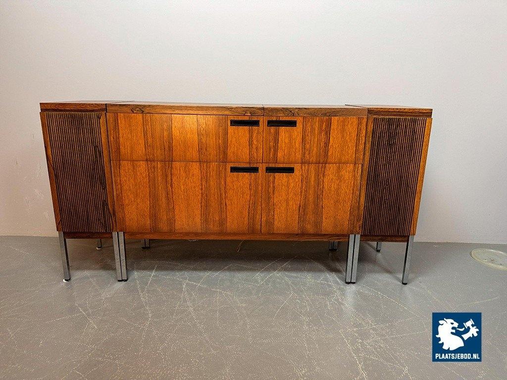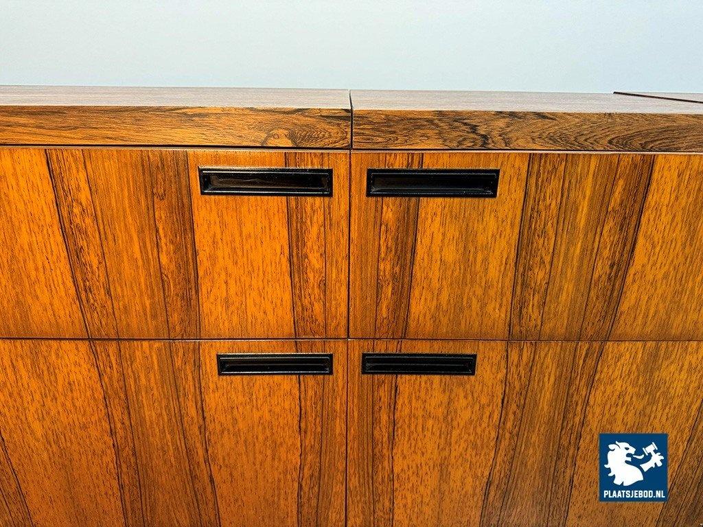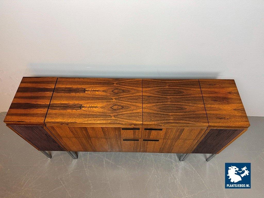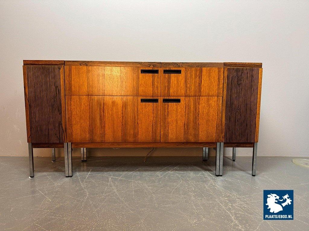 Rare and iconic Mid-Century Blaupunkt Stereo Music Cabinet with Integrated Turntable and Matched Rosewood Veneer Speakers, Germany approx. 1969-1971. An exceptional mid-century stereo console, dating from the late 1960s to early 1970s, featuring an integrated PE2010 turntable paired with radio and amplifier within a richly veneered rosewood cabinet. The piece is distinguished by its matched rosewood veneer that flows seamlessly from the main cabinet to the separate speakers, demonstrating high-end craftsmanship and material integrity. Designed as both a functional high-fidelity music system and a statement furniture piece, the console exemplifies the synthesis of audio engineering and refined mid-20th-century design. A refined example of European high-fidelity furniture design, combining technical sophistication with luxurious mid-century aesthetics. A highly sought-after collector's piece among Mid-Century enthusiasts. The audio equipment is untested and offered in original unrestored condition. This lot is intended for collectors or restorers. The main value of this lot lies in the exceptional high-quality cabinet. Dimensions: Height 79 cm, Width 157 (speaker 2x 26, cabinet 104,5) cm, Depth 39 cm