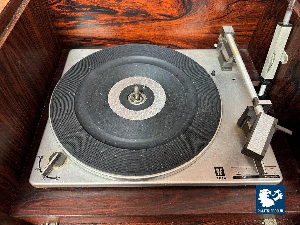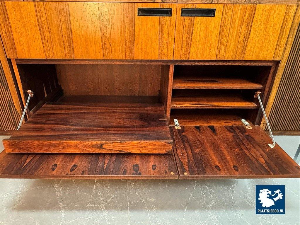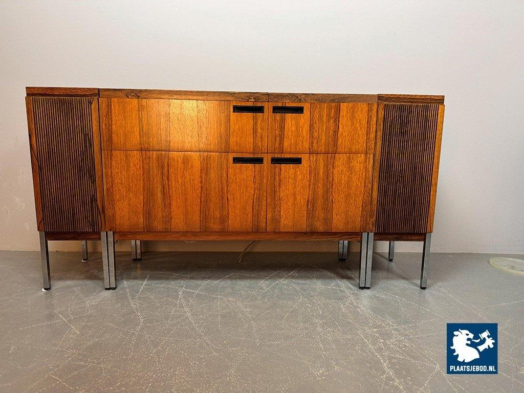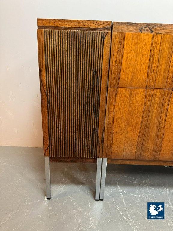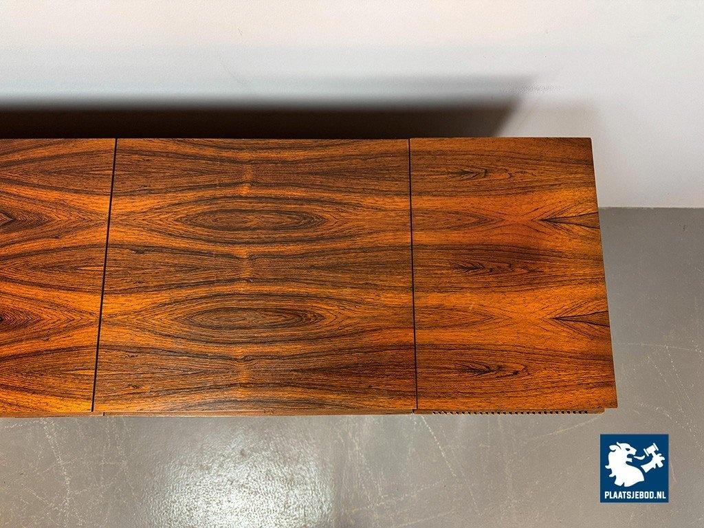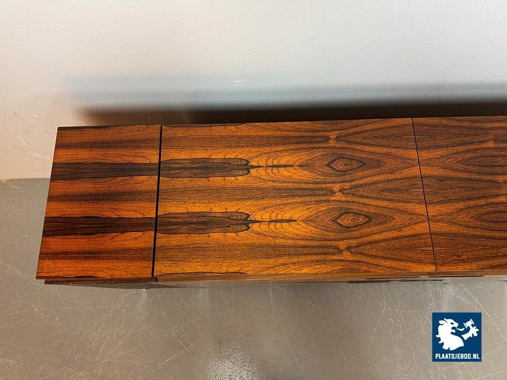 Rare and iconic Mid-Century Blaupunkt Stereo Music Cabinet with Integrated Turntable and Matched Rosewood Veneer Speakers, Germany approx. 1969-1971. An exceptional mid-century stereo console, dating from the late 1960s to early 1970s, featuring an integrated PE2010 turntable paired with radio and amplifier within a richly veneered rosewood cabinet. The piece is distinguished by its matched rosewood veneer that flows seamlessly from the main cabinet to the separate speakers, demonstrating high-end craftsmanship and material integrity. Designed as both a functional high-fidelity music system and a statement furniture piece, the console exemplifies the synthesis of audio engineering and refined mid-20th-century design. A refined example of European high-fidelity furniture design, combining technical sophistication with luxurious mid-century aesthetics. A highly sought-after collector's piece among Mid-Century enthusiasts. The audio equipment is untested and offered in original unrestored condition. This lot is intended for collectors or restorers. The main value of this lot lies in the exceptional high-quality cabinet. Dimensions: Height 79 cm, Width 157 (speaker 2x 26, cabinet 104,5) cm, Depth 39 cm