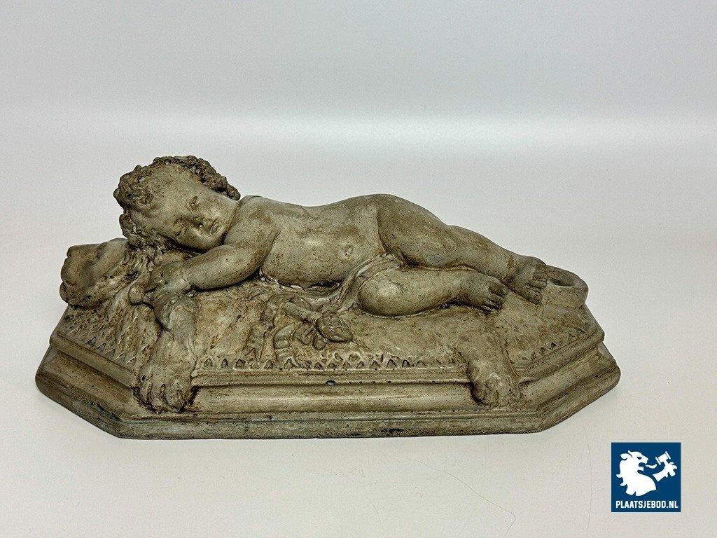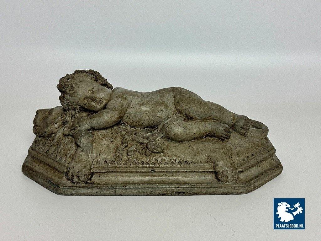 Finely Detailed Vintage Cast-Stone Sleeping Cherub on the Lion, 1950s-60s. The cherub wears a delicate laurel wreath with tine grape clusters, highlighting the exceptional craftsmanship. Compact yet substantial. A charming piece fol collectors of vintage figurines and decorative sculptures. Dimensions approx.: Height 15 Width 35 Depth 20 cm.