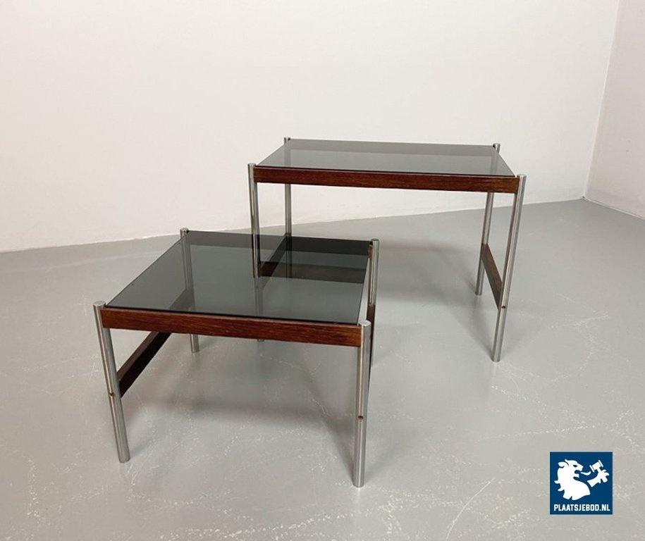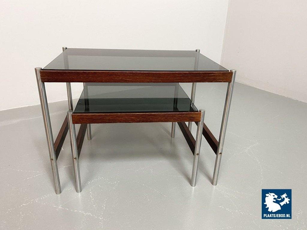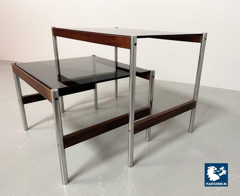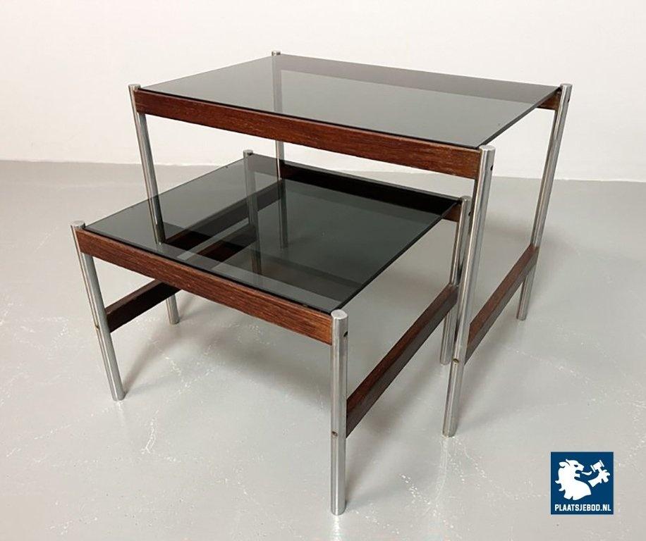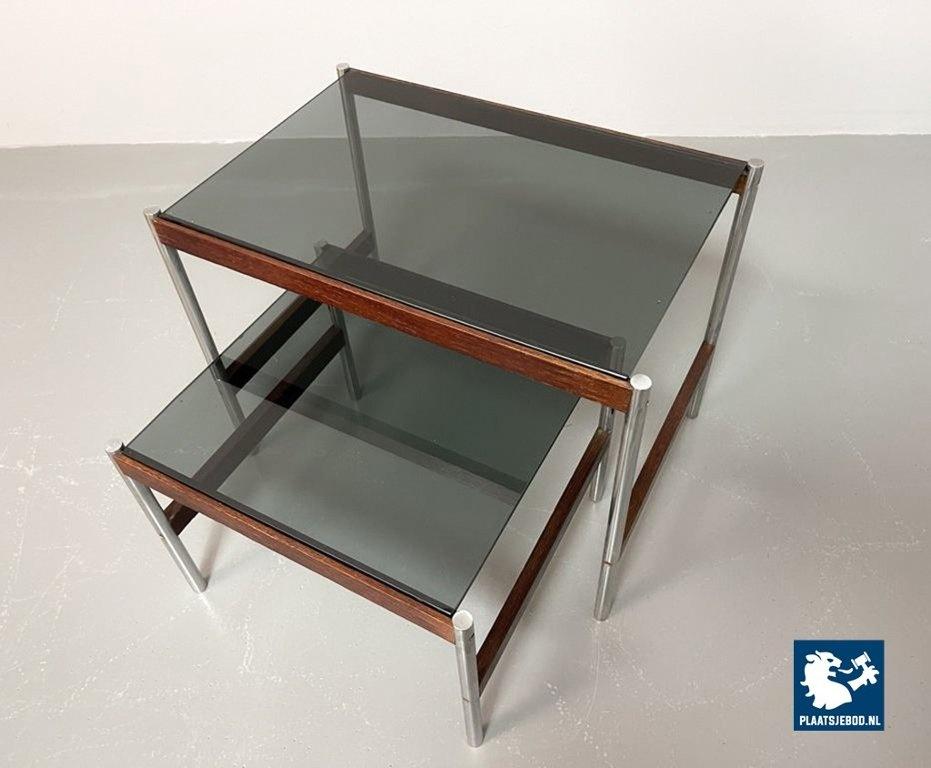Set of 3 Dutch design nesting tables with smokey glass top on wenge with chrome frame. Manufactured with great craftsmanship and quality by Fristho, The Netherlands in the 1960s. It’s a timeless design that matches with any interior. The set is in well preserved vintage condition with some wear consistent its age and use. Minimalistic modern elegant mid-century design from the Netherlands Height: 40 - 34 - 28 cm, Width: 53 - 46,5 - 40 cm, Depth: 35,5 - 35,5 - 35,5 cm, Quantity: 1 set