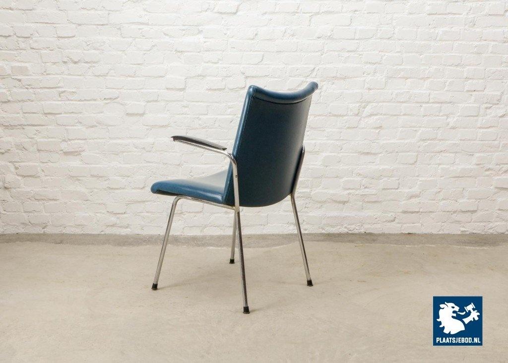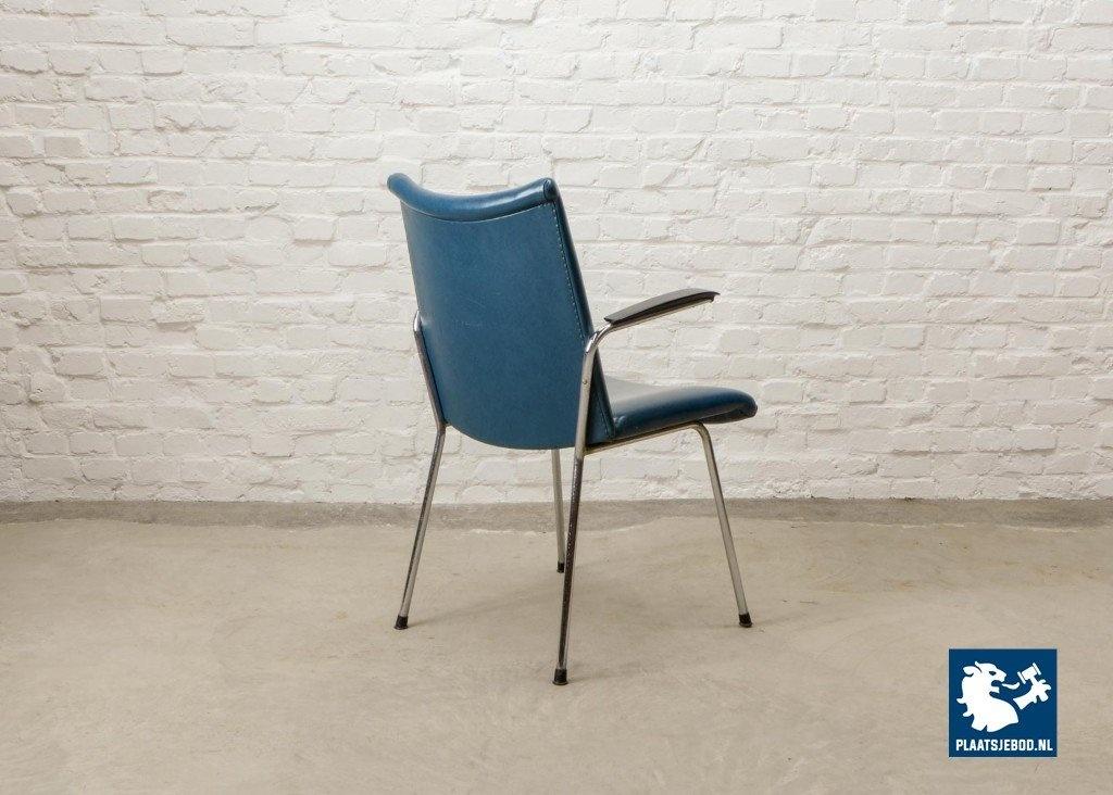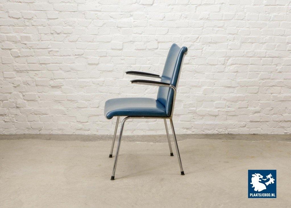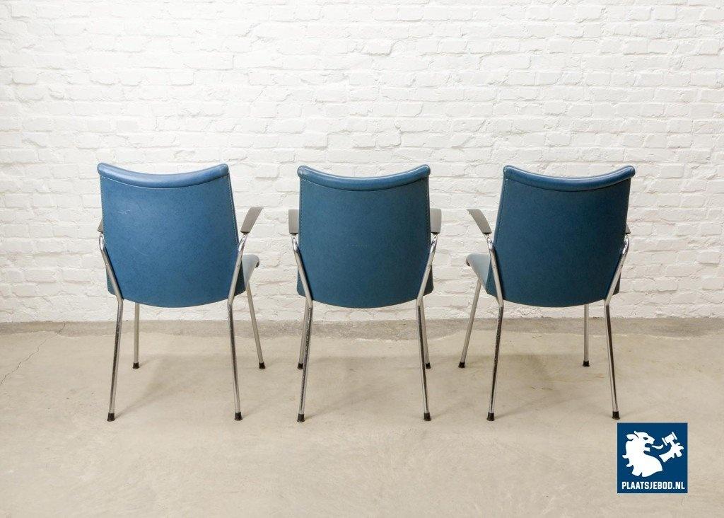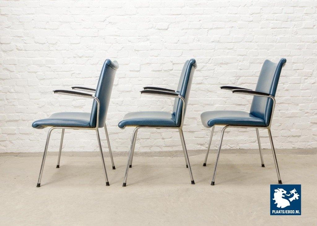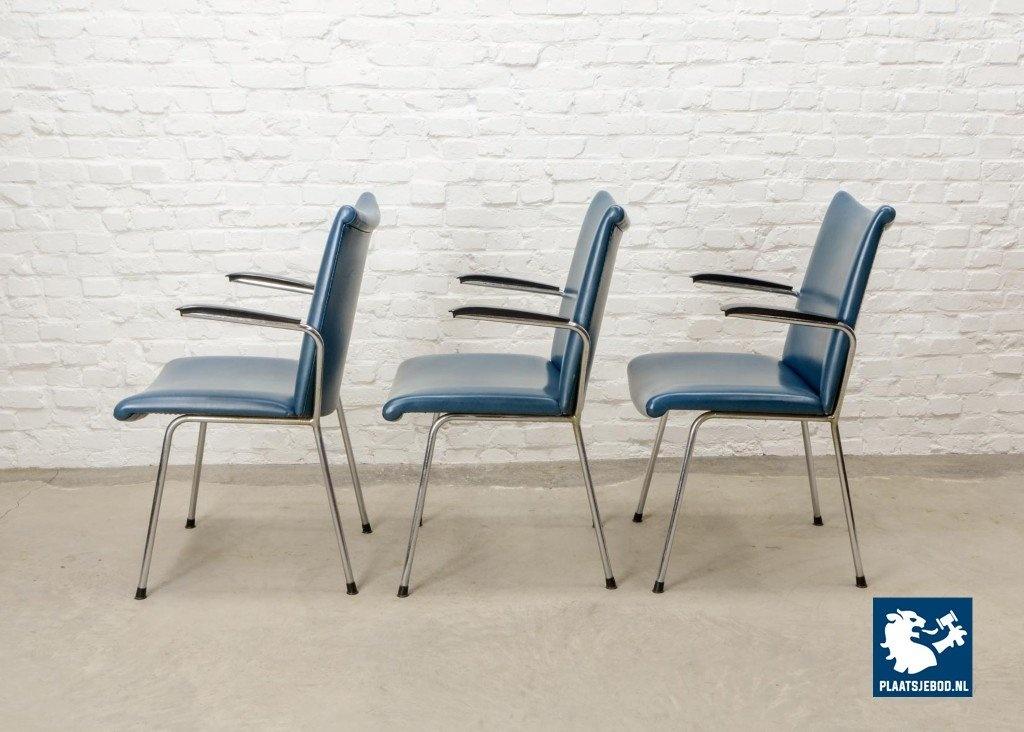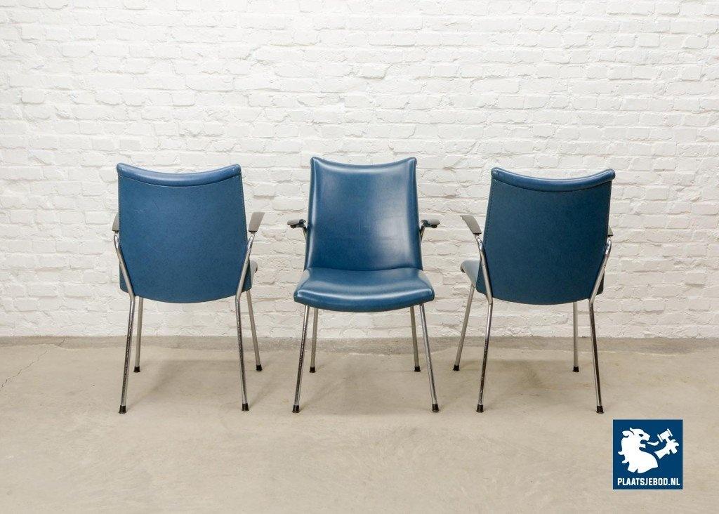 Gebroeders De Wit, Set of Three Dutch Design Arm Chairs with Vivid Blue Leatherette Upholstery. The Netherlands, 1960s. The chairs feature a tubular steel chromed frame with fresh blue leatherette upholstery and authentic bakelite armrests. The set offers a great seating comfort. Dimensions: Height: 90 cm, Width: 58 cm, Depth: 50 cm, Seat height: 46 cm, Armrest height: 70 cm, Quantity: 3
