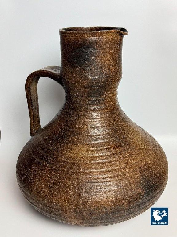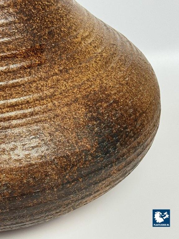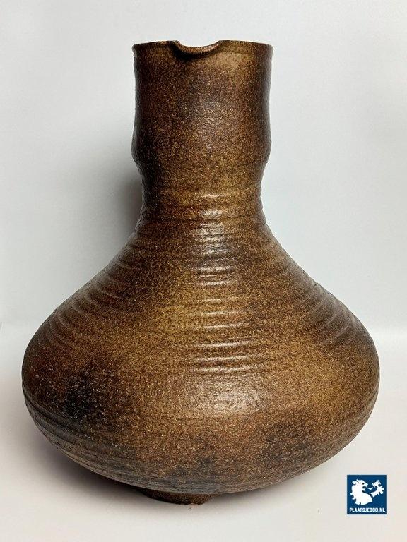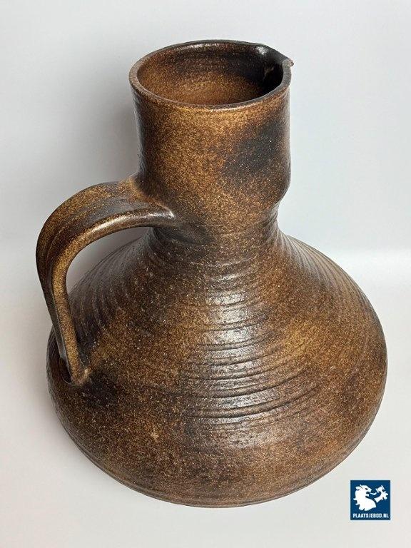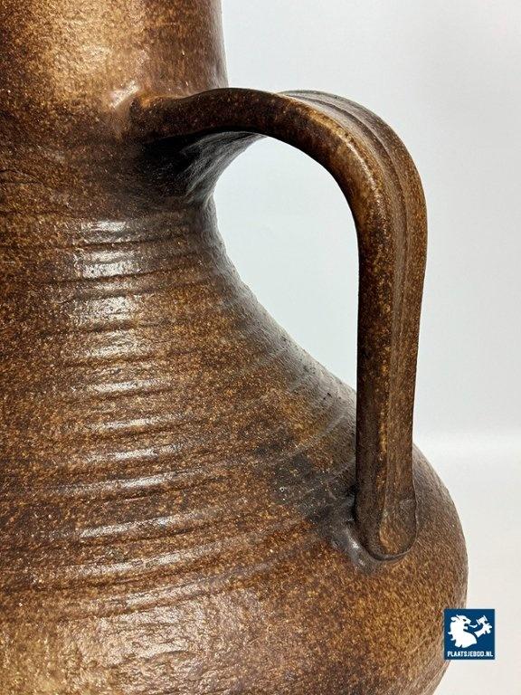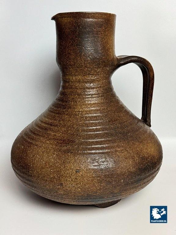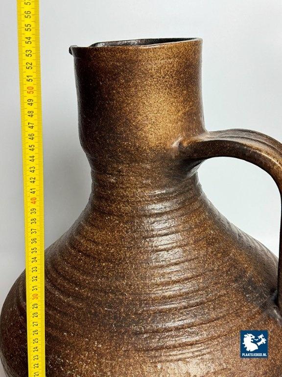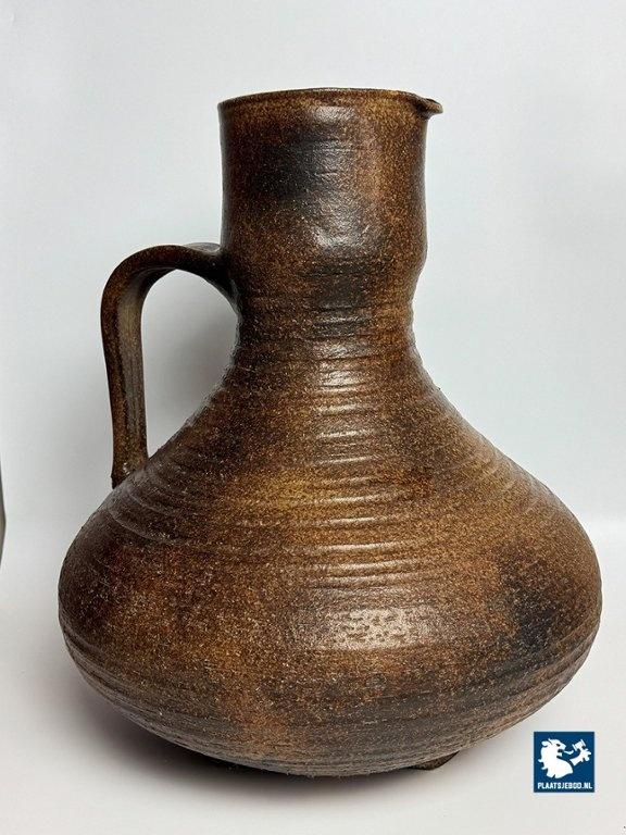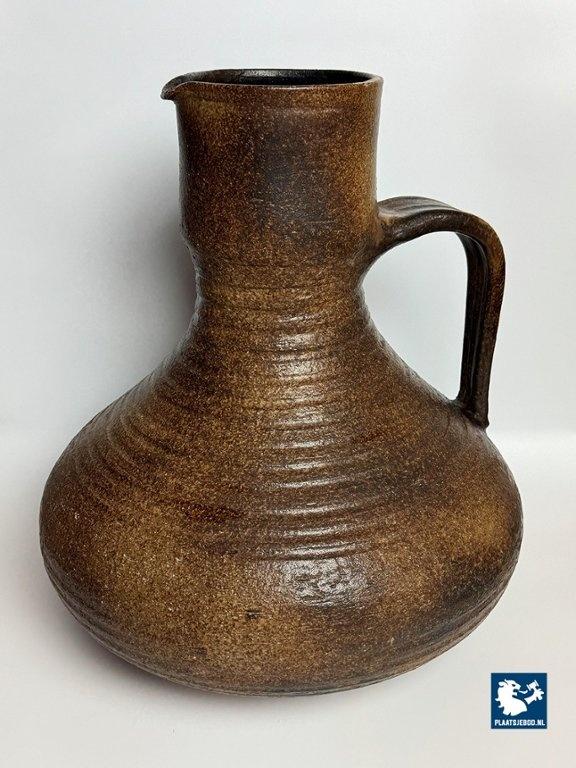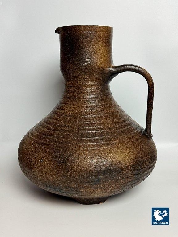 Impressive oversized ceramic jug representing classic mid-century Brutalist studio pottery from West Germany. The vessel features a bold bulbous form with horizontal ribbing and a strong sculptural handle. Finished in a richly textured brown speckled glaze, typical of West German ceramic production of the period. Likely marked “West Germany” and model-numbered on the base. A powerful decorative object with strong wabi-sabi character and tactile presence. Dimensions Height 54 Diameter top 16,5 Diameter opening 14,5 Diameter Belly 48 cm