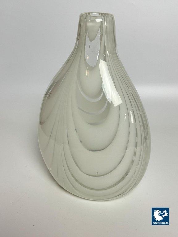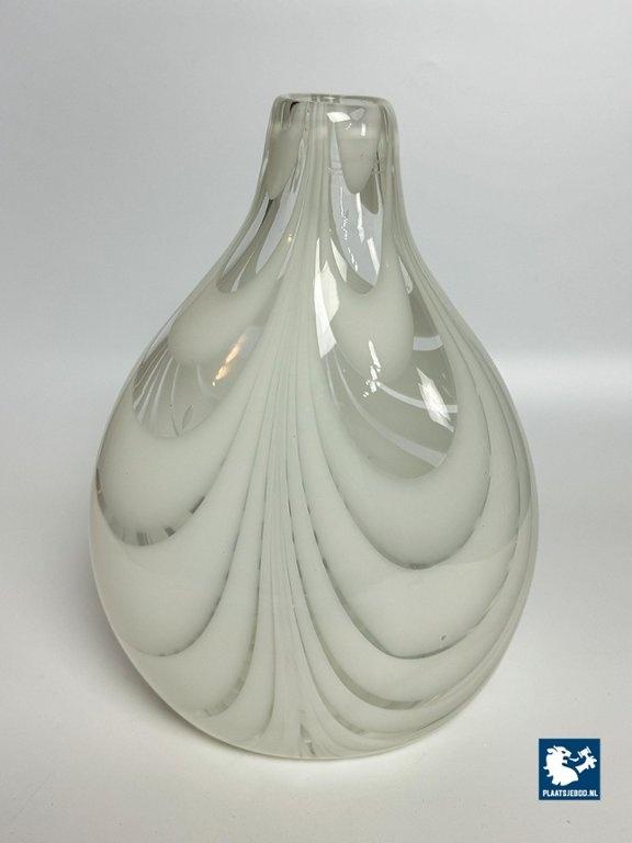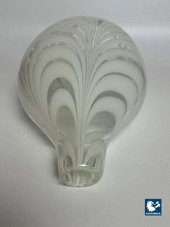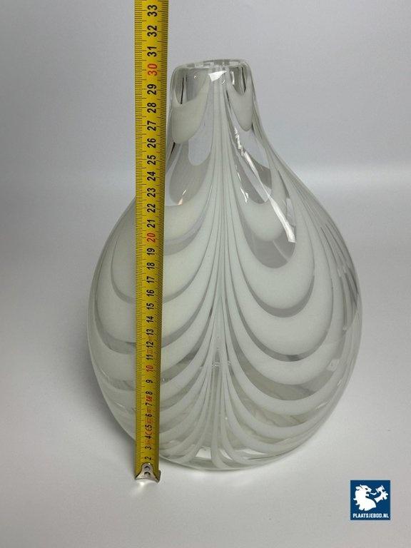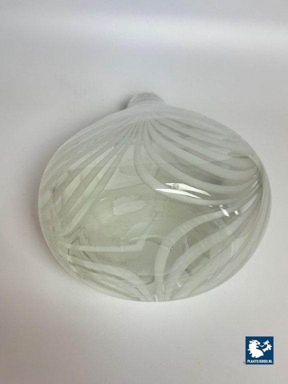 A finely handblown antique glass vase, attributed to the Victorian Nailsea loop-glass craftsmanship featuring beautifully encased white looping spirals withing thick, clear glass. The decorative white pattern is fully integrated into the body. The base shows a subtle concave pontil area with a softened hand-finished mark, consistent with authentic mouth-blown glass of the period. Dimensions: Height 30 Width 20 Depth 13 Diameter Top 5 Diameter opening 3,5 cm
