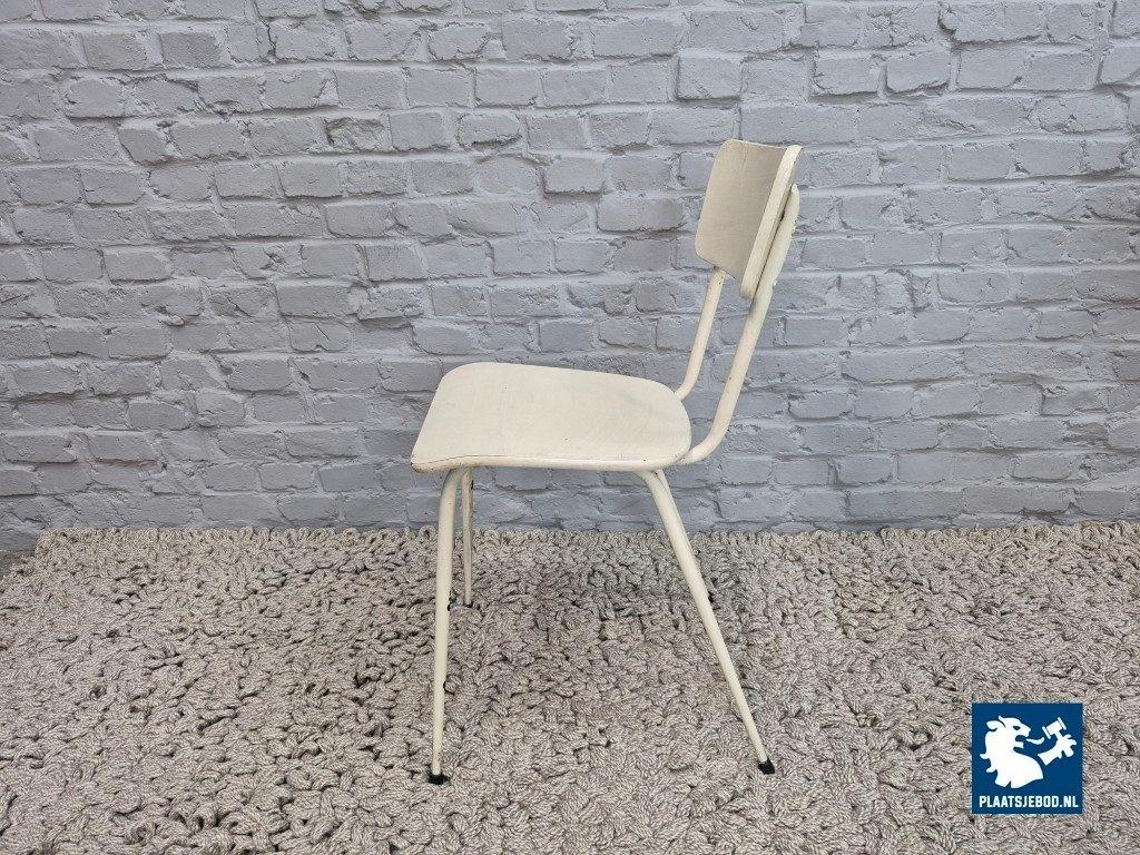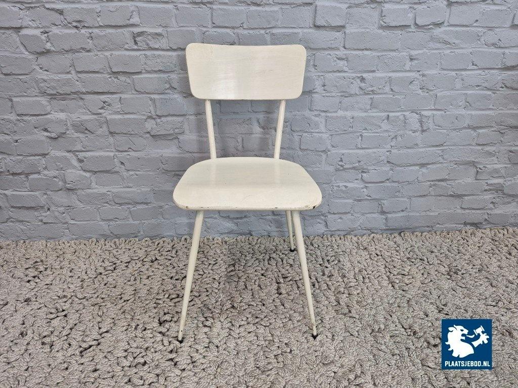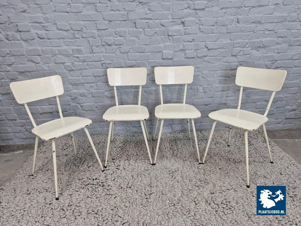 Honest and minimalist vintage industrial chairs, executed entirely in white-painted wood and metal. The set features slender metal legs, wooden seats and backrests, and a clean, functional silhouette that is very much in line with 1950s utilitarian design. The all-white finish gives the chairs a light, understated presence, making them easy to combine in a kitchen, dining area or studio setting.