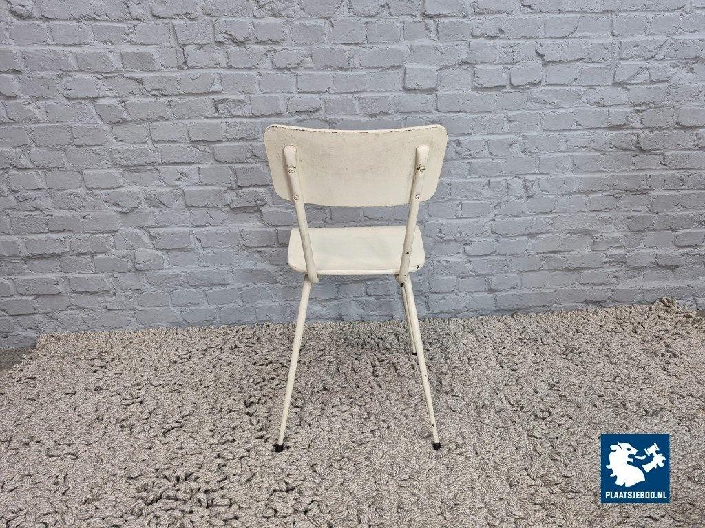 The chairs are in good vintage condition, with visible paint wear and small losses to the white finish on the frames and seats, consistent with age and use. This patina adds to their authentic industrial character without affecting structural quality. Dimensions: Height 77 Width 37 Depth 46 Seating height 45 cm.