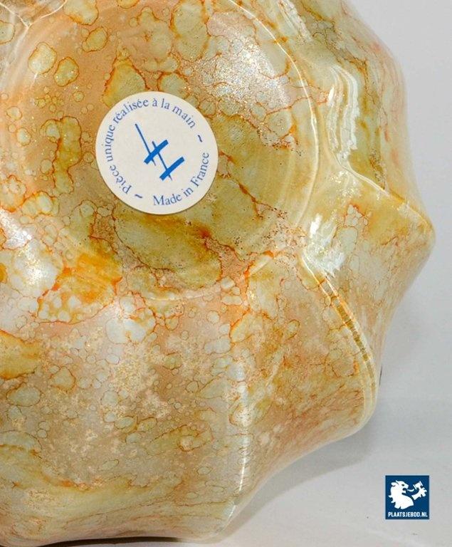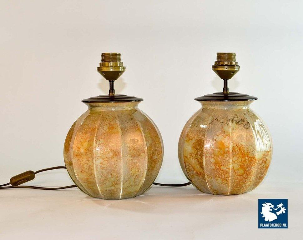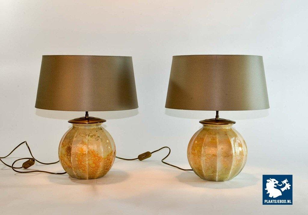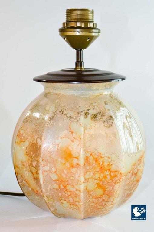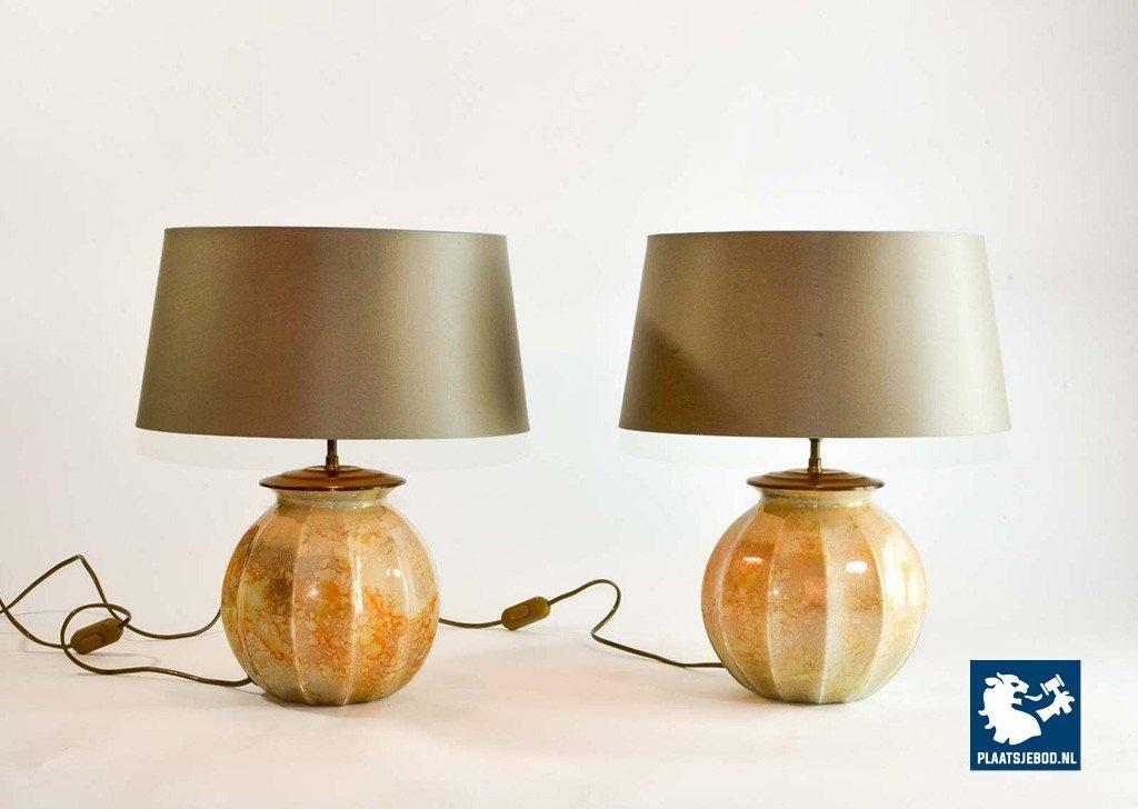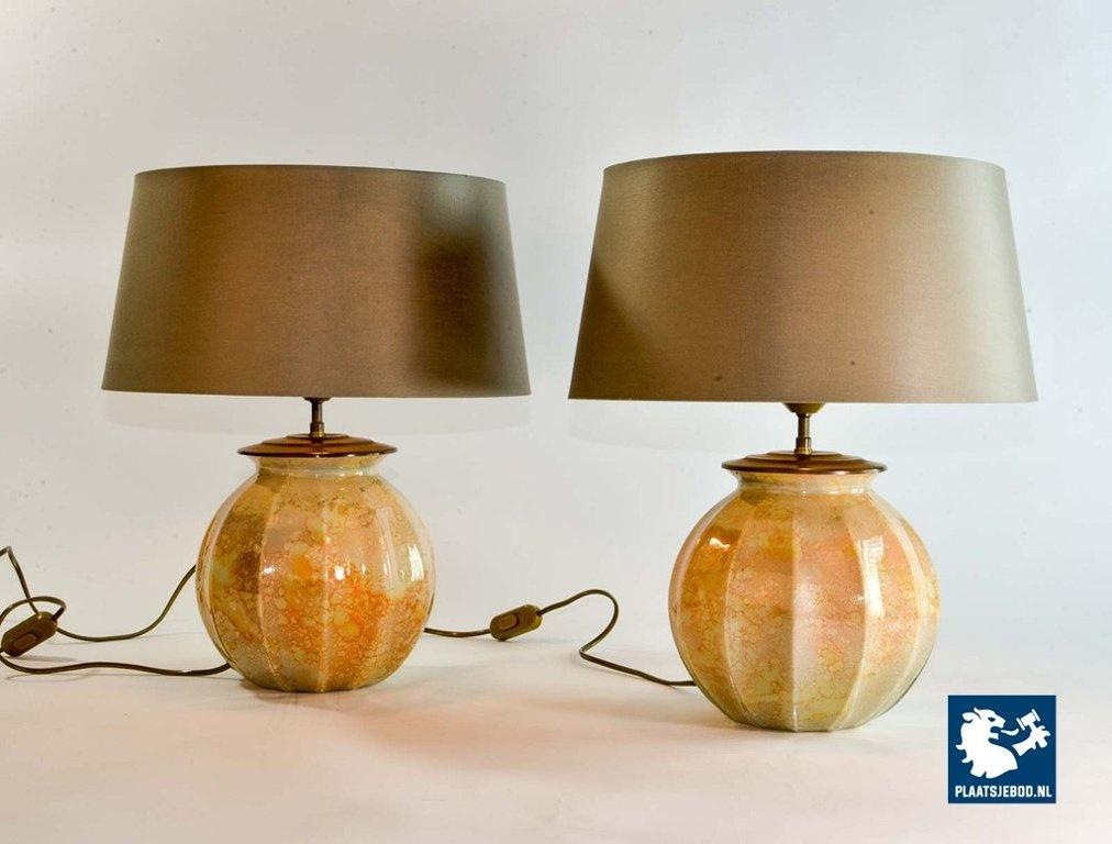 Please note! This lot contains only one of the lamps shown. Stunning French handmade glass table lamps by Laque Line, 1970s. The marbled glass foot shows nice color glows of orange, caramel, cream and golddust. They make a very warm combination with the warm grey colored lampshade on top. Both lamps are labeled by Laque Line, France and are in an excellent condition. Height pedestal 28 Diameter 20 cm.