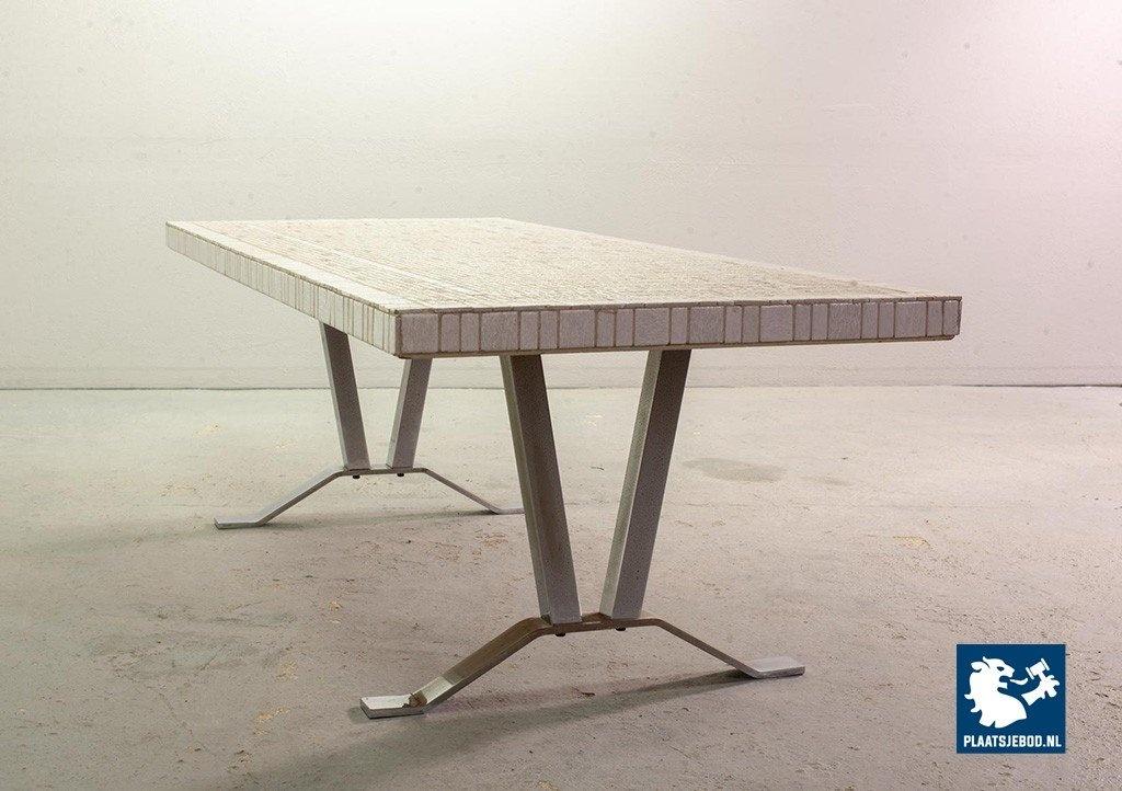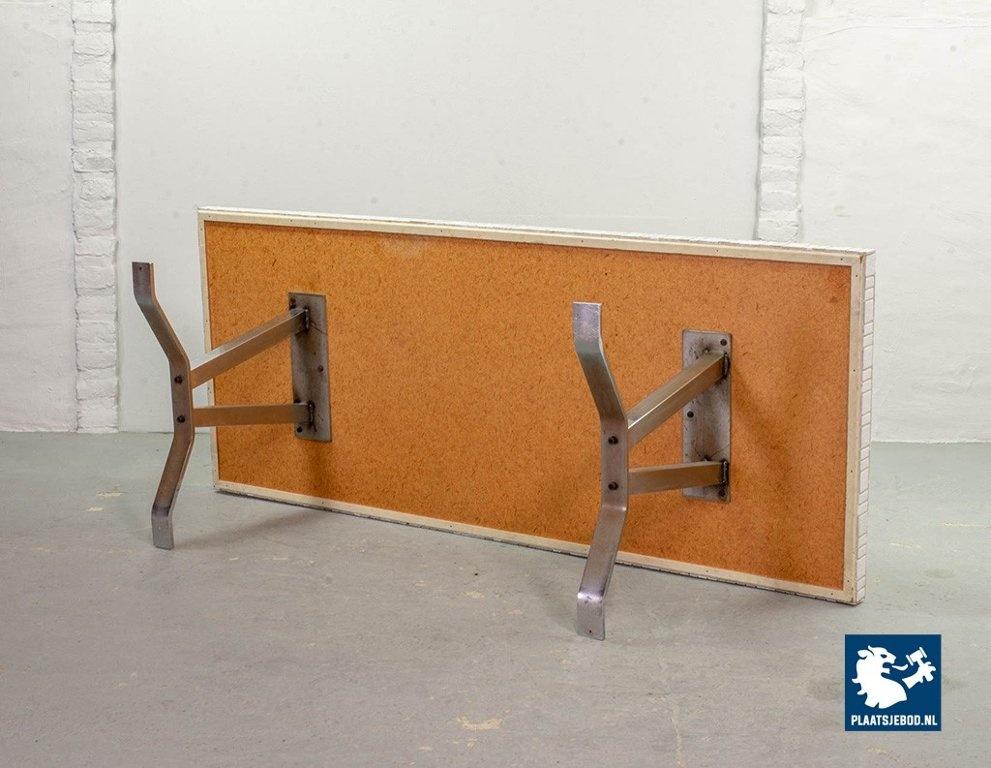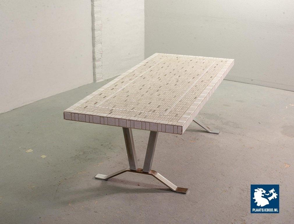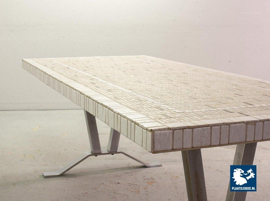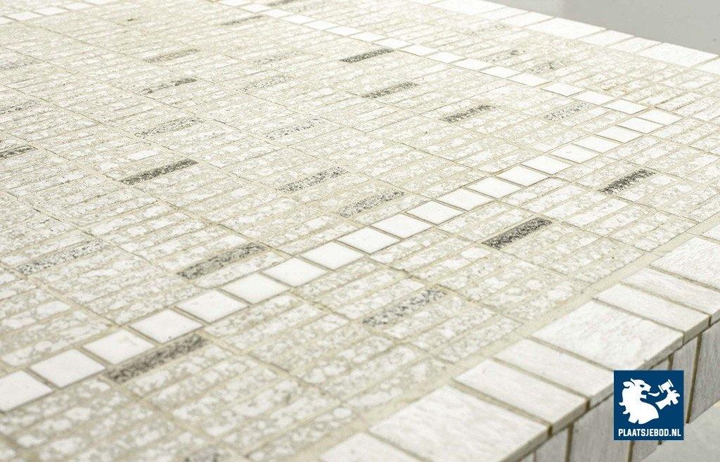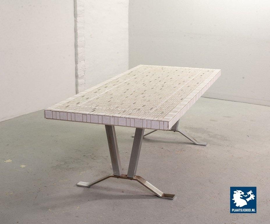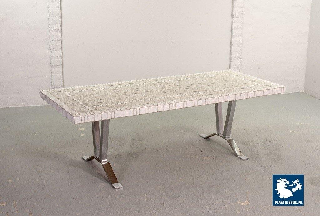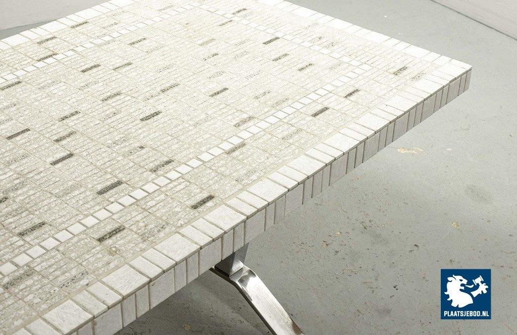 Large white ceramic mosaic mid-century modern design coffee table on chrome base in style of Denisco, Belgium, 1960s. The top features a pattern of a variety of small grey and white ceramic tiles. The coffee table is in a good vintage condition, with some wear consistent its age and use. Dimensions: Height: 51 cm/20,1'', Width: 158 cm/62,2'', Depth: 65 cm/25,6'', Quantity: 1