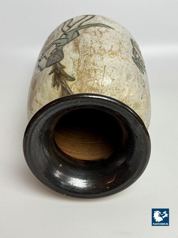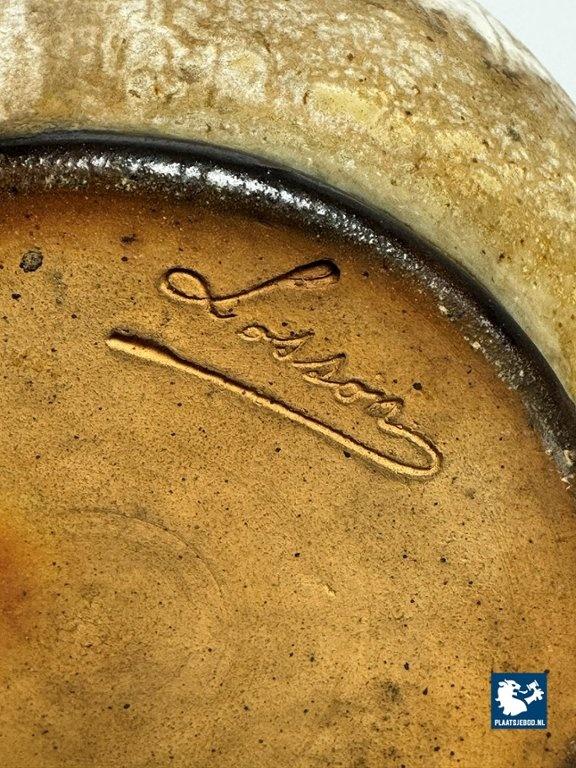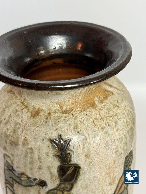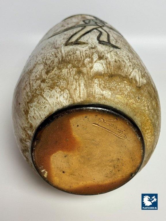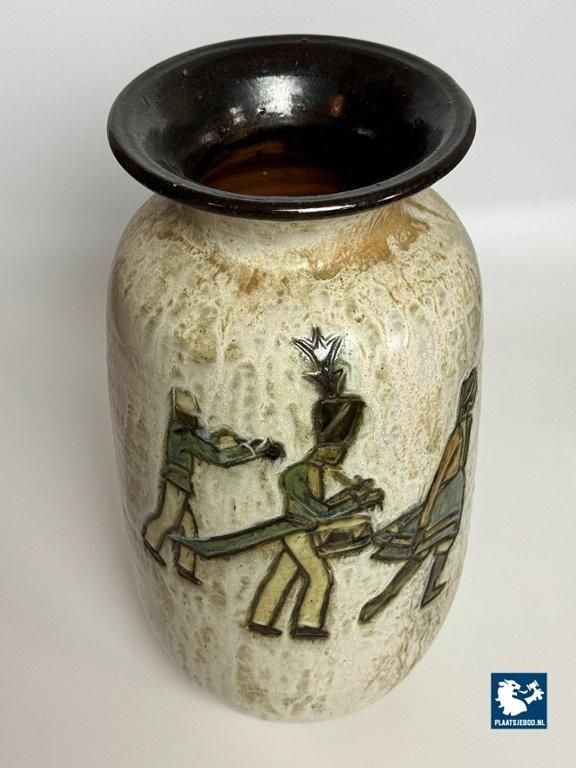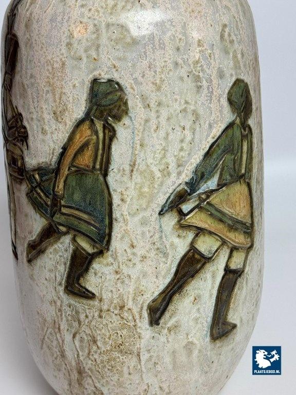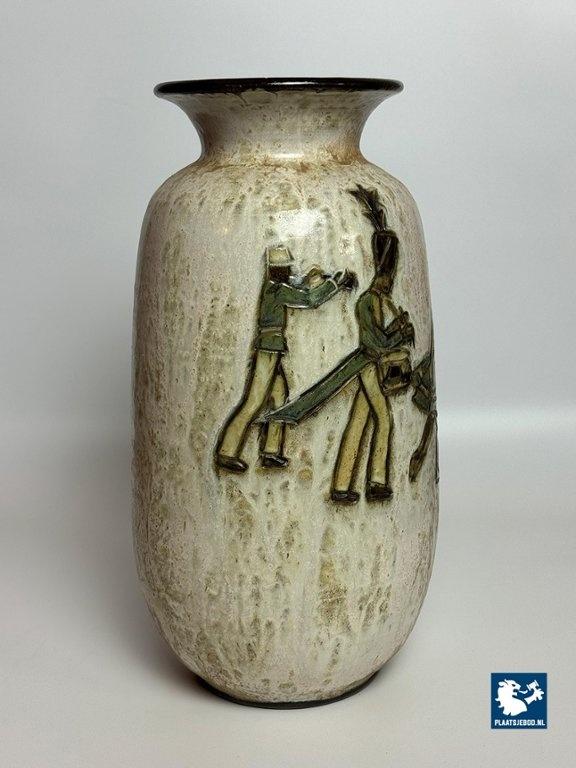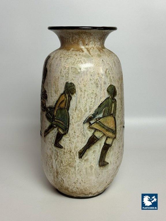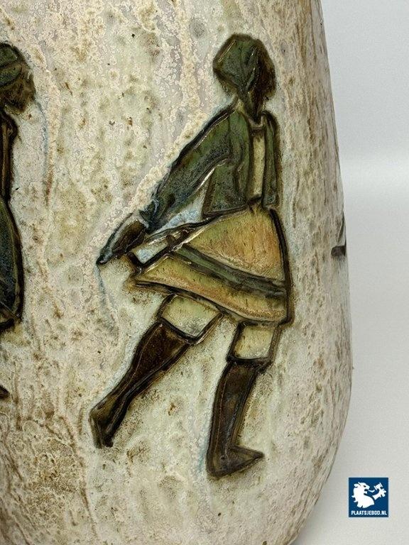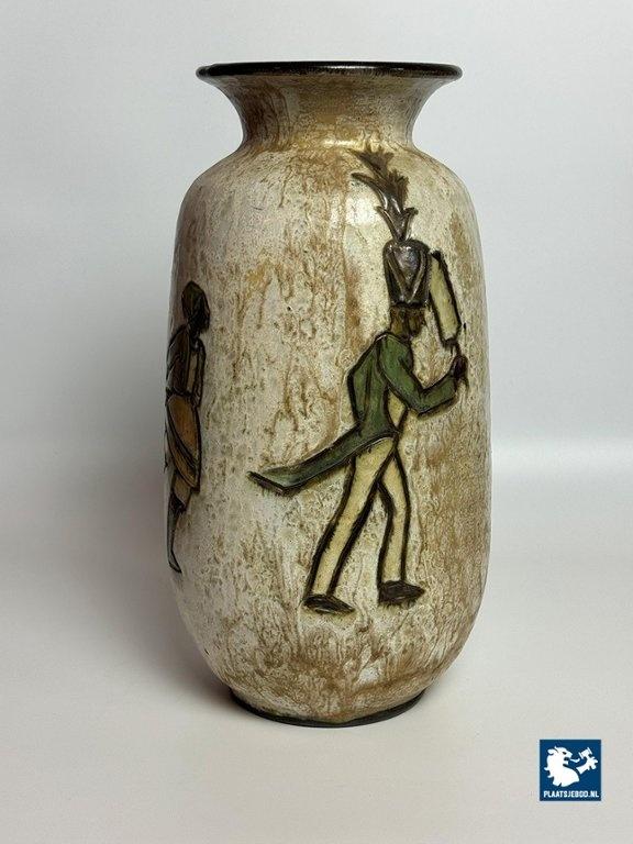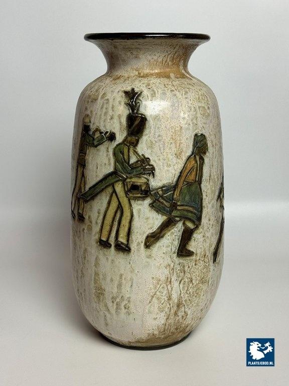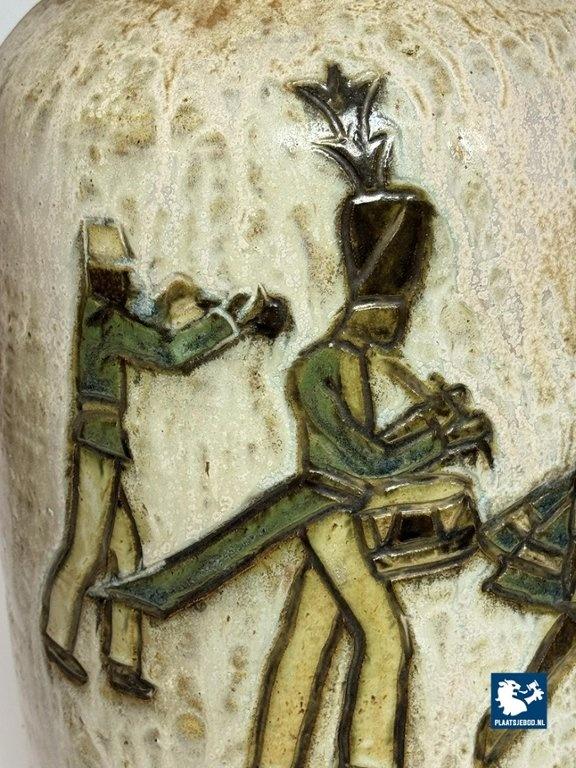 Large Exceptional Mid-Century Handcrafted Multicoloured Vase Signed by Losson with Brass Band Musicians, 1960s. Decorated with a lively scene of musicians rendered in warm earth tones of cream, yellow and green. The expressive decoration and tactile surface are reminiscent of Guhl-style art pottery, with a strong emphasis on handcrafted character. The vase is in a very well-preserved vintage condition, with a warm and decorative presence. A distinctive and characterful art pottery piece. Height 41,5 Diameter top 16,5 Diameter opening 9 Diameter Belly 22