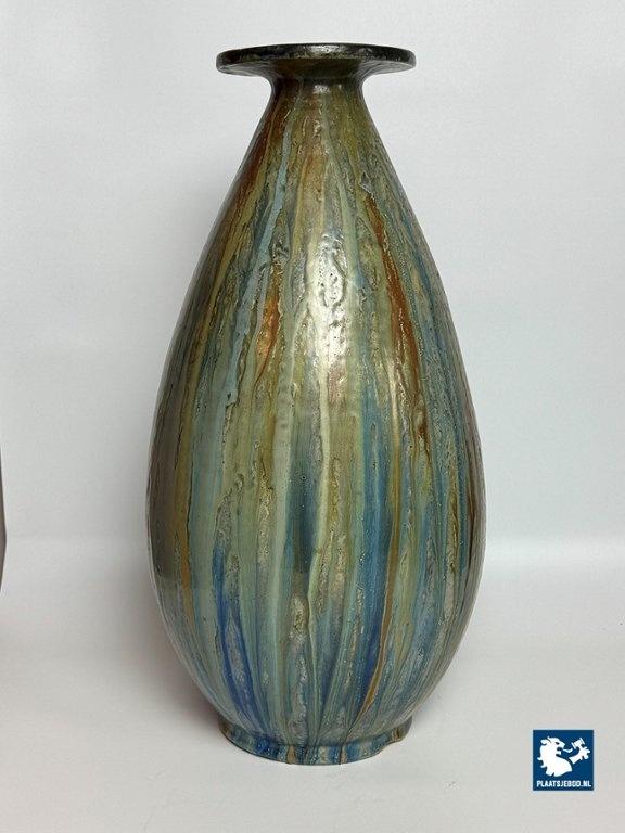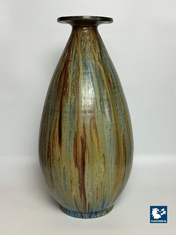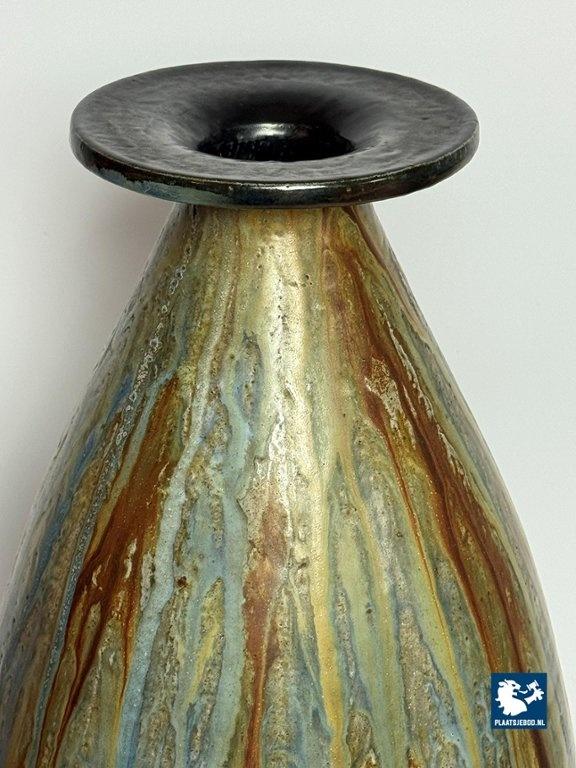 Large Salt Glaze Stoneware Vase Designed and signed by Guerin with small Neck, 1930s, marked and signed. Belgium, Bouffioulx 1930s. Roger Guérin is an important name in Belgian Art Deco ceramics. Most of his work consisted of ball vases and geometric vases, as well as sculptures. Her preferred material was stoneware with a high-fire salt glaze. He began with the Modern style and then evolved into the Art Deco style. He obtained international recognition following his presence at the International Exhibition of Industrial and Modern Decorative Arts in Paris in 1925. He carried out numerous artistic collaborations with sculptors and ironworkers. Several of his works were acquired by King Albert or are present in Belgian, Dutch, Italian and American museums. Dimensions: Height 50 Diameter top 15 Opening 6 Belly 25 cm.