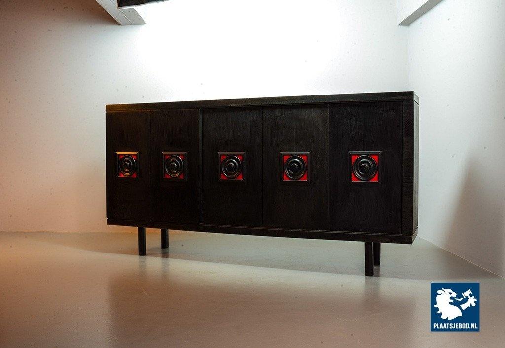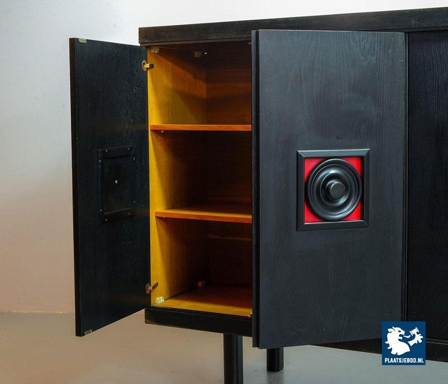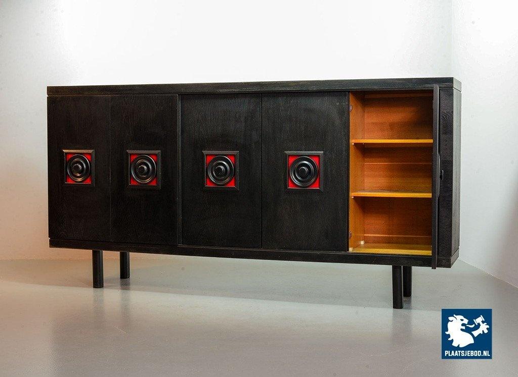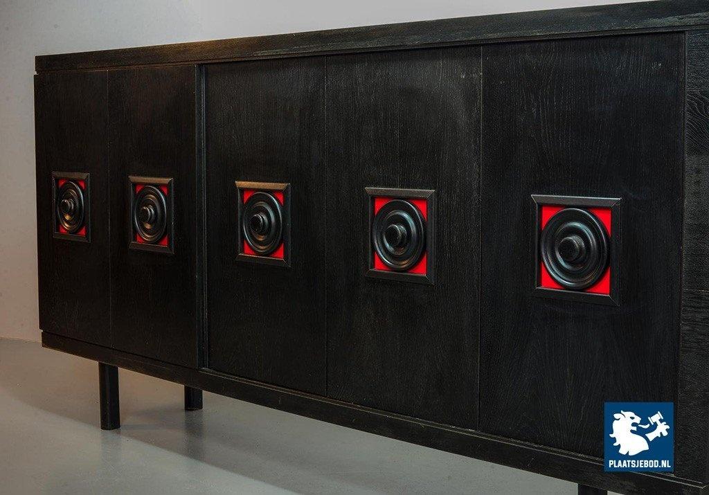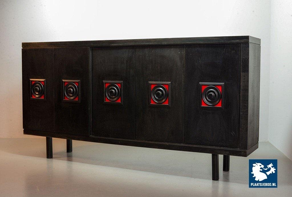 Lot 305-093-ST026-B4: Large Mid-Century De Coene Style Brutalist Black Highboard with Red Accents. Belgium, 1960s