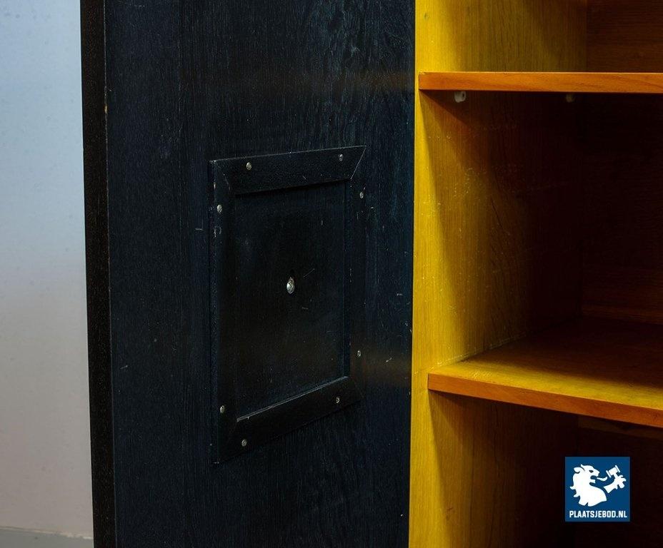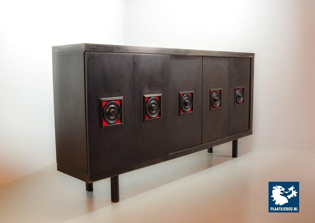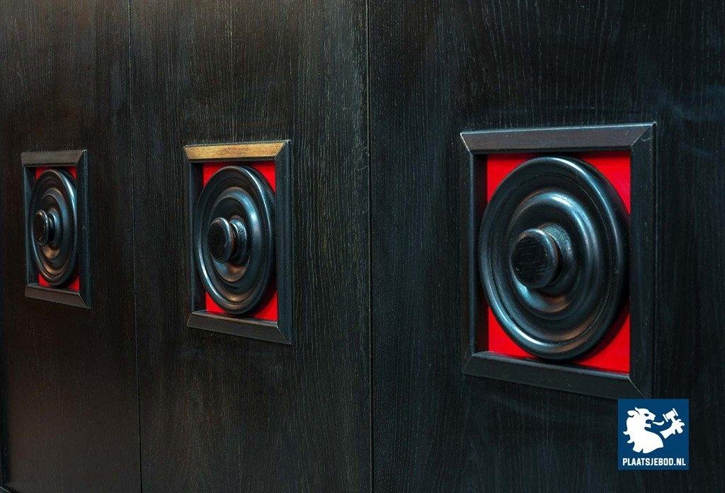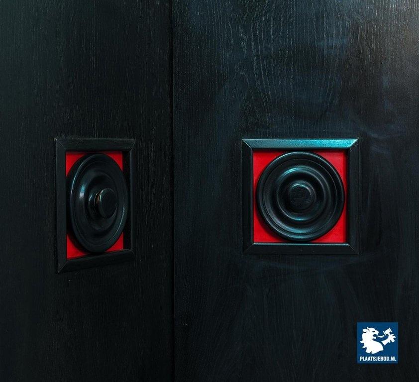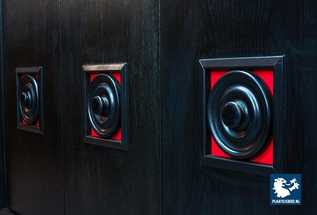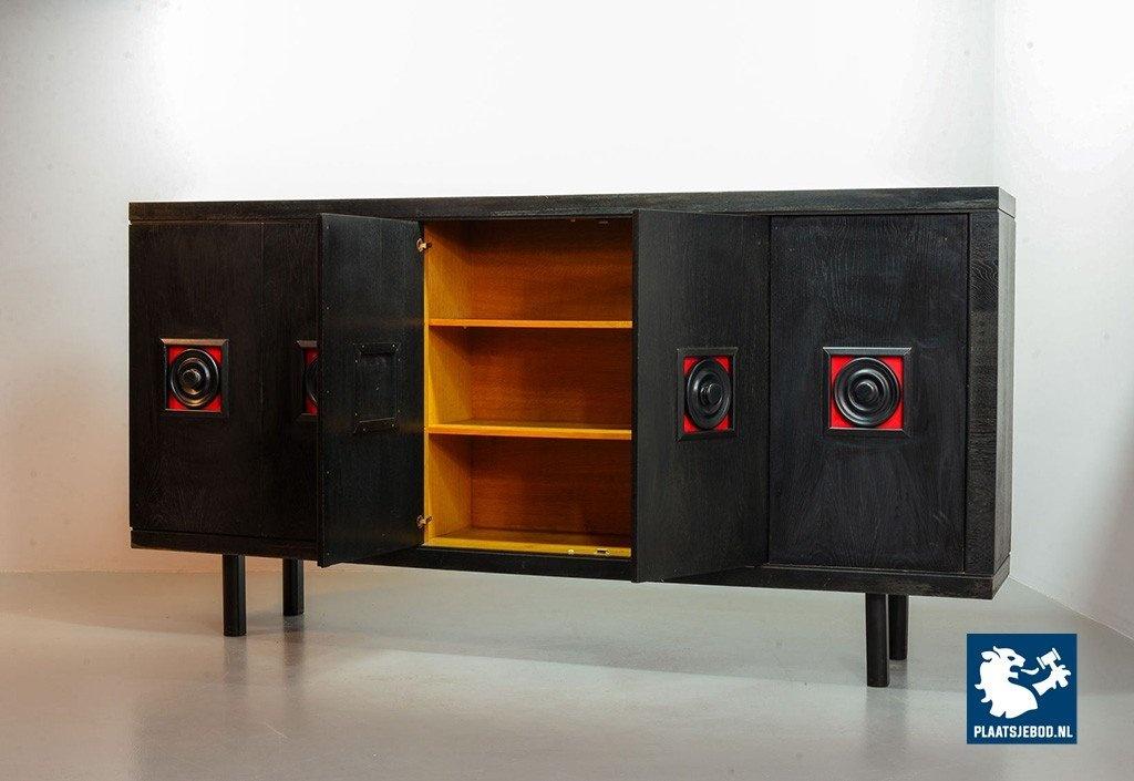 Lot 305-093-ST026-B4: Large Mid-Century De Coene Style Brutalist Black Highboard with Red Accents. Belgium, 1960s
