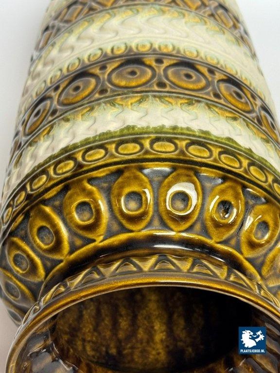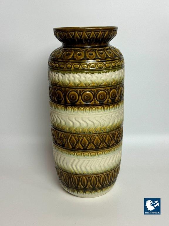 This striking floor-sized vase features a rich moss green glaze combined with warm cream tones and layered geometric relief decoration. The bold horizontal bands and deep texture are characteristic of classic West German pottery from the mid-century period.