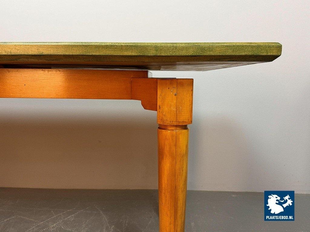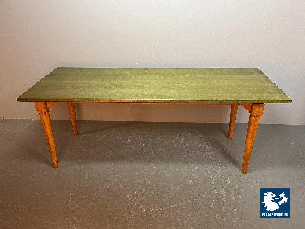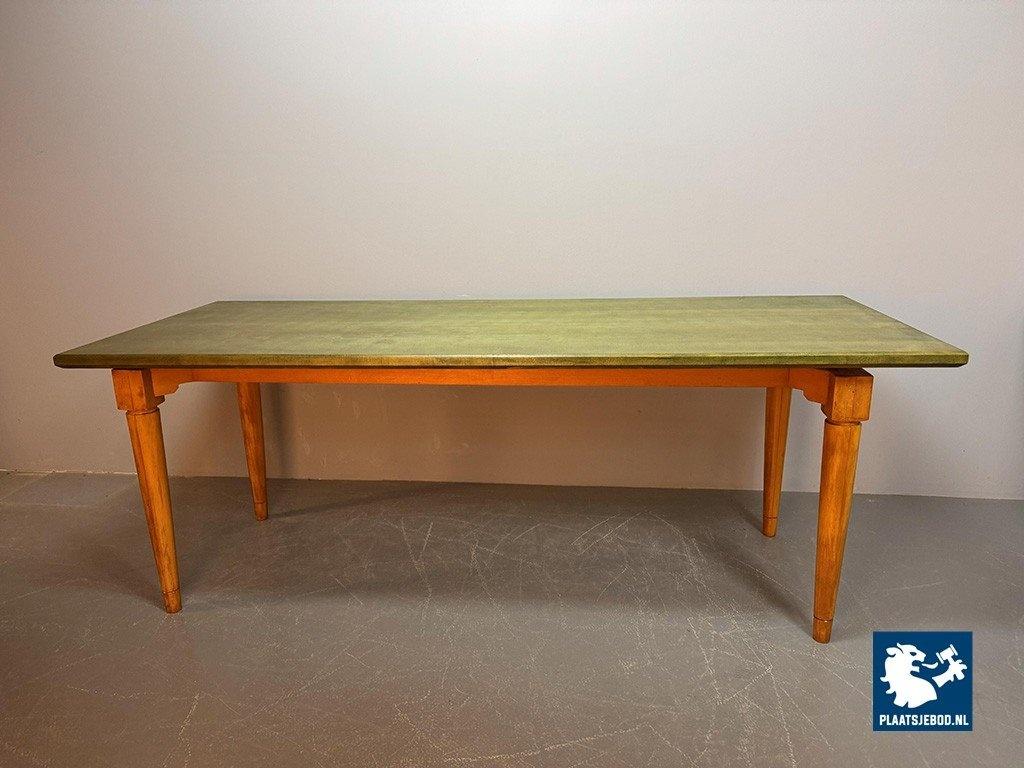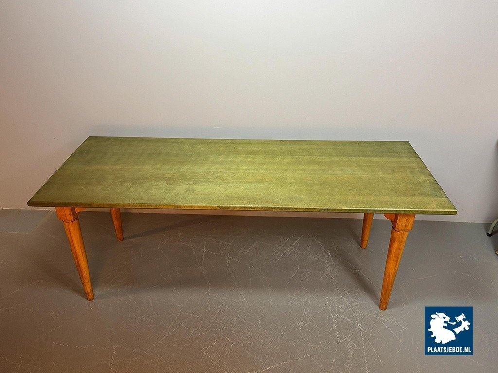 Vintage Beech Dining Table with Soft Green Transparent Stained Top, 1980s. This dining table is featuring natural beech wooden legs and a softly green-stained transparent table top. Simple, functional design with subtle color detail. This generously sized table offers both warmth and understated character, ideal for large dining spaces. Dimensions: Height 76 cm, Width 206 cm, Depth 80 cm