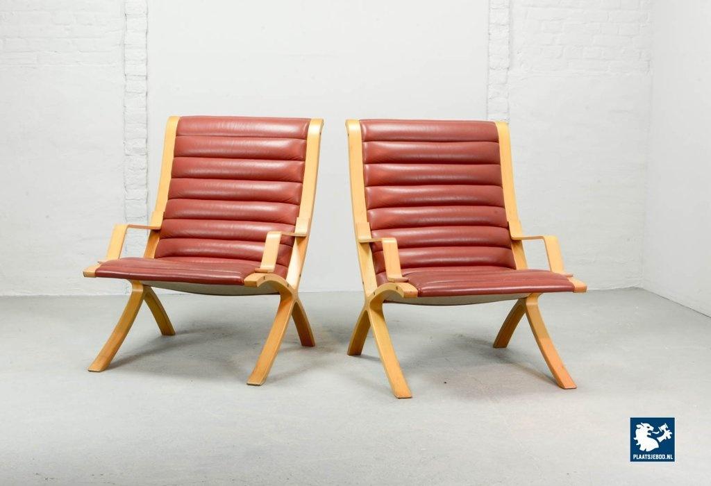 Lot 305-097-CH119-A1: Mid-Century Danish Pair of Padded Red Leather High Back AX Lounge Chairs by Hvidt and Molgaard Nielsen for Fritz Hansen, Denmark 1970s.