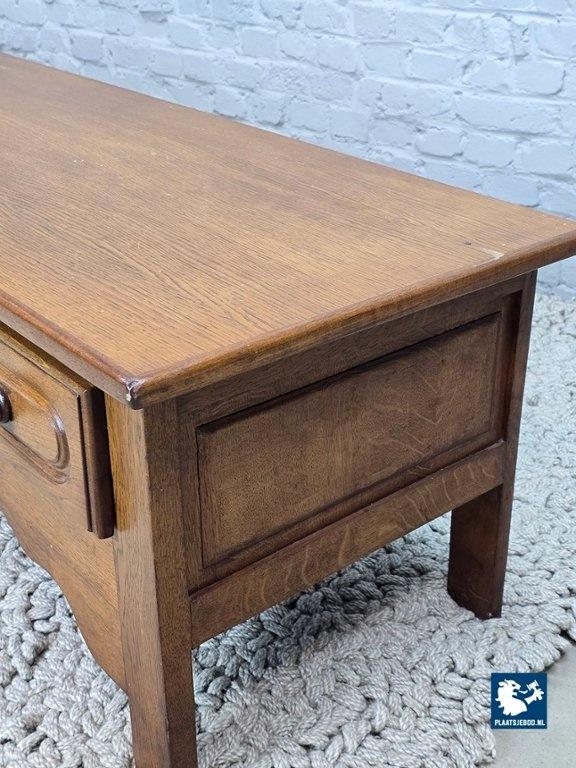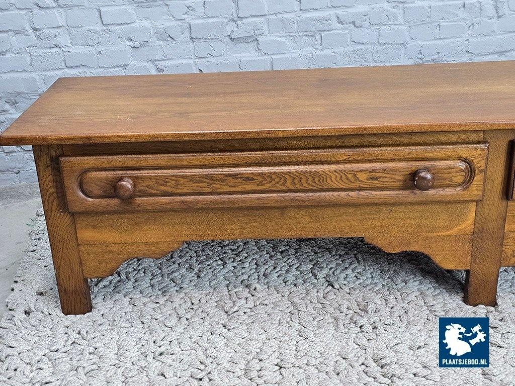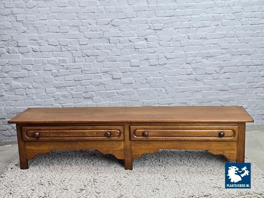 Brutalist low sideboard crafted from high-quality solid oak, dating from the 1960s. The cabinet features two drawers adorned with decorative carved details, emphasizing its sculptural and expressive character. Highly versatile in use, it can function as a storage cabinet, TV unit, or even as a low side bench when styled with cushions. A strong and authentic example of Belgian brutalist furniture design. Dimensions: Height 49 Width 218 Depth 50 cm.
