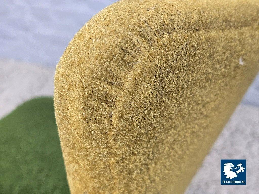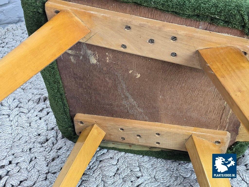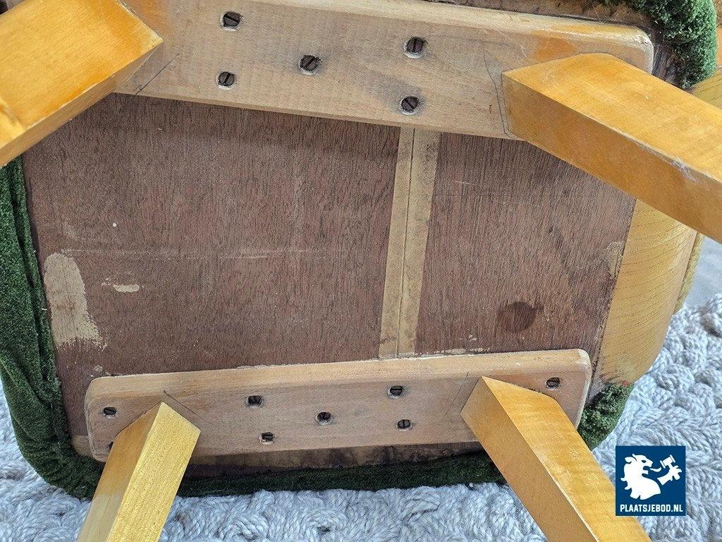 wooden legs and original warm yellow and green bouclé