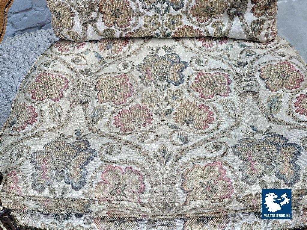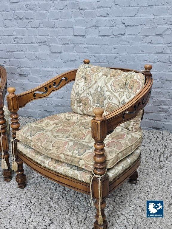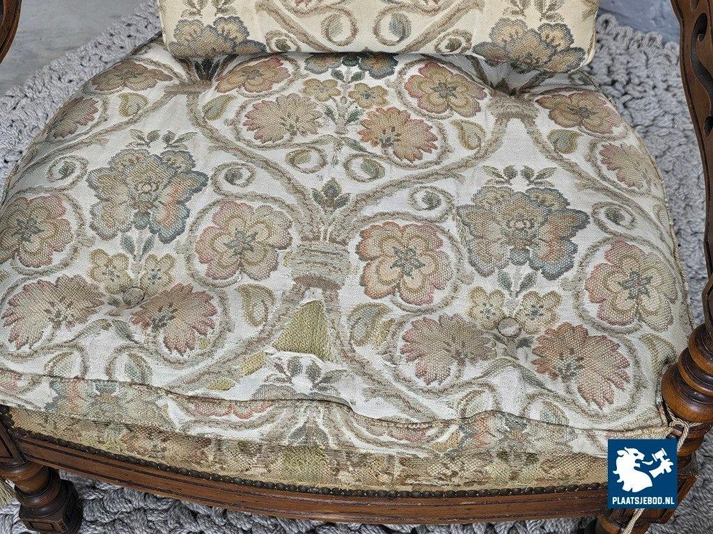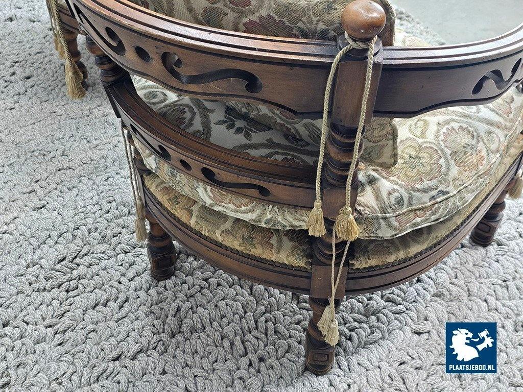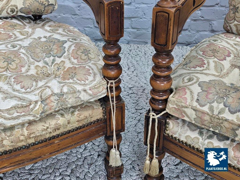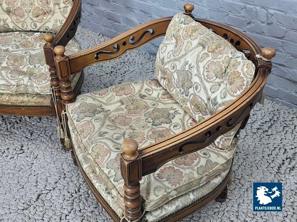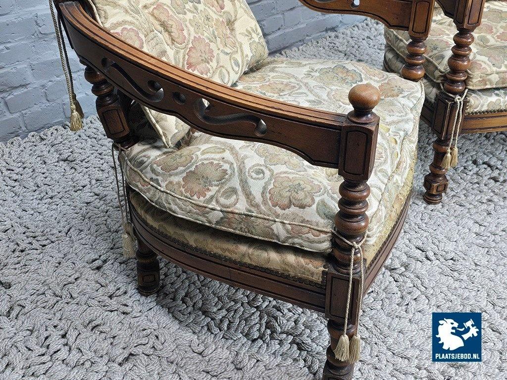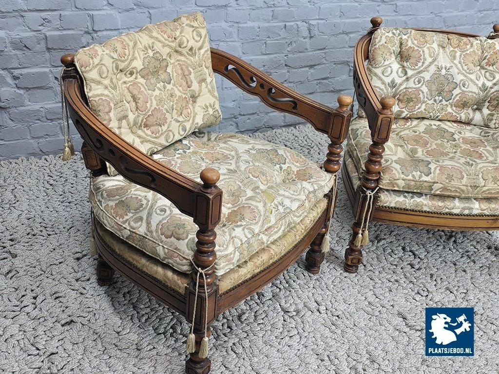 Set of two lounge chairs from the Giorgetti Gallery Collection, designed in 1975 by Umberto Asnago and Ambrogio Pozzi. These chairs are distinguished by their hand-carved wooden frames, featuring elegant scroll-like details seamlessly integrated into the armrests and backrests. Upholstered in richly textured Gobelin fabric, the chairs combine artisanal craftsmanship with refined Italian design. The set is in good vintage condition, showing minor wear consistent with age and use. Highly suitable for sophisticated interiors such as hotel lobbies or classic living spaces. Dimensions: Height 68 Width 64,5 Depth 60 cm.