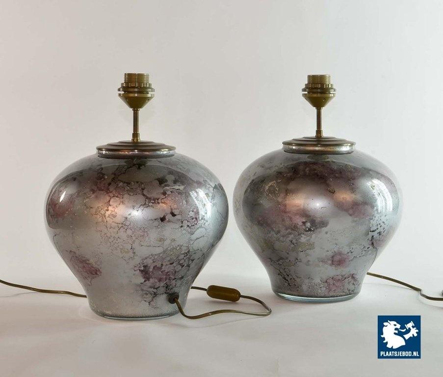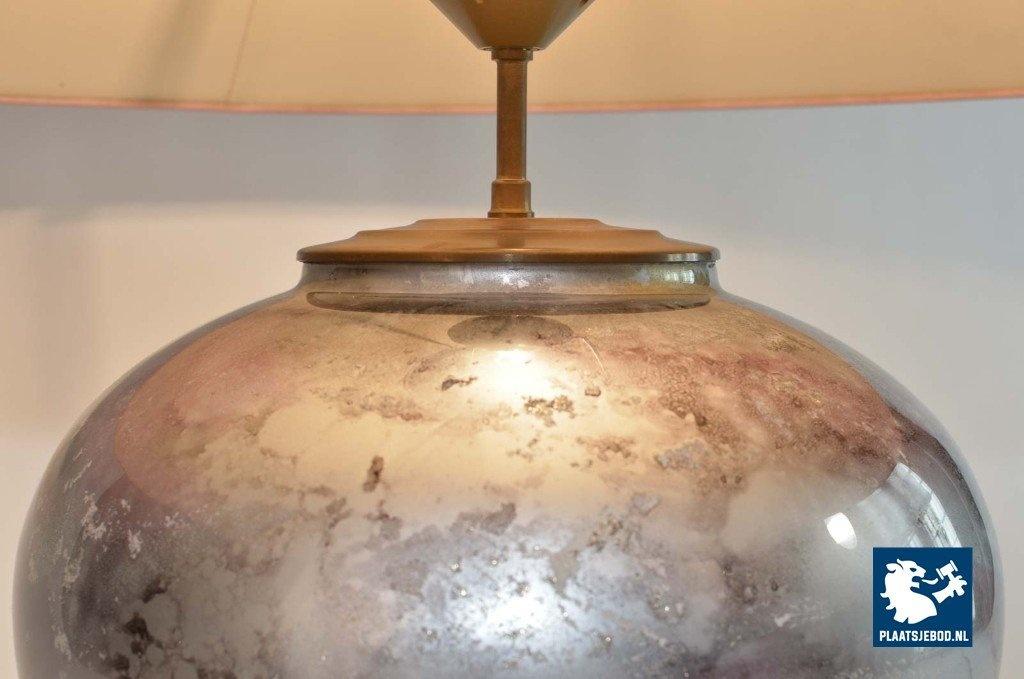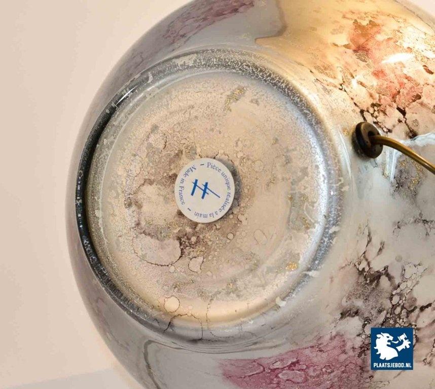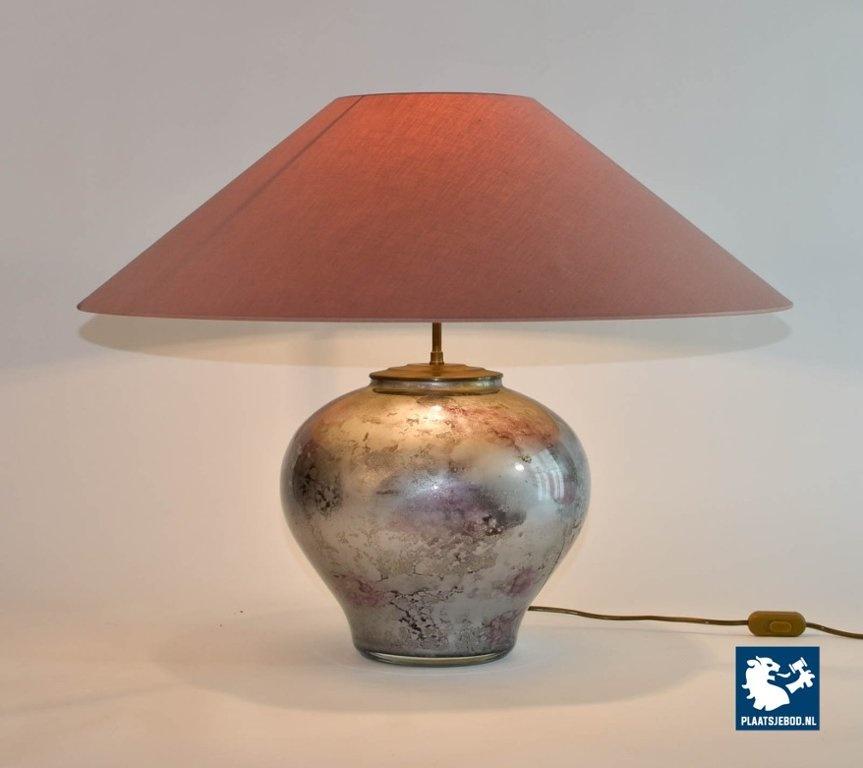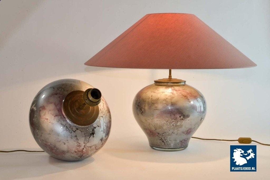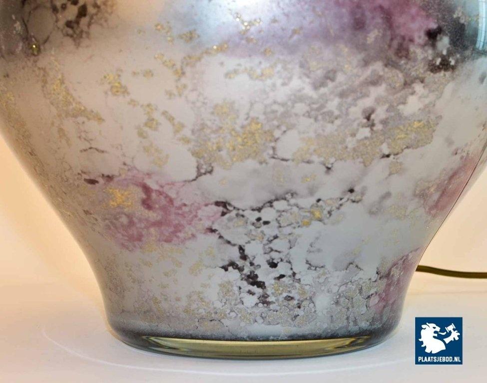 This table lamp is handmade by Laque Line in France in the 1970s. The marbled art crystal glass foot shows nice color glows of silver, white, lilac, anthracite and gold dust. It is labeled by Lacque Line, France and is in an excellent condition. The pedestal is perfect match with the lilac colored lampshades but can be also easily combined with other shapes and colors. The lampshade is in good condition although they show some small stains. The price is for one lamp. Dimensions: Height: 38 cm Diameter 70 cm.