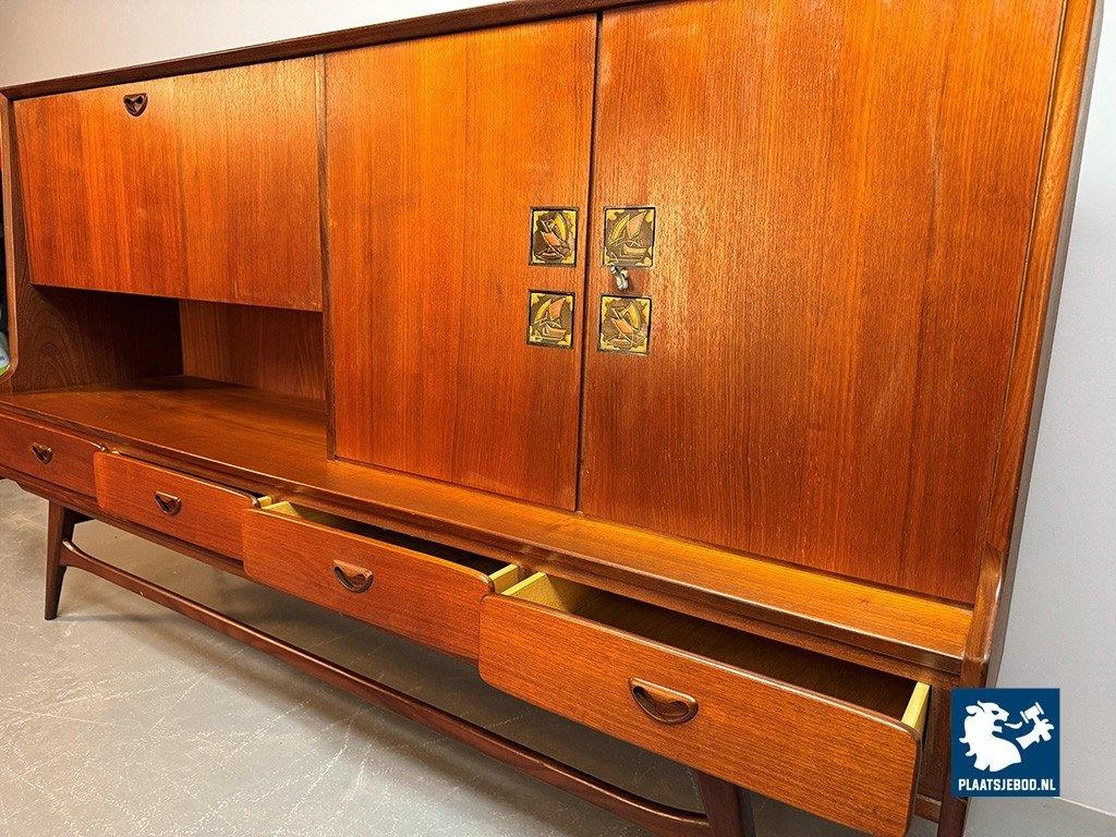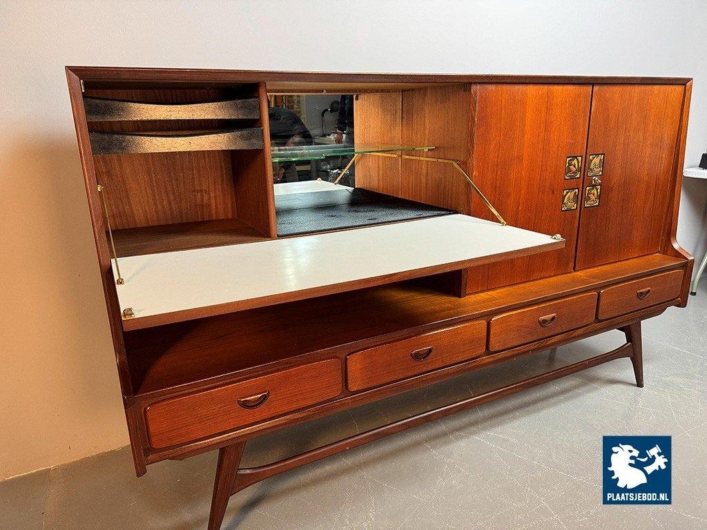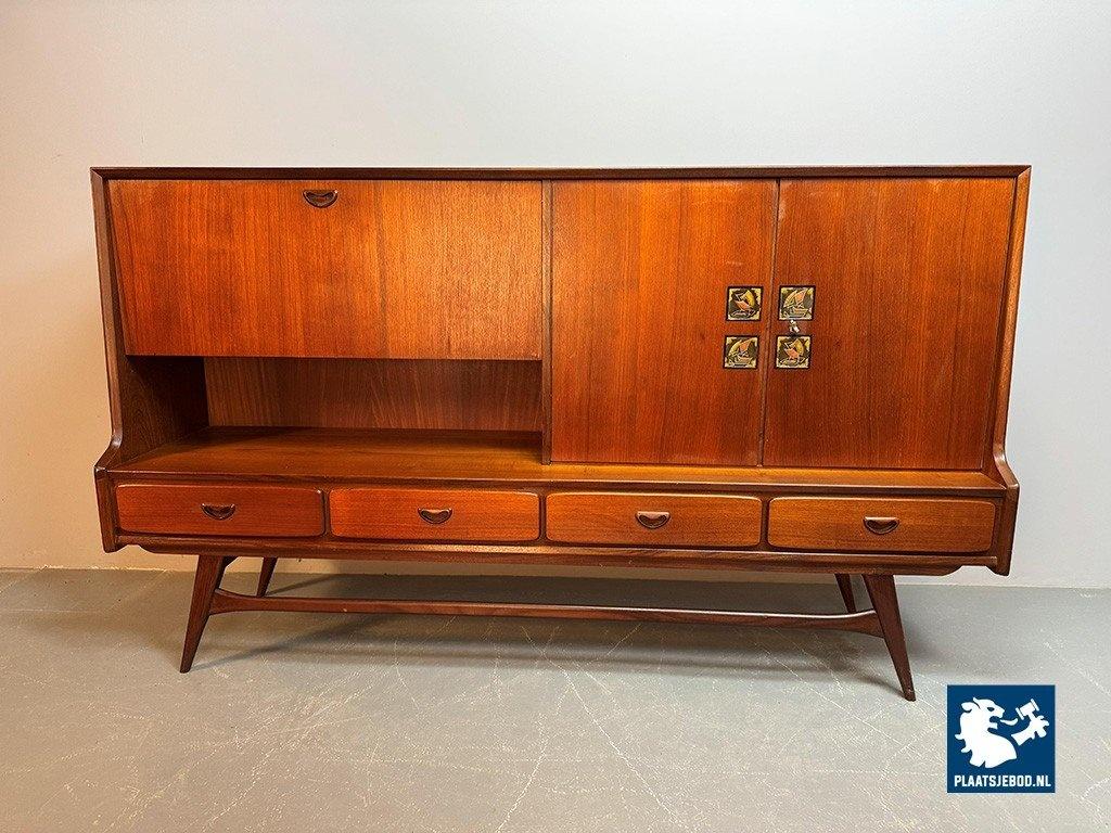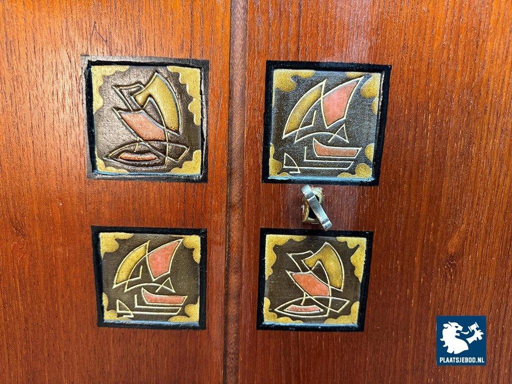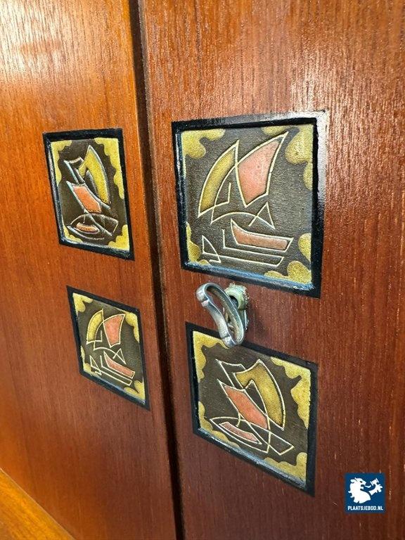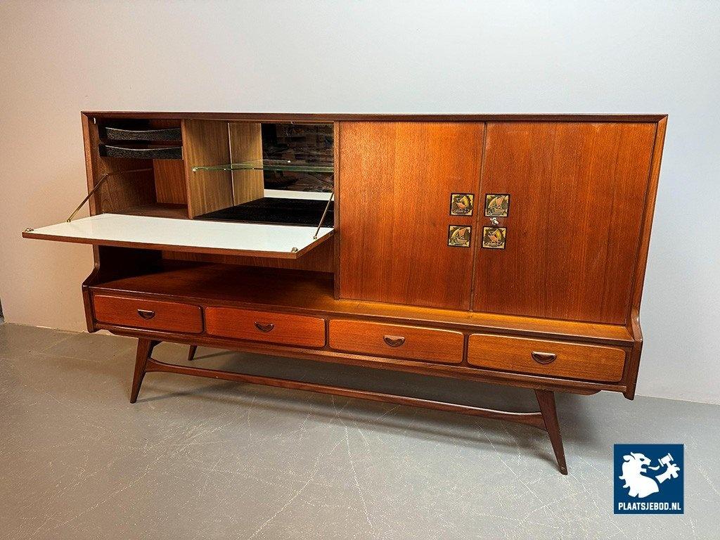 High-quality teak sideboard designed by Louis van Teeffelen for Wébé, featuring original ceramic tiles by renowned Dutch artist Jaap Ravelli. Produced in the 1960s, this piece combines warm teak wood and teak veneer with decorative sailing ship tiles. The sideboard offers ample storage with four drawers, two large doors and a drop-front compartment. Recently re-oiled, restoring the wood’s original warm tone. A distinctive Dutch interpretation of mid-century modern design. Dimensions: Height 118 cm, Width 200 cm, Depth 50 cm
