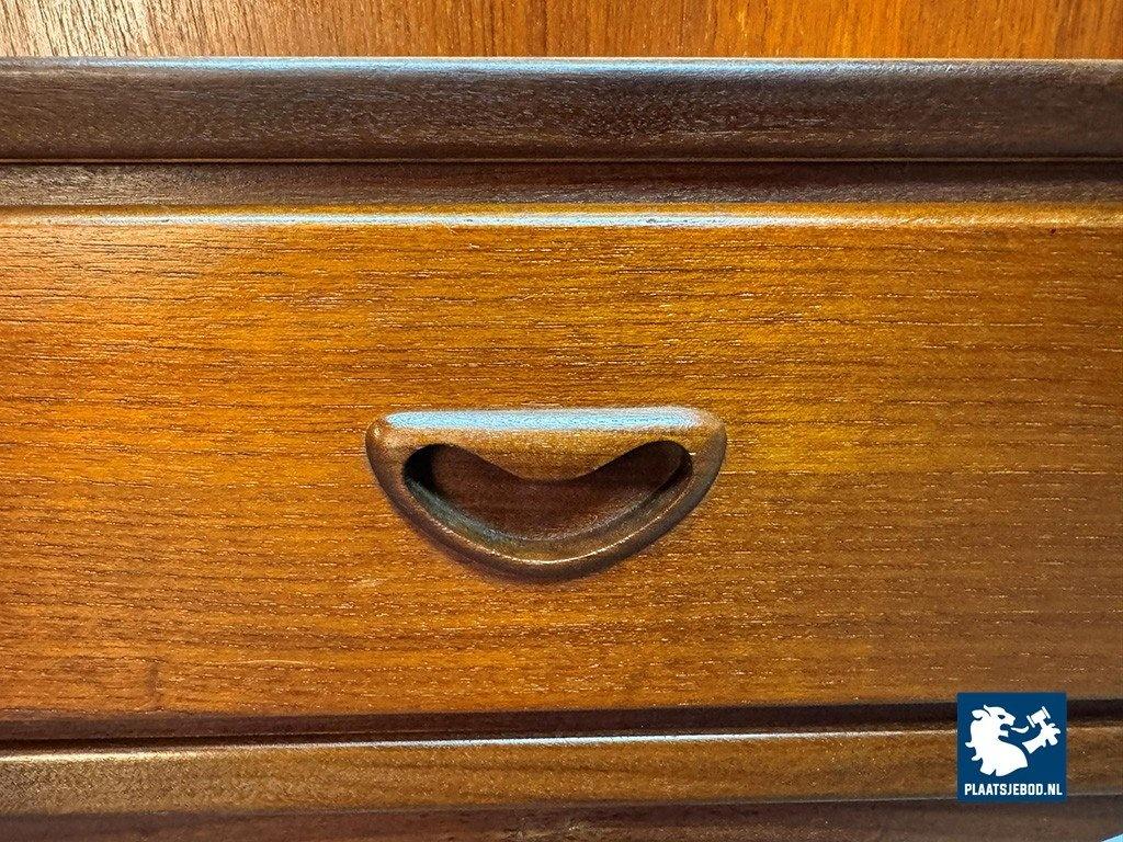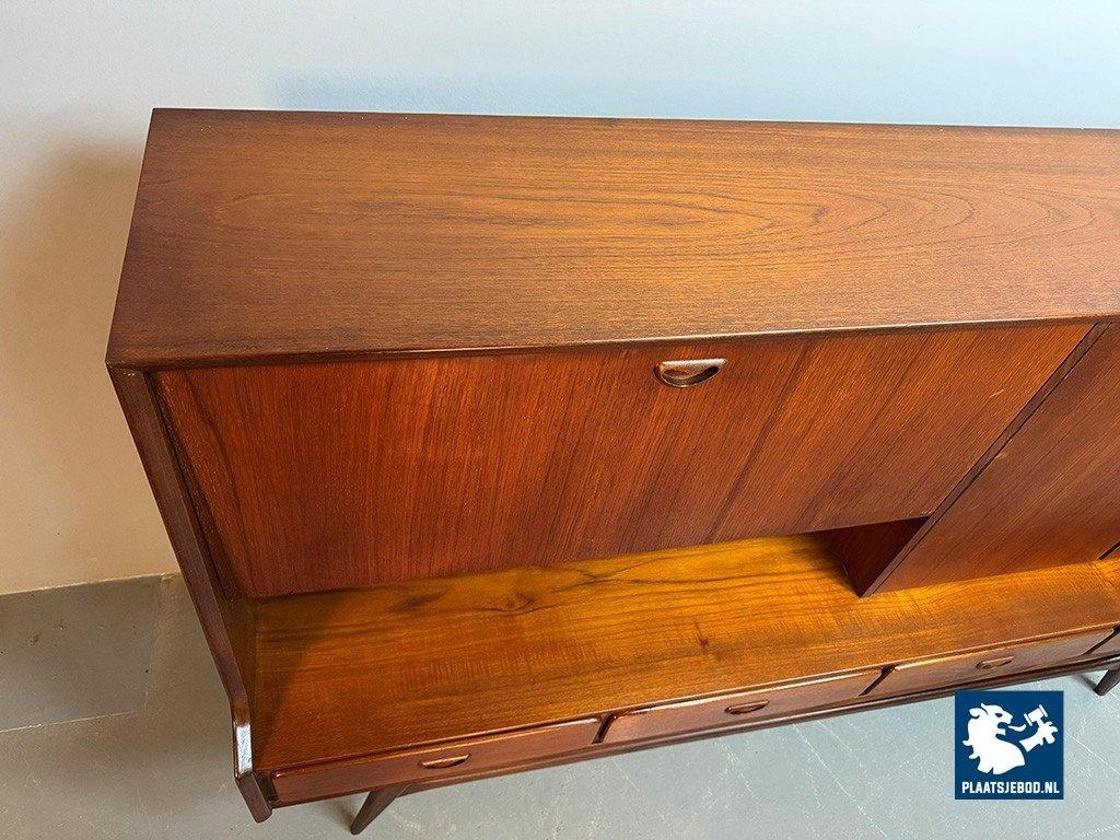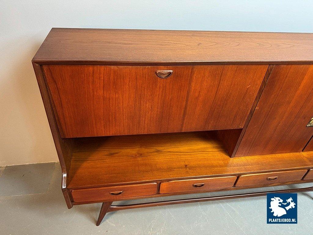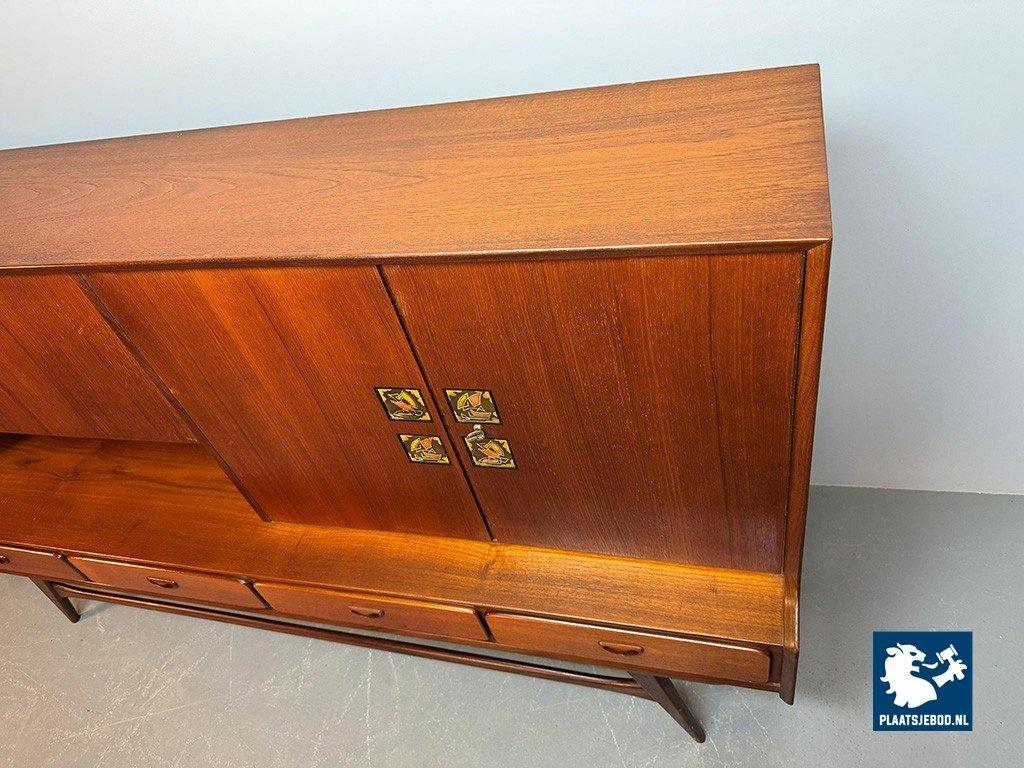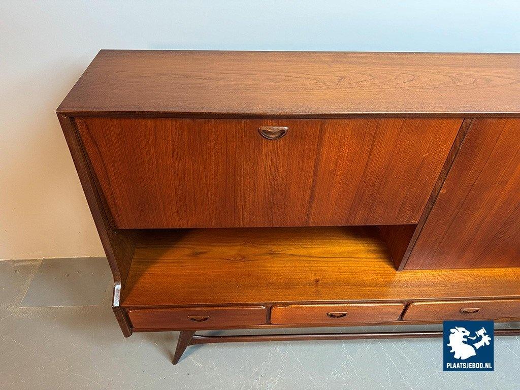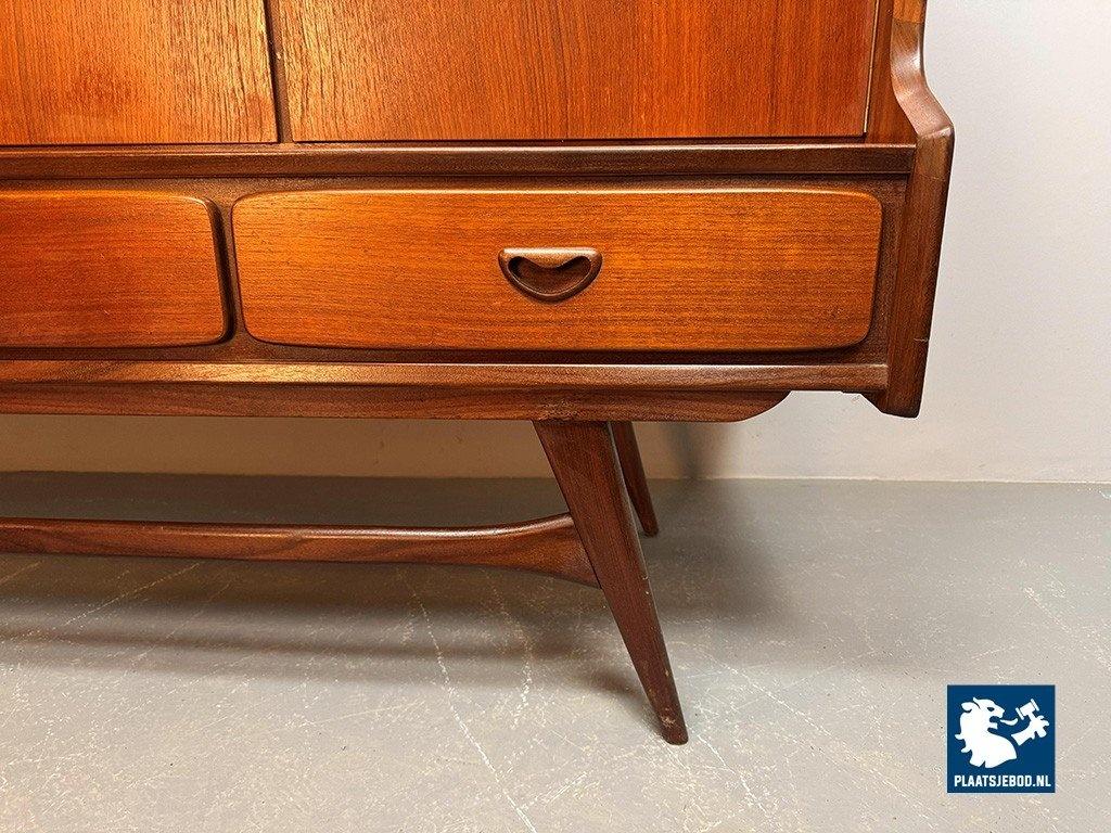 High-quality teak sideboard designed by Louis van Teeffelen for Wébé, featuring original ceramic tiles by renowned Dutch artist Jaap Ravelli. Produced in the 1960s, this piece combines warm teak wood and teak veneer with decorative sailing ship tiles. The sideboard offers ample storage with four drawers, two large doors and a drop-front compartment. Recently re-oiled, restoring the wood’s original warm tone. A distinctive Dutch interpretation of mid-century modern design. Dimensions: Height 118 cm, Width 200 cm, Depth 50 cm