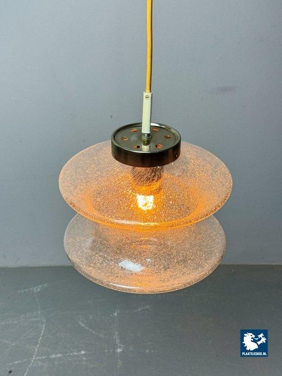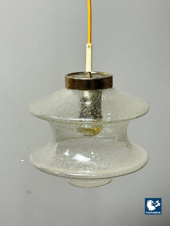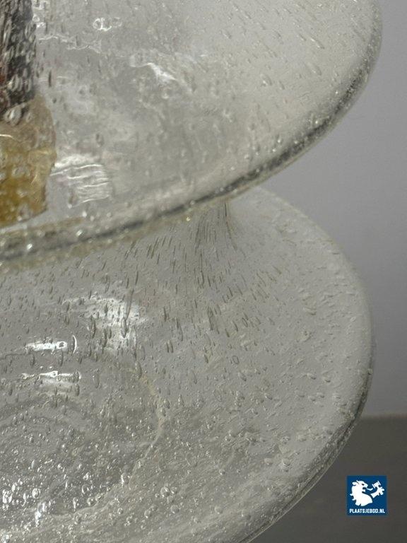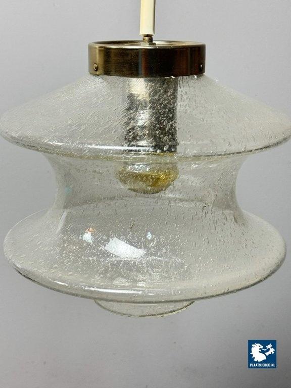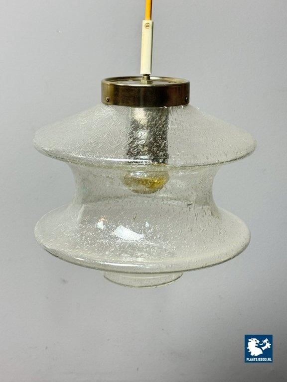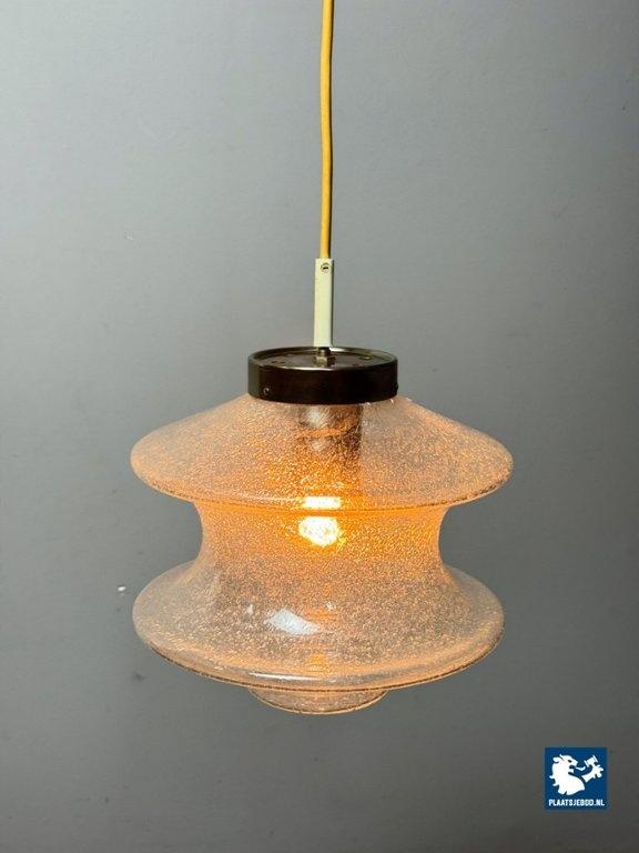 An elegant and atmospheric vintage glass pendant lamp produced by Raak, identified as the Meerpaal model B-1048. The lamp features a beautifully shaped transparent glass shade with a subtle bubble and textured structure, creating a warm, diffused light effect when illuminated. The sculptural glass form is suspended from a restrained metal cap, a hallmark of Raak’s refined mid-century lighting designs. This model is representative of Raak’s experimental approach to glass in the 1960s, balancing functional clarity with strong visual presence. The light effect is soft and ambient, making it ideal for dining areas, hallways or living spaces. The lamp is completely original, has been tested and is fully functional. As with all vintage items or lighting, this piece may show light signs of use, which add to its authentic character. Dimensions: Height: 25 cm, Diameter: 28 cm